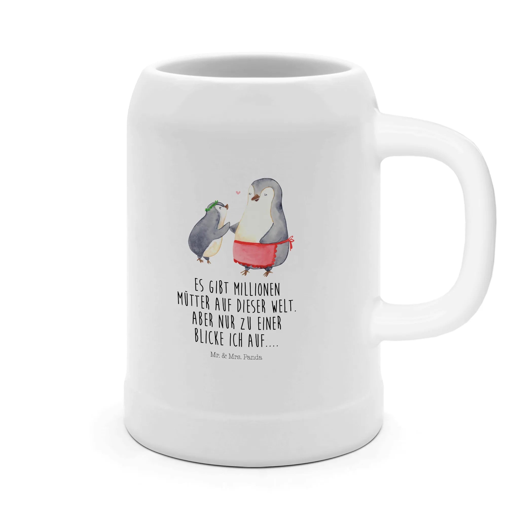 Ein Bierkrug von Mr. & Mrs. Panda, liebevoll gestaltet mit dem Motiv Pinguin mit Kind, ist perfekt für jeden Anlass, der mit Familie und herzlichen Momenten verbunden ist. Dieser rustikale Steingutkrug hält 500 ml Deines Lieblingsbieres bereit und bringt einen Hauch von Freude in jede Feierlichkeit. Der größere Pinguin in seiner roten Schürze und der kleine Pinguin mit dem grünen Kranz auf dem Kopf unterstreichen das herzliche Band zwischen Mutter und Kind.