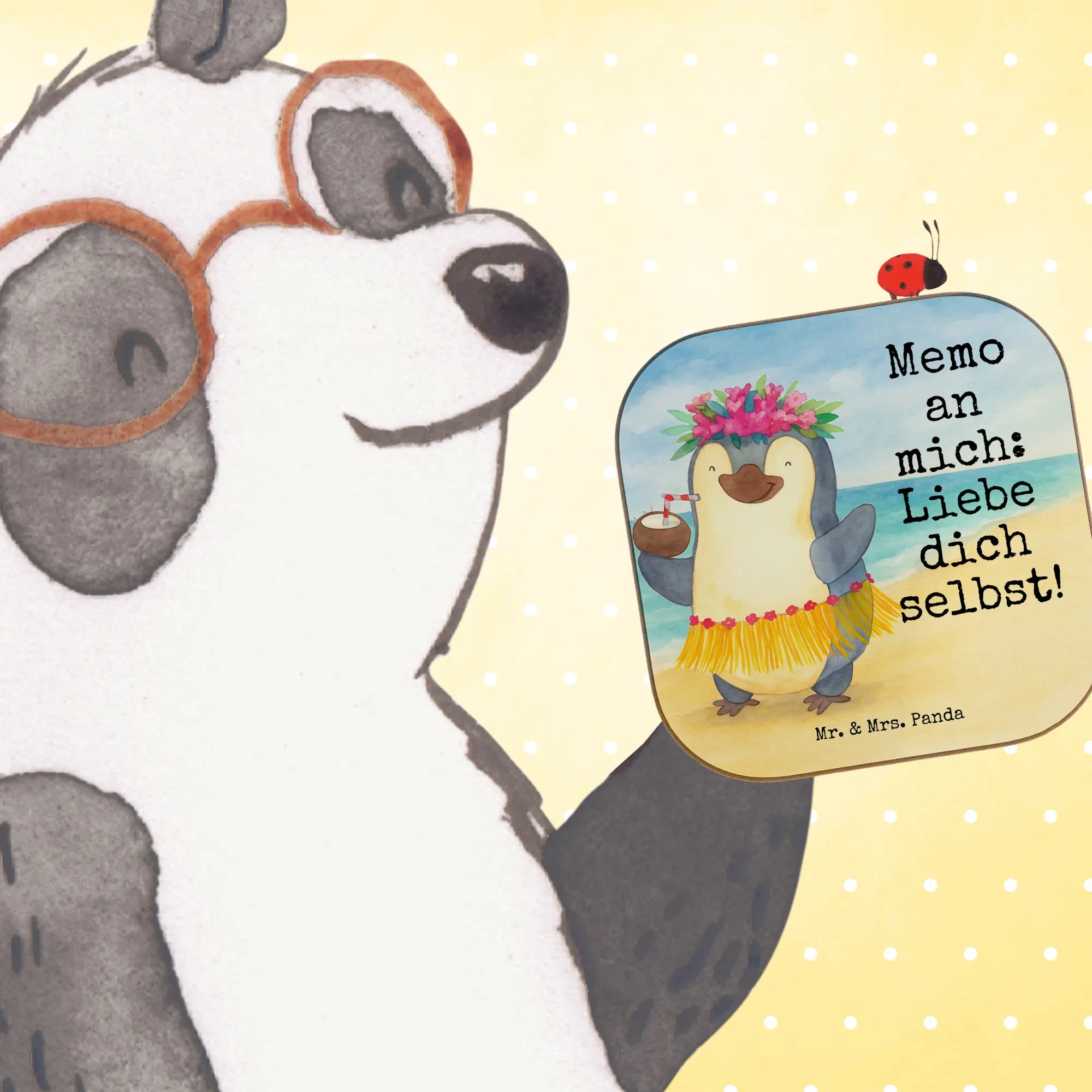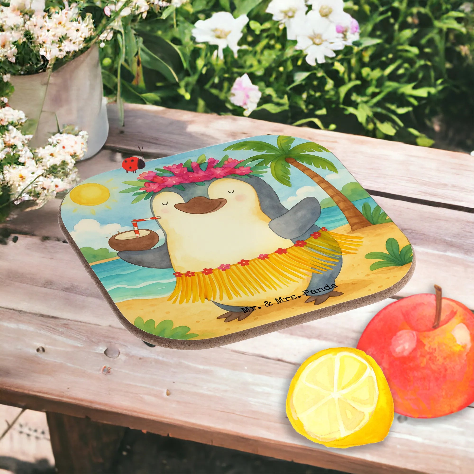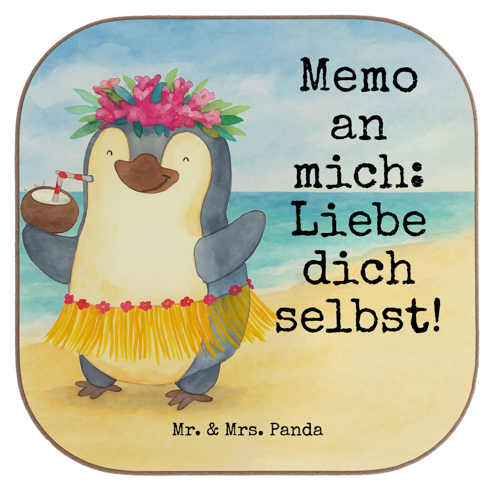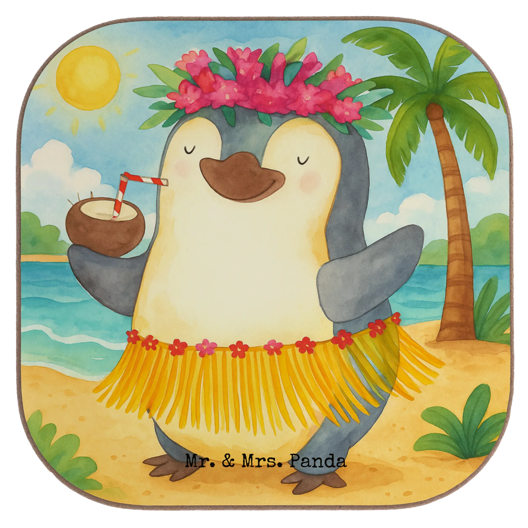 Ein wundervoller Untersetzer von Mr. & Mrs. Panda: Pinguin Kokosnuss. Dieses fröhliche Motiv bringt Sommer, Aloha und gute Laune auf deinen Tisch. Ein niedlicher Pinguin tanzt in der Sonne, hält eine Kokosnuss mit Strohhalm und versprüht pure Lebensfreude. Das Motiv ist handgezeichnet und Teil unserer liebevollen Pinguin - Kollektion.