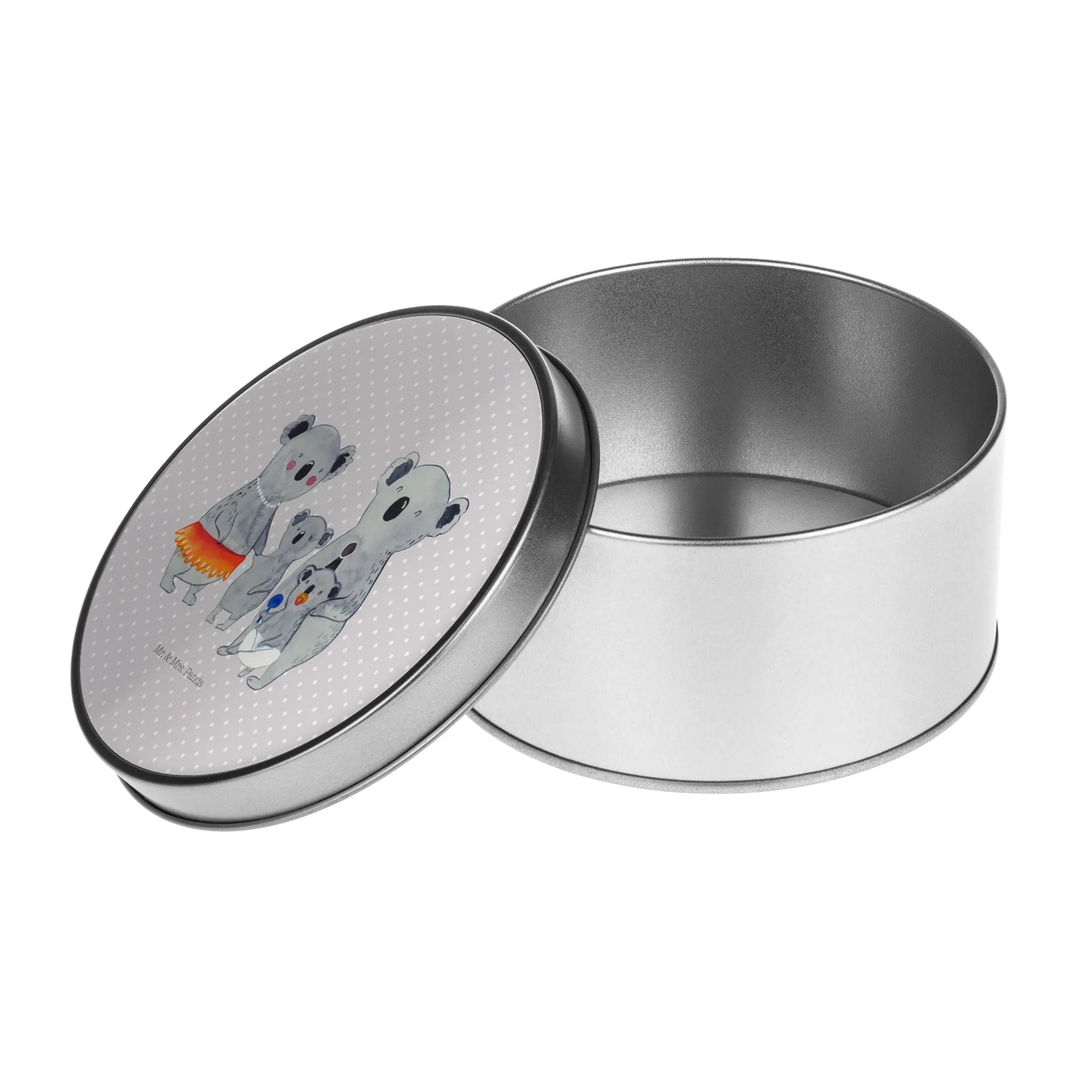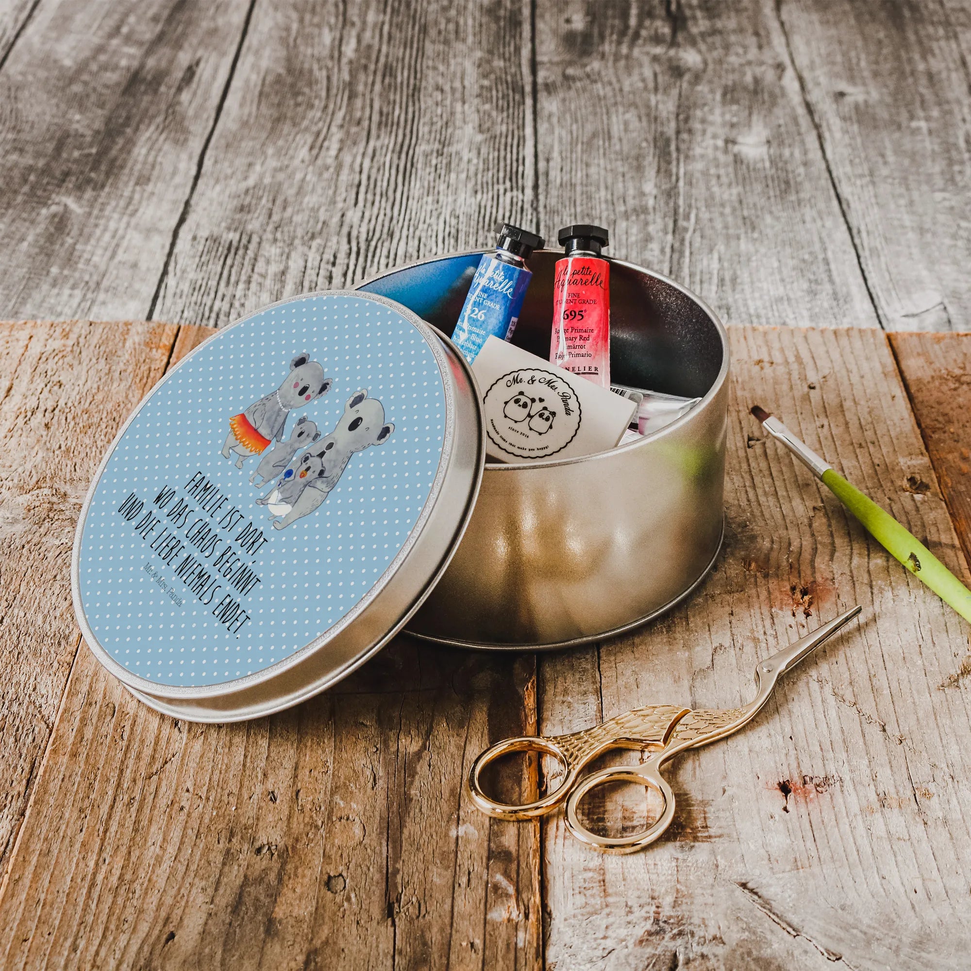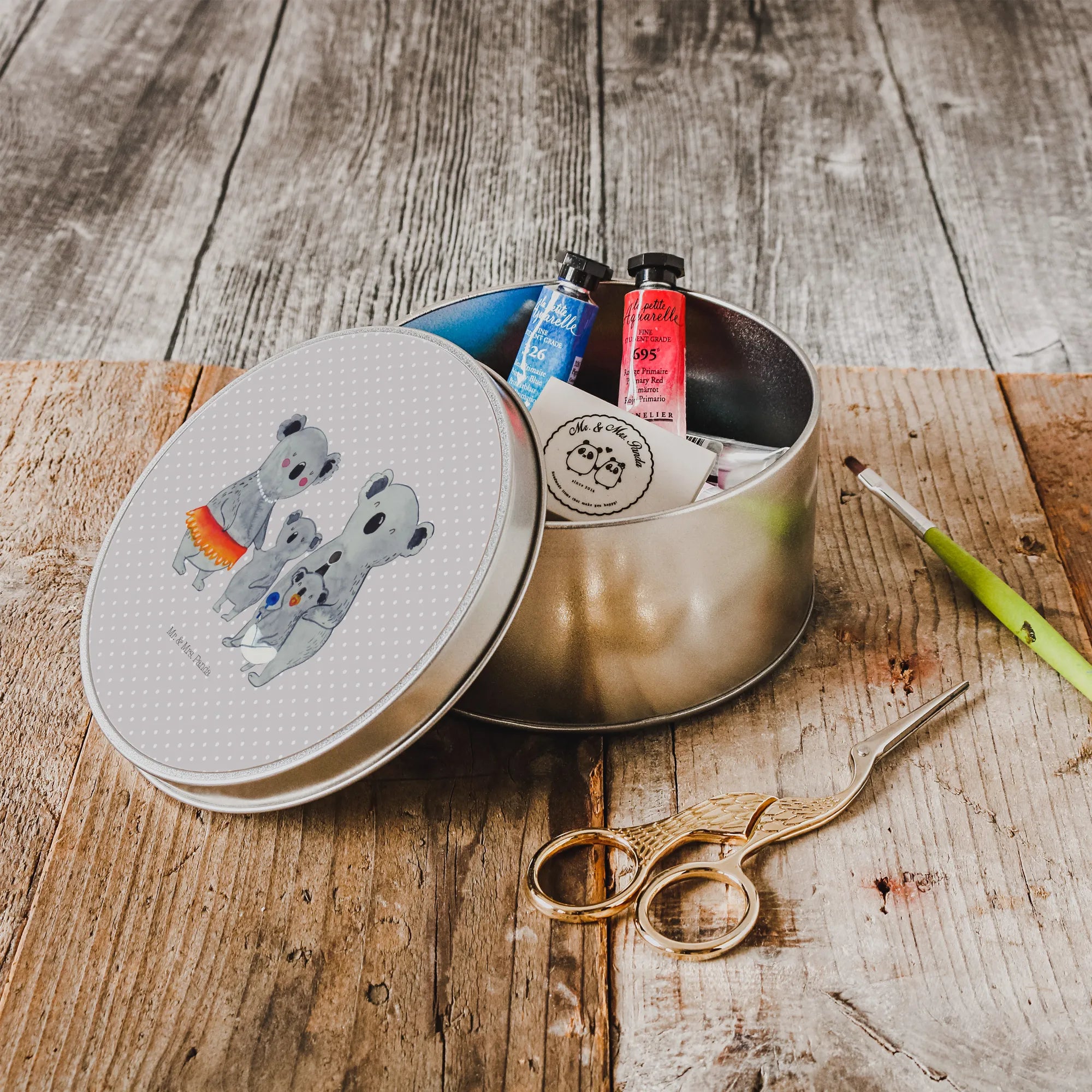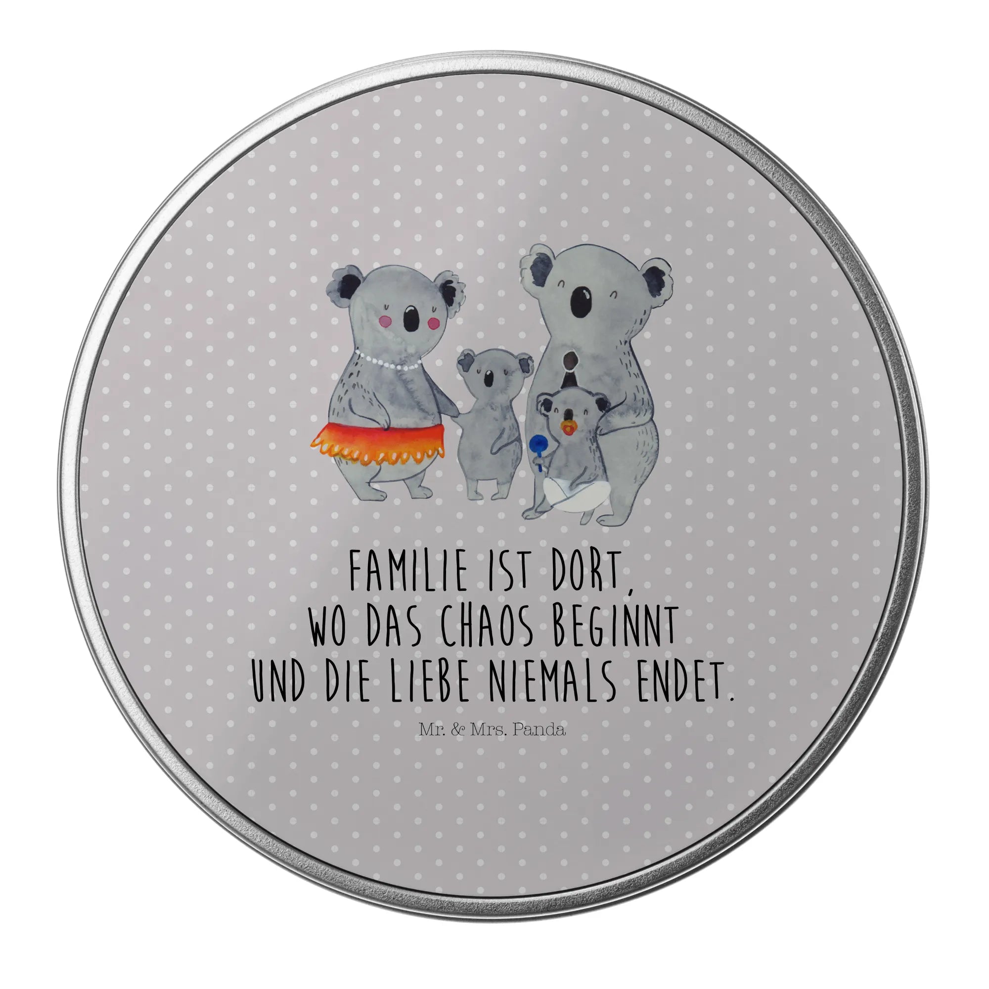 Die runde Blechdose mit dem bezaubernden Motiv "Koala Familie" von Mr. & Mrs. Panda ist das perfekte Geschenk für alle, die Familie und Gemeinsamkeit schätzen.