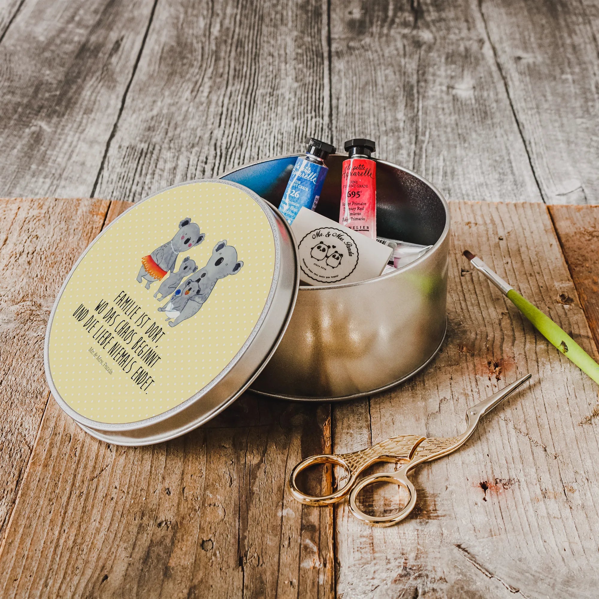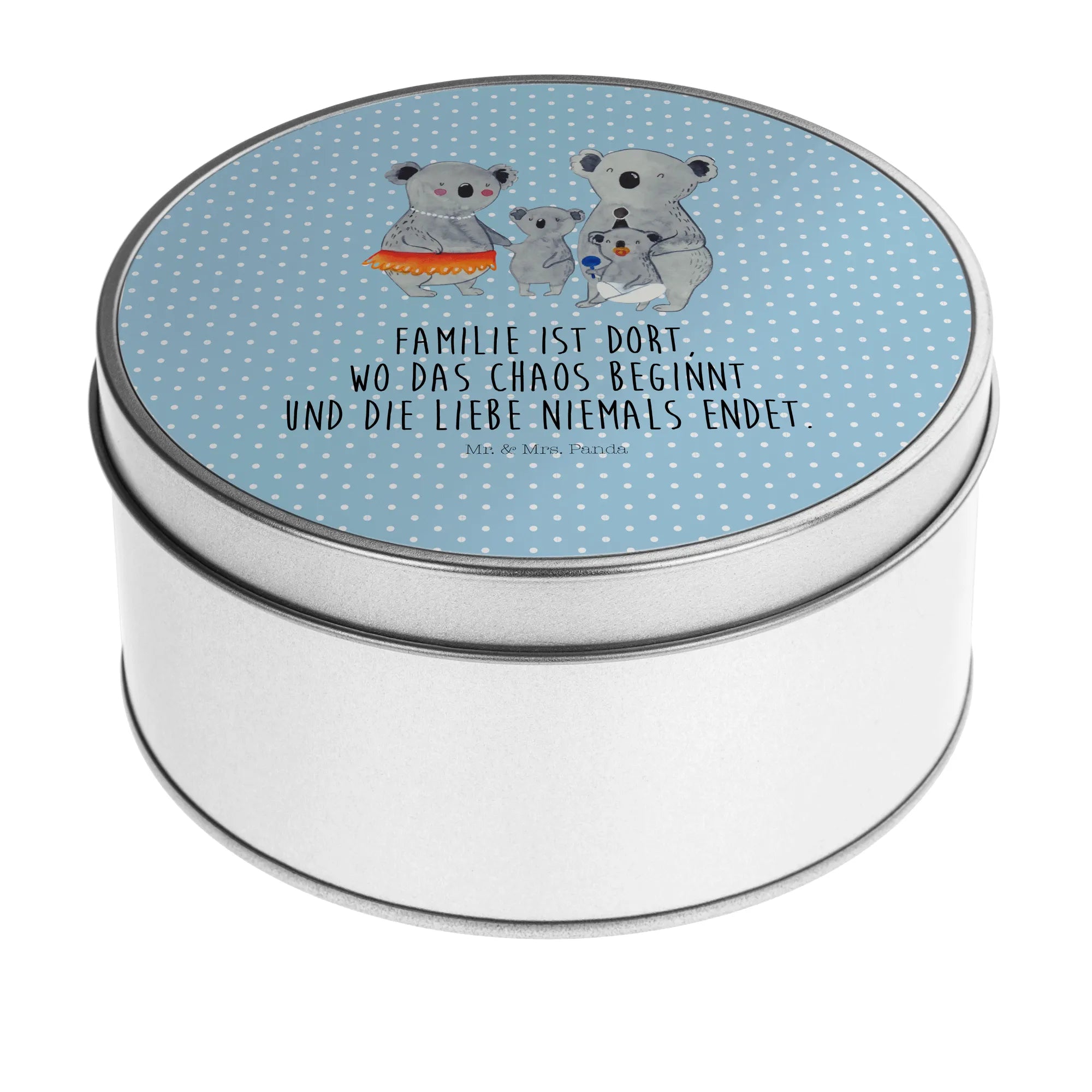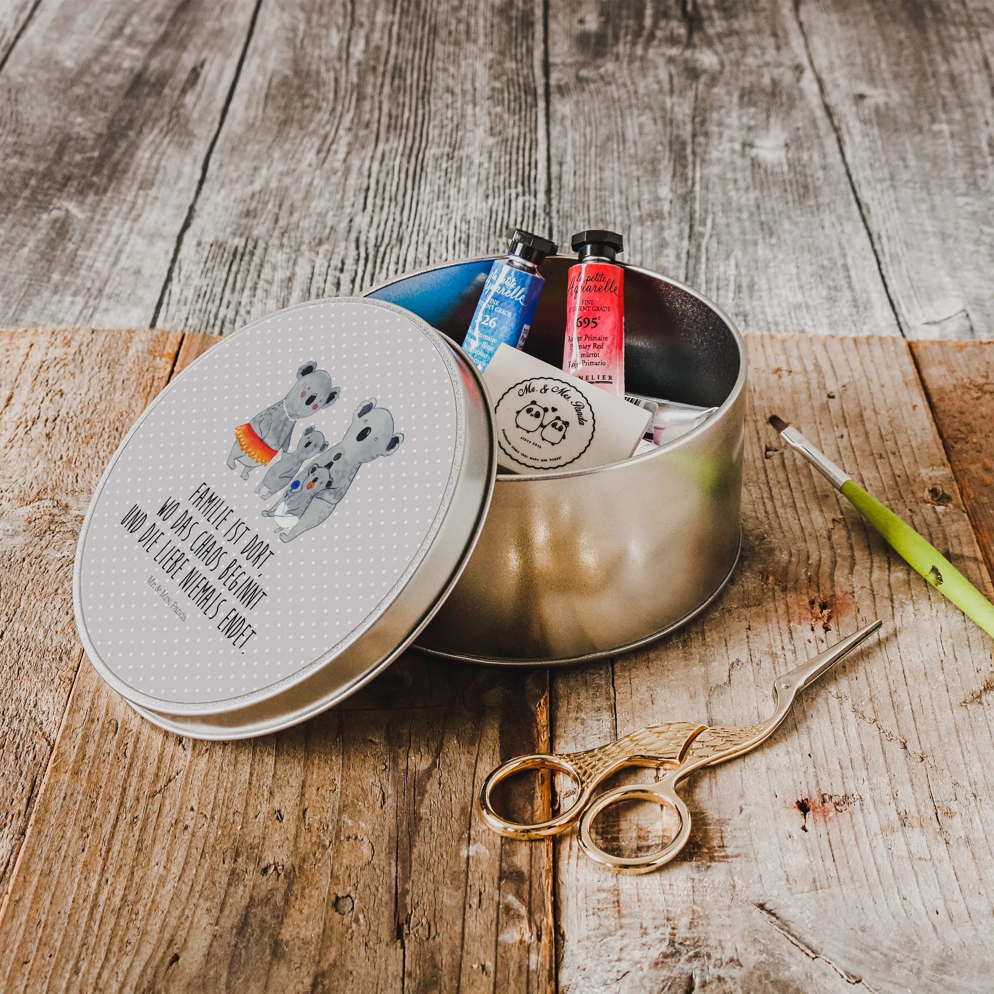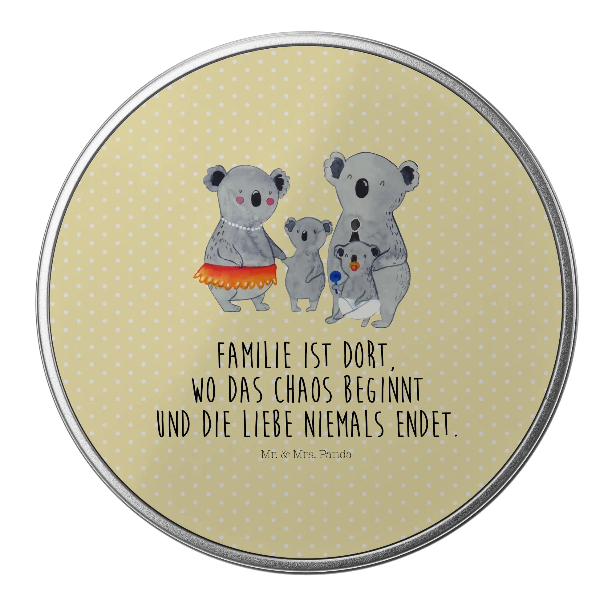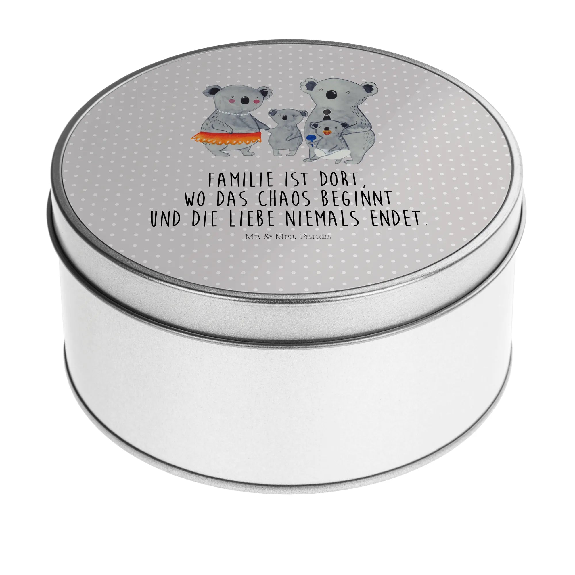 Die runde Blechdose mit dem bezaubernden Motiv "Koala Familie" von Mr. & Mrs. Panda ist das perfekte Geschenk für alle, die Familie und Gemeinsamkeit schätzen.