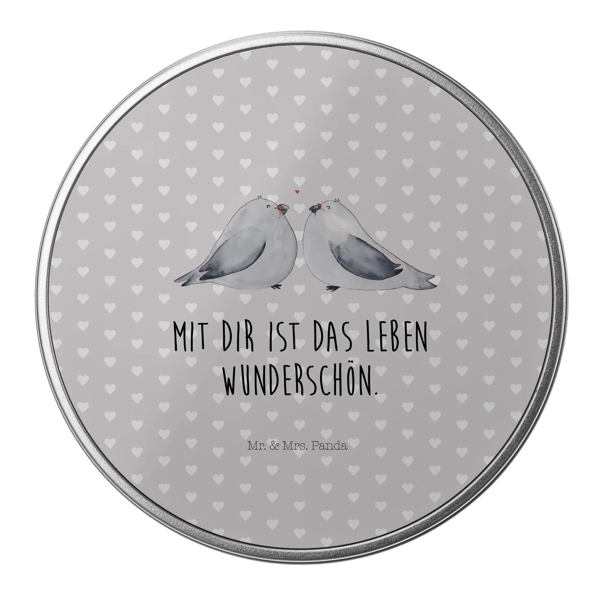 Die wunderschöne runde Blechdose von Mr. & Mrs. Panda ist die perfekte Geschenkidee für all jene, die die Liebe feiern möchten! Inspiriert von den süßen Turteltauben, handelt es sich um ein liebevolles Motiv, das Zuneigung und Verbundenheit ausstrahlt. Auf der Dose siehst du zwei stilisierte Turteltäubchen, die sich sanft zueinander neigen und ein kleines rotes Herz zwischen ihren Schnäbeln präsentieren – ein wunderschönes Symbol für die Liebe!