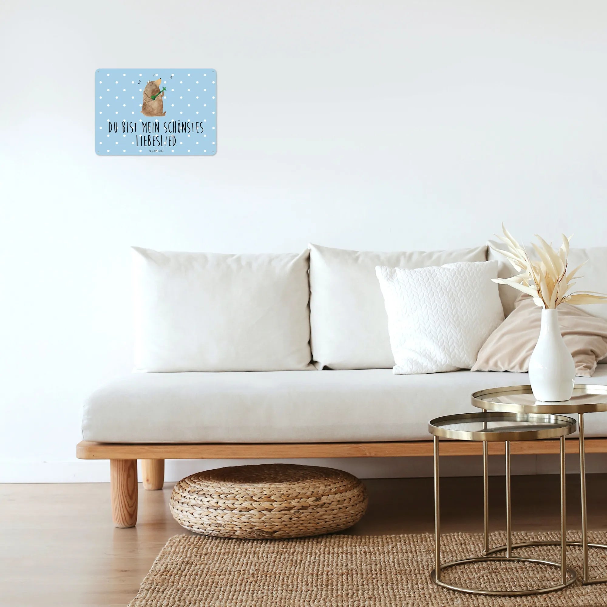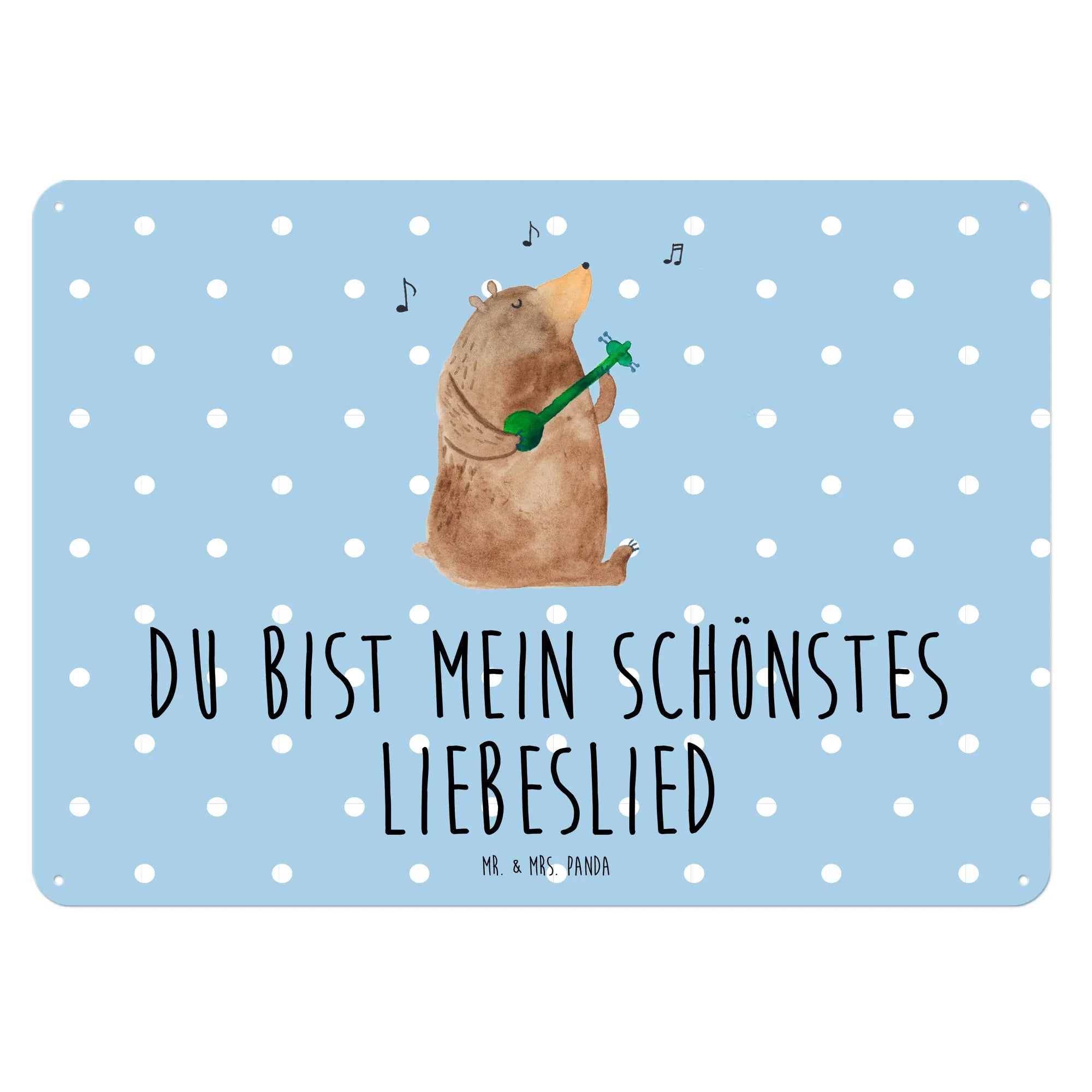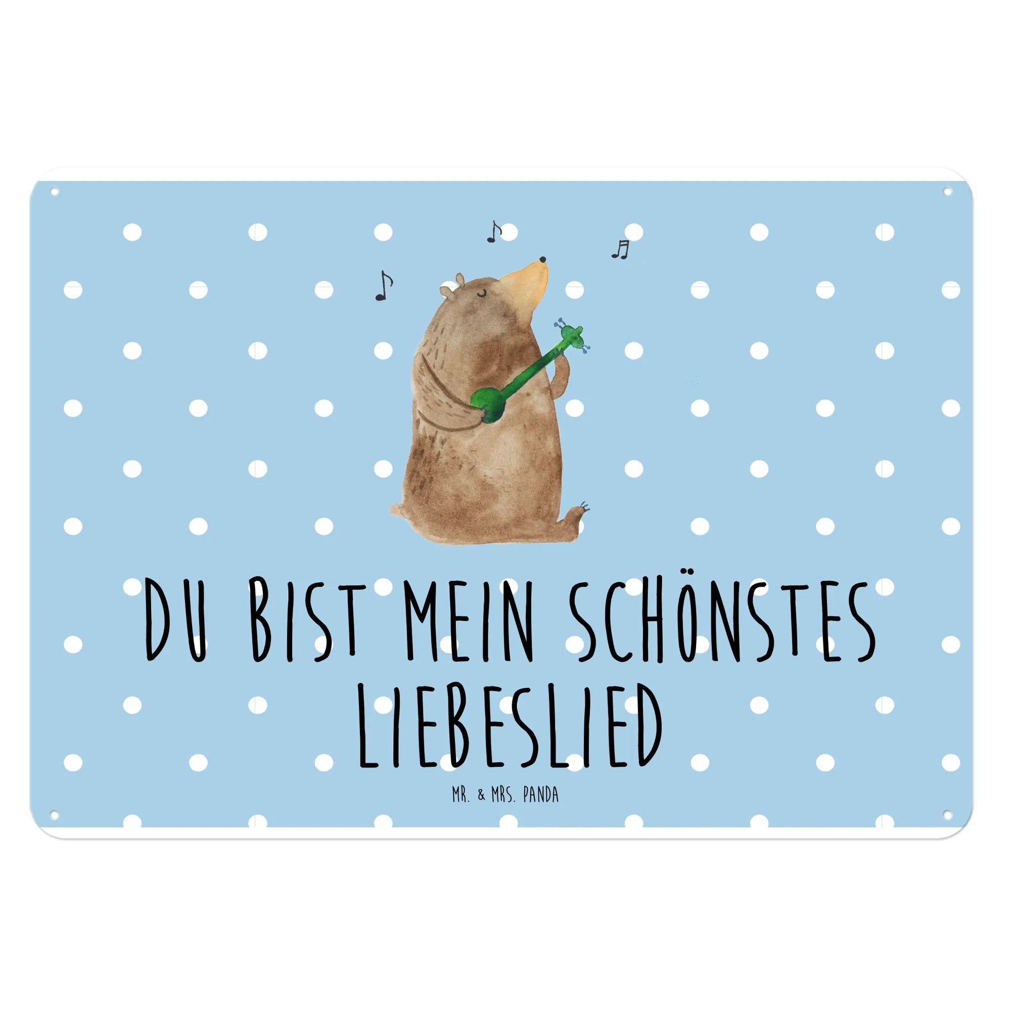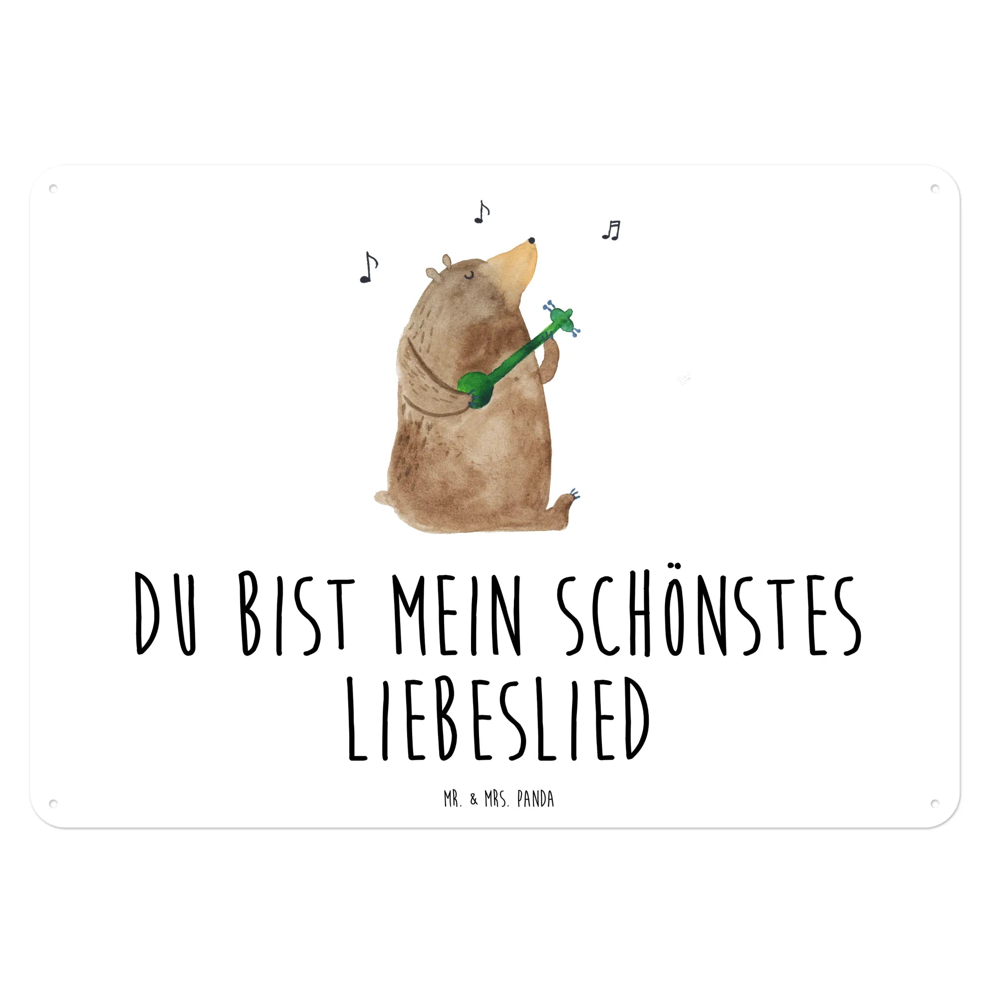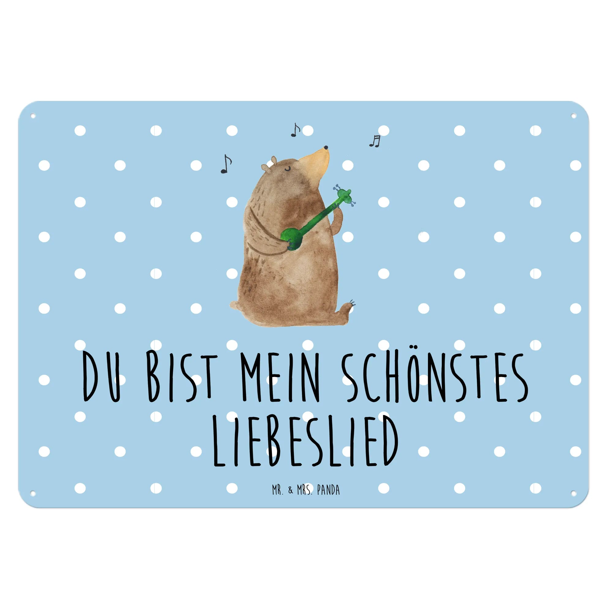 Ein wunderschönes und edles Blechschild von Mr. & Mrs. Panda, das die Herzen höherschlagen lässt! Mit einem liebevoll gestalteten Motiv eines Bären, der ein Lied auf einer Gitarre spielt, ist dieses Schild eine bezaubernde Dekoration für jeden Raum.