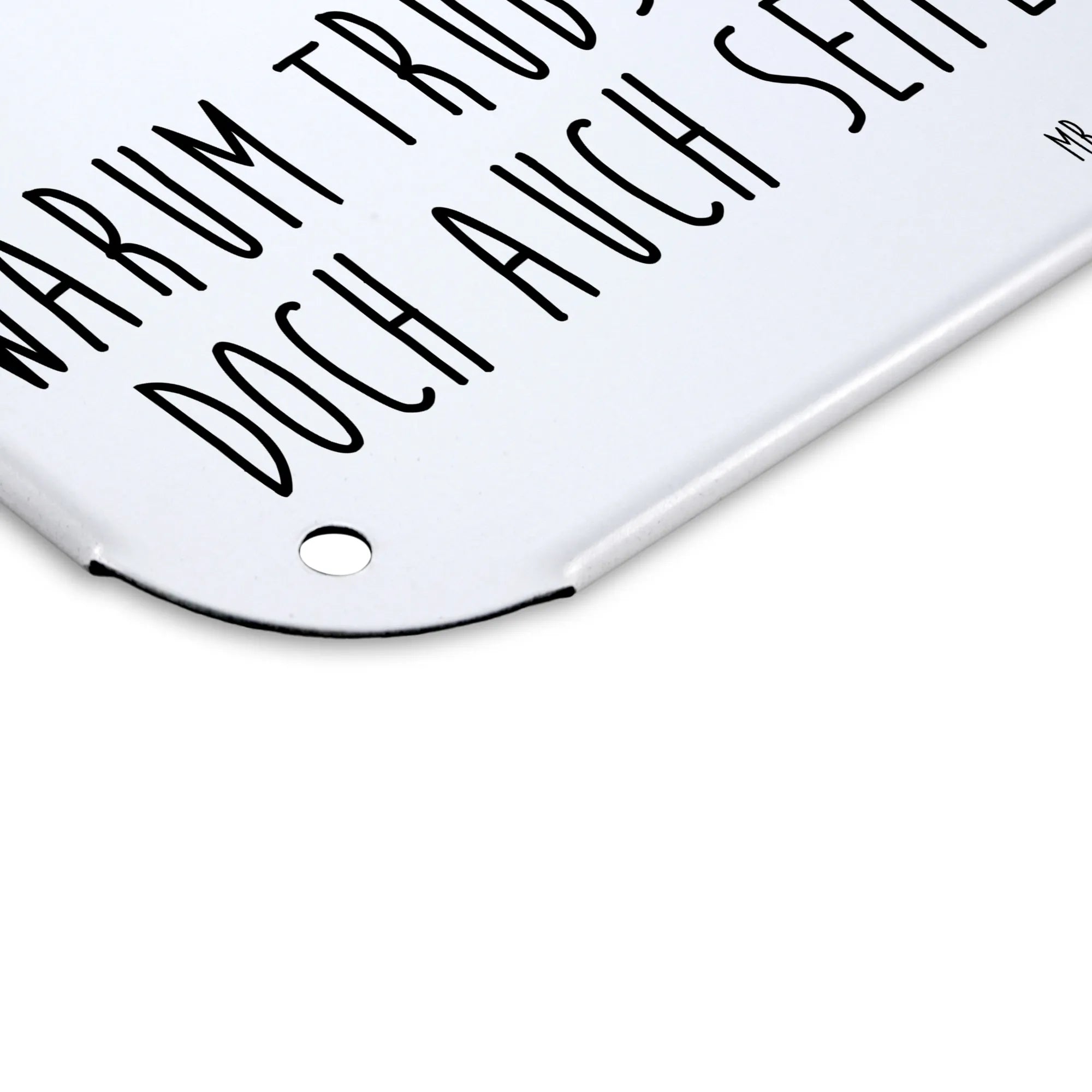 Das perfekte Stück für deine Wohnung: unser hochwertiges Blechschild von Mr. & Mrs. Panda! Mit den eindrucksvollen Maßen 146 mm x 148 mm x 105 mm, strahlt dieses Schild eine besondere Eleganz aus. Das edle Stahlblech ist doppelt beschichtet, sodass es langlebig und resistent gegen Verfärbungen bleibt. Der kreative Druck mit süßen Motiven und griffigen Sprüchen bringt Freude in jeden Raum und eignet sich hervorragend als Geschenkoption. Die seidenmatte Oberfläche wertet nicht nur das Schild selbst auf, sondern macht es auch zu einem zeitlosen Accessoire. Ob an der Wand oder der Tür - die Anbringung ist dank der 4 bereits vorgebohrten Löcher besonders einfach. Kanten und Ecken sind abgerundet und bilden somit ein sicheres Design für dein Zuhause. Dieses Blechschild passt perfekt in jeden Innenraum und lässt sich mühelos mit einem feuchten Tuch reinigen. Verfügbar in verschiedenen Größen, um sich harmonisch in dein Ambiente einzufügen.