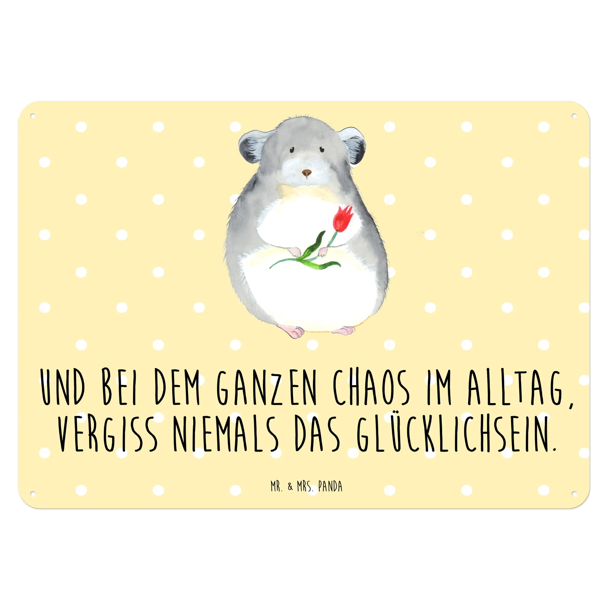 Das wunderschöne Blechschild "Chinchilla mit Blume" aus der Kollektion Small World von Mr. & Mrs. Panda ist nicht nur eine dekorative Bereicherung für dein Zuhause, sondern auch ein liebevolles Geschenk für Freunde und Familie. Dieses niedliche Schild zeigt ein entzückendes Chinchilla, das mit großen Augen und einer charmanten Blume in der Hand anmutig dasteht. Mit einem herzlichen Spruch, der besagt: "Und bei dem ganzen Chaos im Alltag, vergiss niemals das Glücklichsein", inspiriert es dich und glänzt mit positiver Energie.