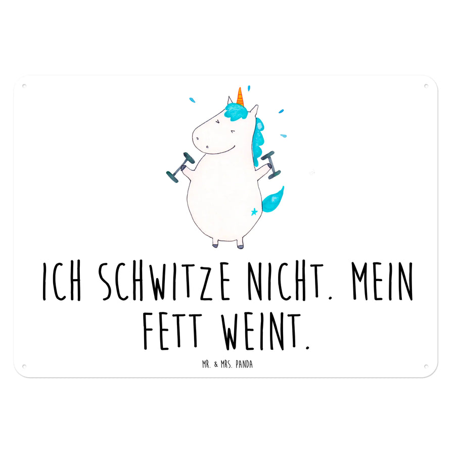 Das wunderschöne Blechschild "Einhorn Fitness" von Mr. & Mrs. Panda ist das perfekteste Geschenk für alle Fitness-Fans und Einhorn-Liebhaber! Es ist mit einem charmanten Motiv und dem witzigen Spruch "Ich schwitze nicht. Mein Fett weint." bedruckt und bringt garantiert ein Lächeln in jedes Fitnessstudio oder in dein Zuhause. Die liebevoll gestaltete Illustration zeigt ein süßes Einhorn, das motiviert mit zwei Hanteln umgeht. Positive Energie und eine gute Portion Humor, die Du in deine Workout-Routine bringen kannst!