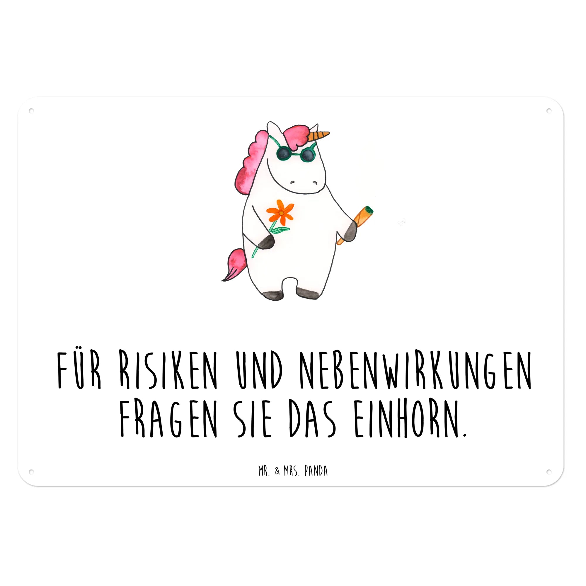 Entdecke das magische Einhorn Woodstock Blechschild von Mr. & Mrs. Panda! Dieses wunderschöne und edle Metallschild ist ein echtes Highlight für jede Wand. Es besticht durch sein liebevoll handgezeichnetes Motiv eines Einhorns, das mit einer Sonnenbrille und einem Joint in der Hand entspannt. Der Spruch "Für Risiken und Nebenwirkungen fragen Sie das Einhorn" bringt nicht nur Freude, sondern lässt auch jedes Herz höher schlagen.