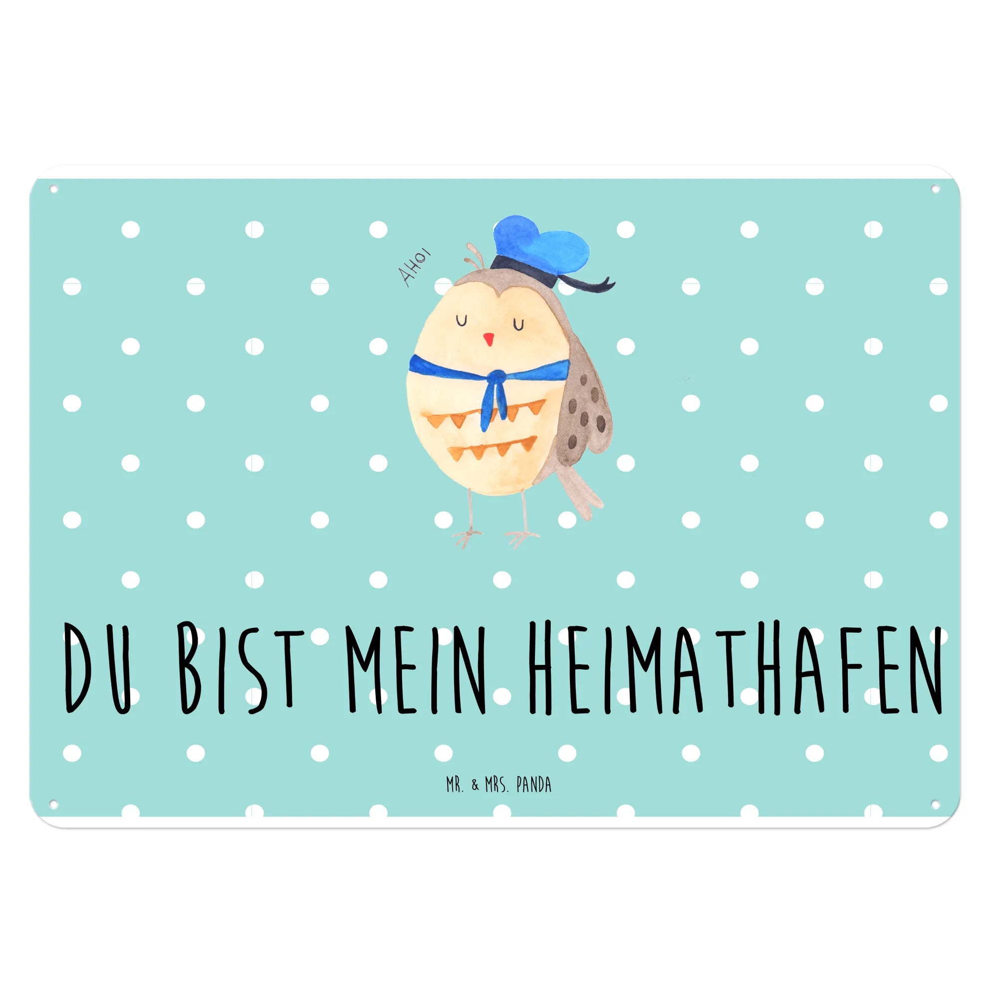 Das Blechschild "Eule Matrosen" von Mr. & Mrs. Panda ist die perfekte Kombination aus Charm und Funktionalität. Dieses edle und langlebige Metallschild bringt nicht nur Farbe an deine Wand, sondern erzählt auch eine liebevolle Geschichte.