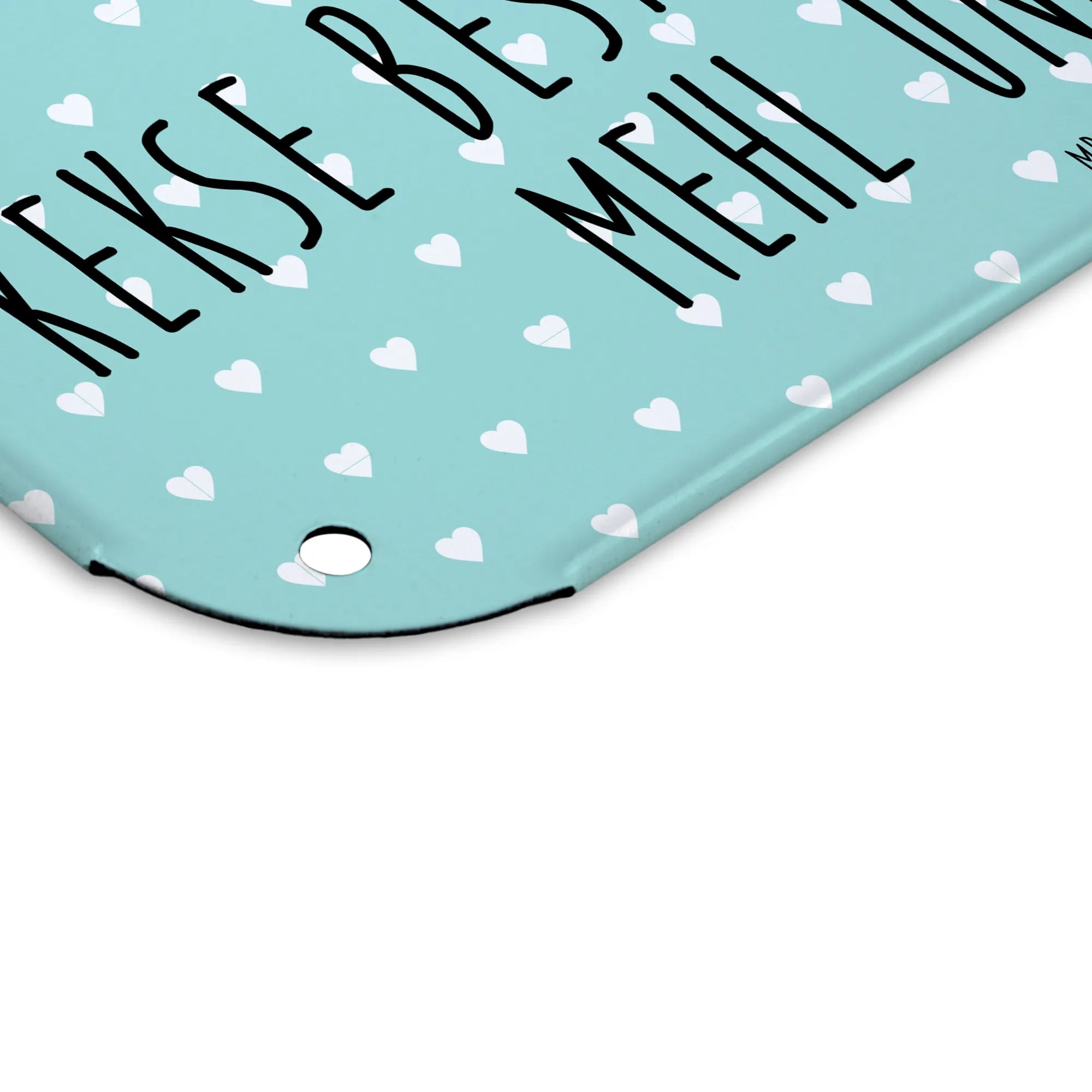 Das Blechschild mit dem süßen Fuchs-Motiv "Kekse bestehen aus Butter, Mehl und Liebe!" von Mr. & Mrs. Panda ist das ideale Geschenk für alle, die Backen lieben oder gerne unbeschwerte Zeiten in der Küche verbringen. Der niedliche Fuchs, der enthusiastisch einen Keks hält, ist nicht nur eine zauberhafte Dekoration für dein Zuhause, sondern auch eine tolle Erinnerung daran, wie wichtig das gemeinsame Backen und Genießen ist.