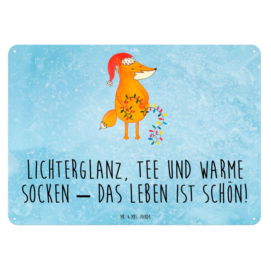 Das wunderschöne Blechschild mit dem fröhlichen Weihnachts-Fuchs aus der Winter Kollektion von Mr. & Mrs. Panda ist das perfekte Geschenk für die besinnliche Weihnachtszeit. Olle gute Freunde, Verwandte und liebe Menschen werden sich über dieses edle Deko-Schild freuen! Der lustige Fuchs trägt eine weihnachtliche Mütze und hält spielerisch eine Lichterkette mit bunten Lämpchen in seinen Pfoten. Die warmen Orangetöne kombiniert mit zarten Verzierungen in Form von grünen Blättern und roten Beeren verleihen diesem Schild eine festliche Ausstrahlung. Mit dem Spruch "Lichterglanz, Tee und warme Socken – das Leben ist schön!" zaubert dieses Schild ein Lächeln in jede Wohnung.