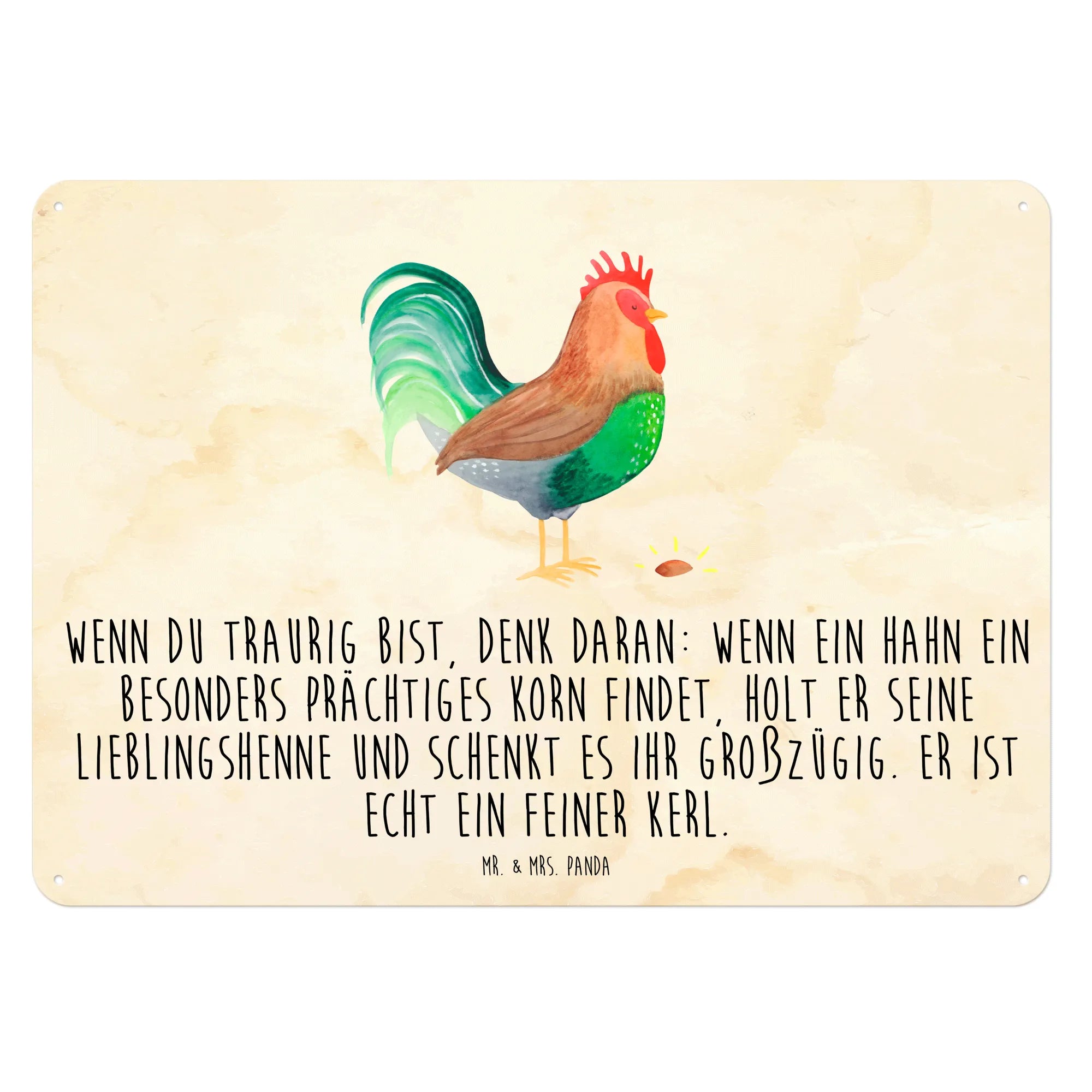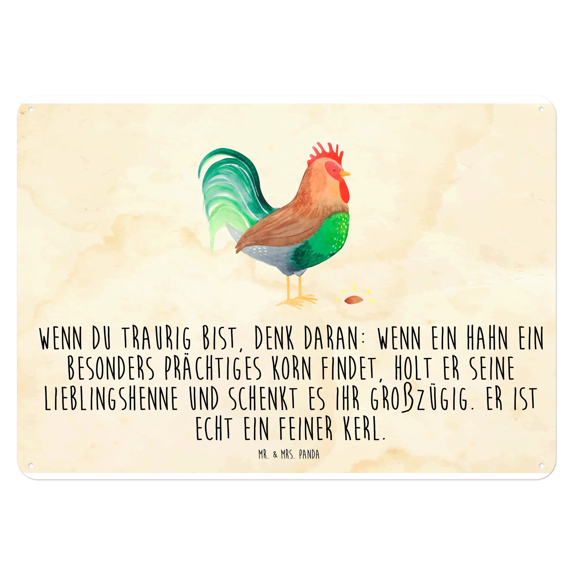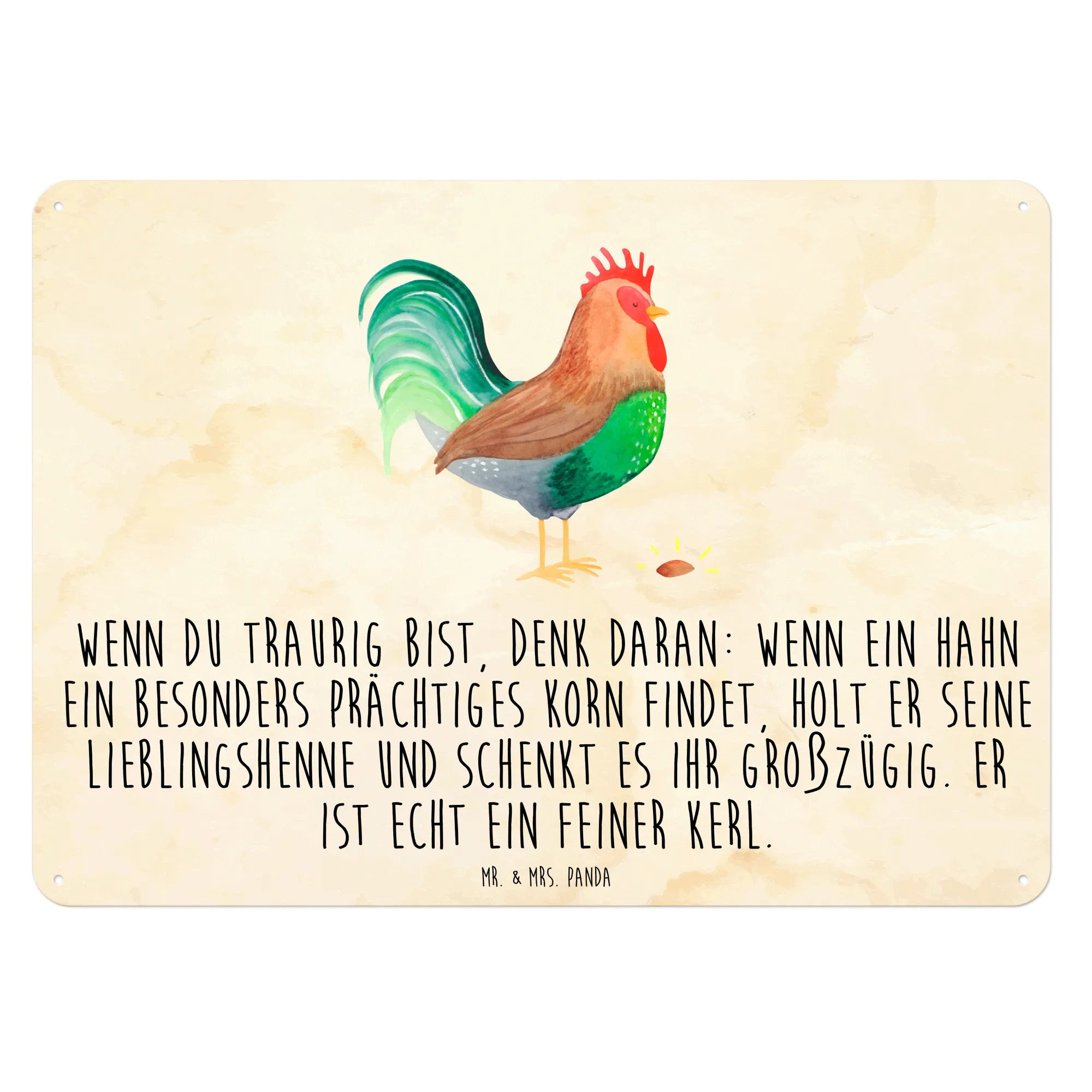 Zeige mit diesem Schild deinen Sinn für Humor und deine Liebe zur Natur. Schaffe eine einladende Atmosphäre in deinem Zuhause oder verschenke ein Stück Bauernhof-Gefühl mit Mr. & Mrs. Panda's "Hahn mit Korn"! Es wird mit Sicherheit das Herz eines jeden Menschen erfreuen und ein wahres Highlight an jeder Wand setzen.