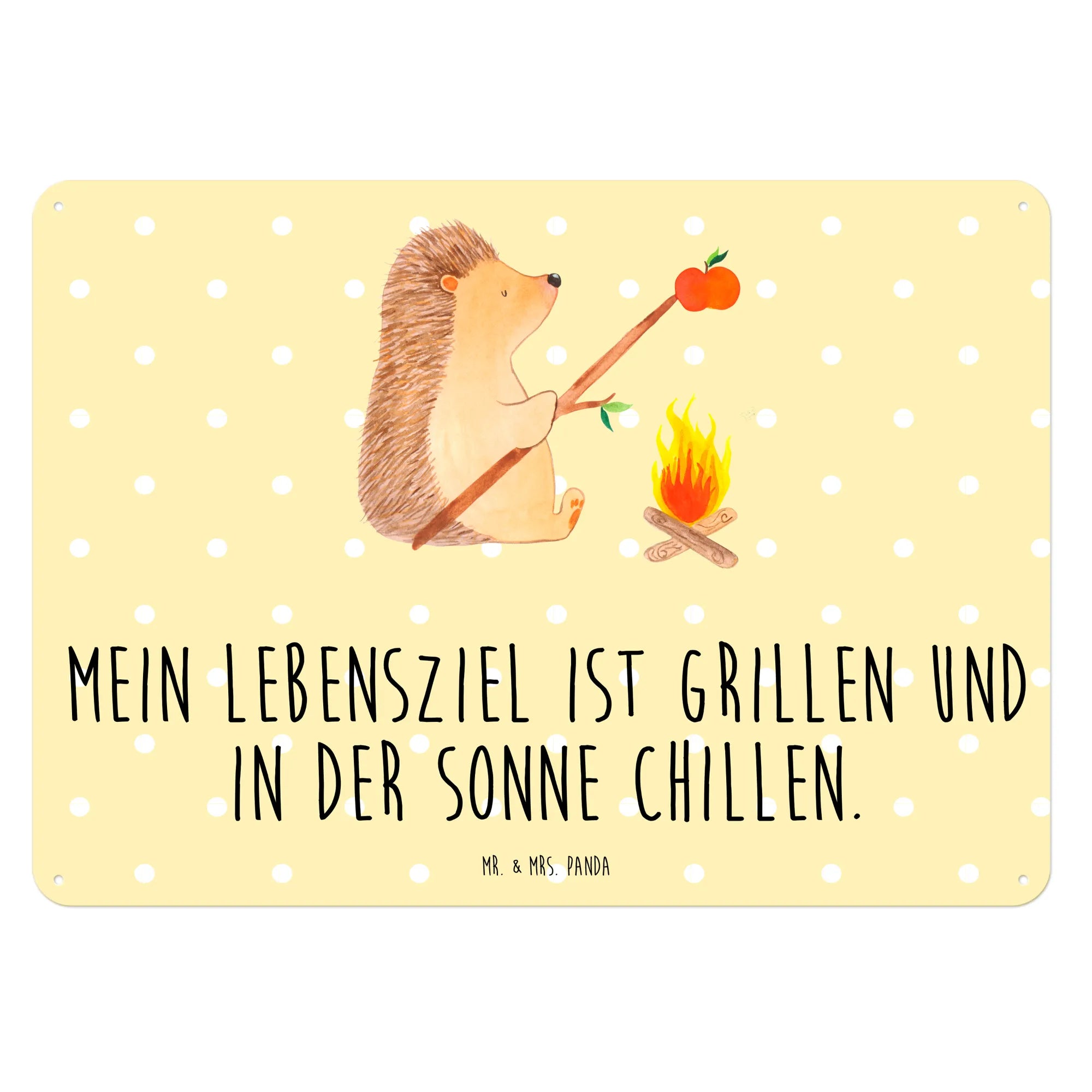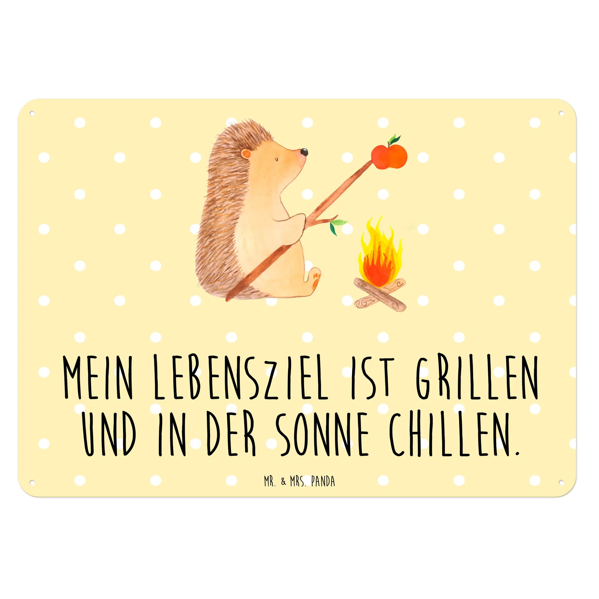 Das wunderschöne Blechschild mit dem Motiv "Igel grillt" von Mr. & Mrs. Panda ist die perfekte Wandschmuck für alle, die Freude an der Natur und am Grillen haben.