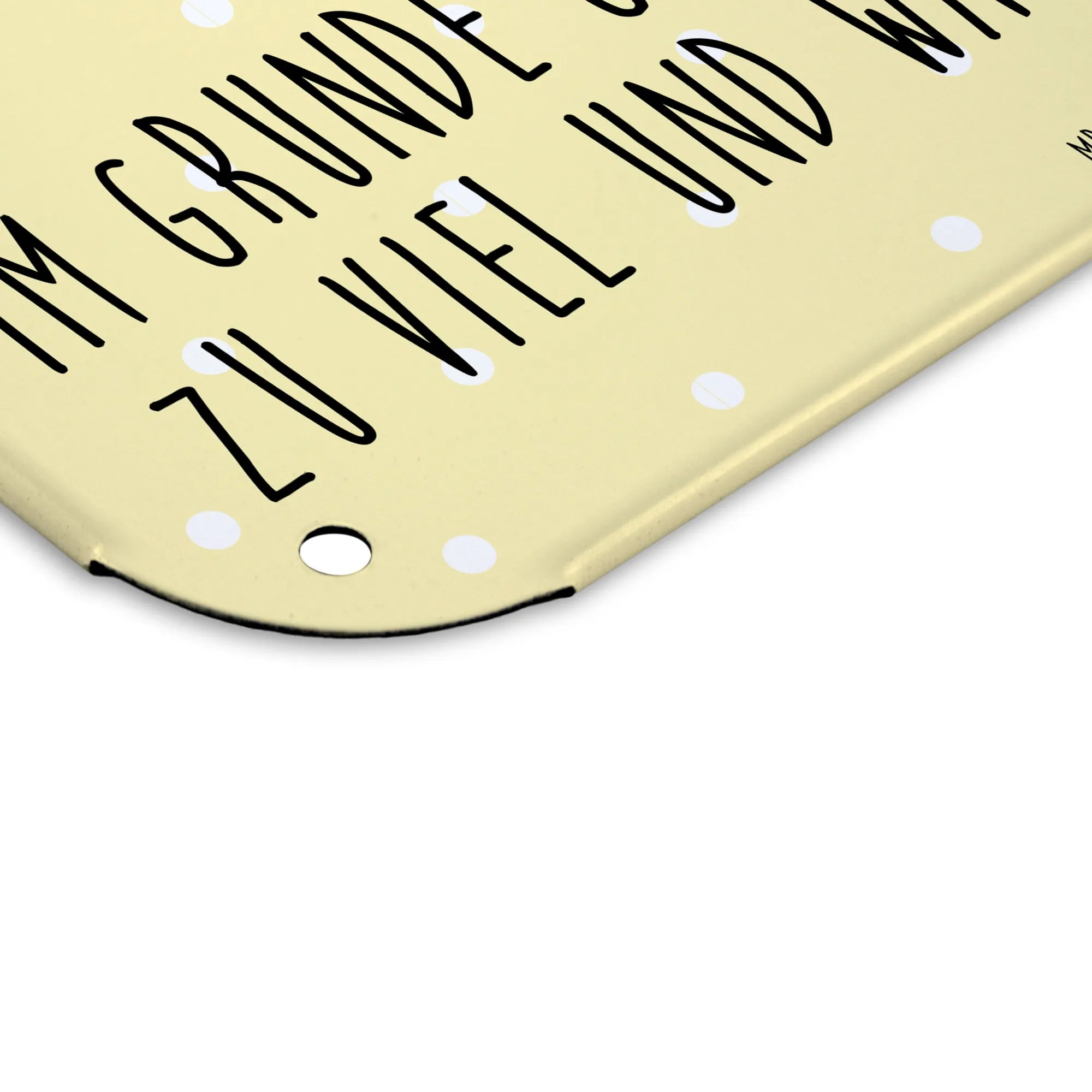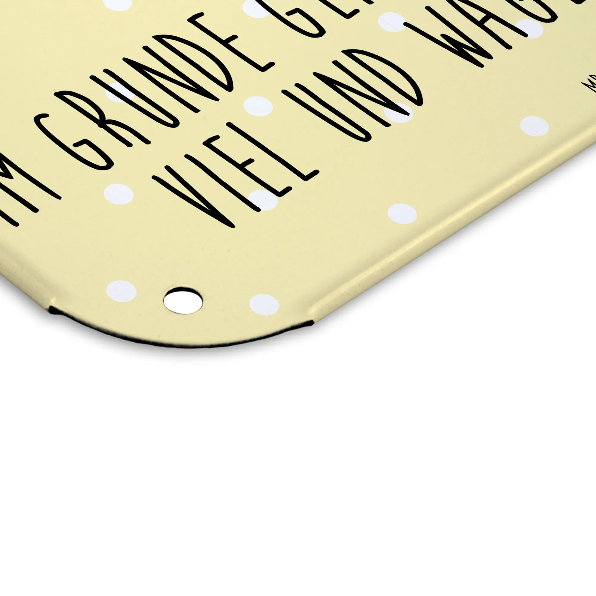 Das edel bedruckte Metallschild überzeugt nicht nur durch sein liebevolles Design, sondern auch durch die hohe Qualität des verwendeten Stahlblechs. Es ist vollkommen flach, hat abgerundete Ecken und umgefalzte Kanten, die für zusätzliche Sicherheit sorgen. Mit vier Bohrungen zur einfachen Befestigung kannst Du es schnell und unkompliziert anbringen. Ob im Wohnzimmer, Schlafzimmer oder sogar im Flur – das Schild bringt Gute Laune und positive Botschaften in Dein Zuhause.