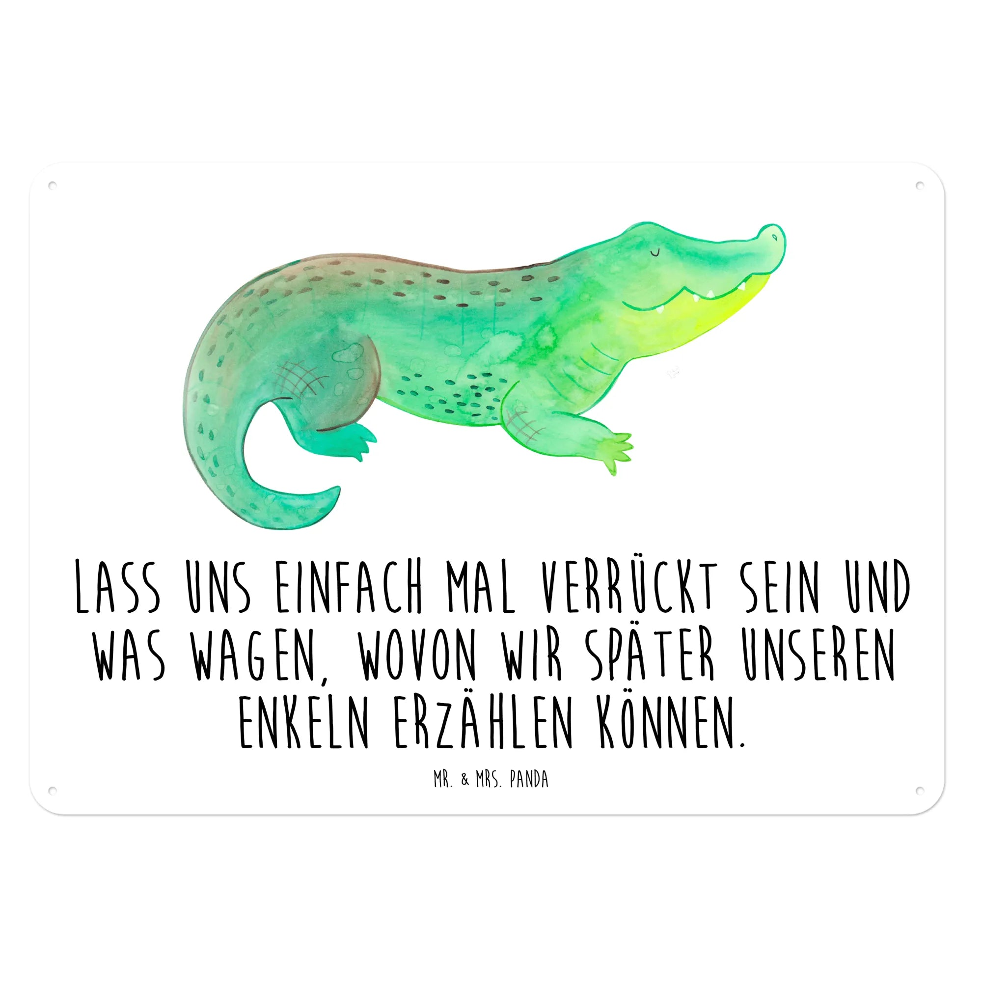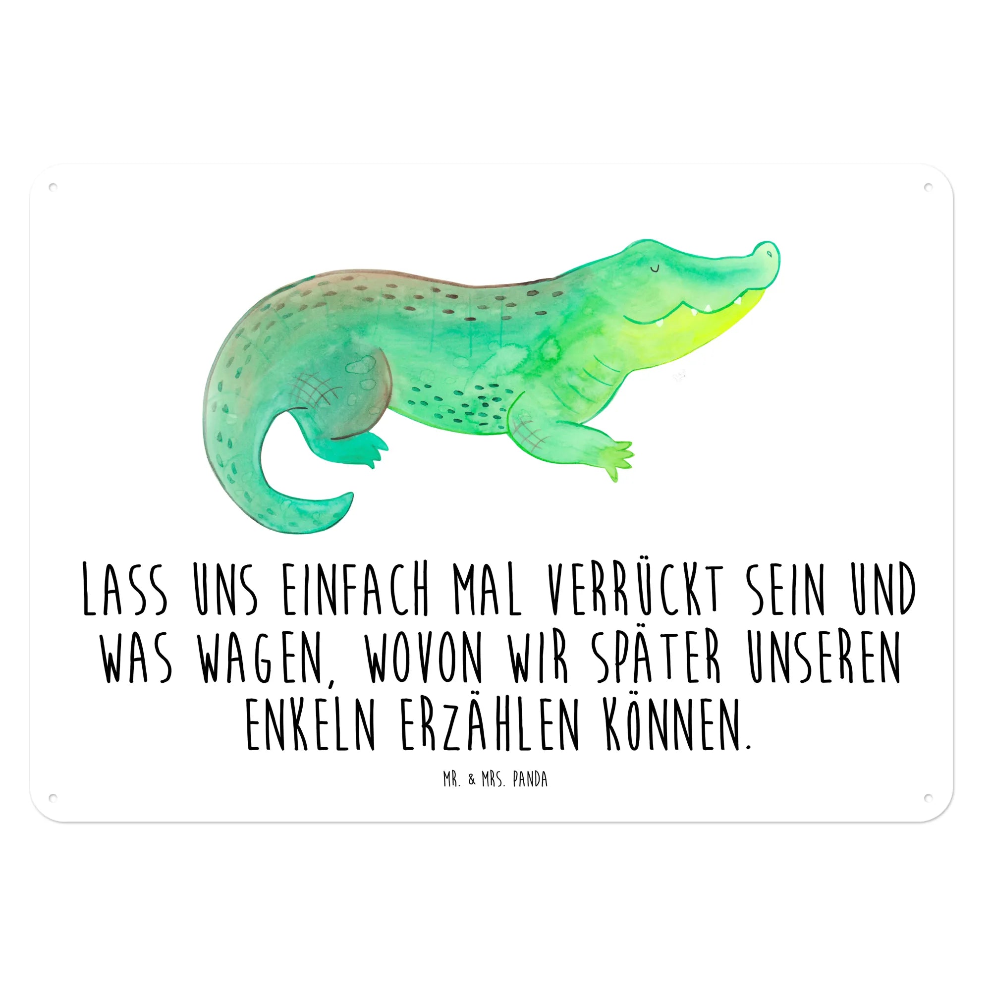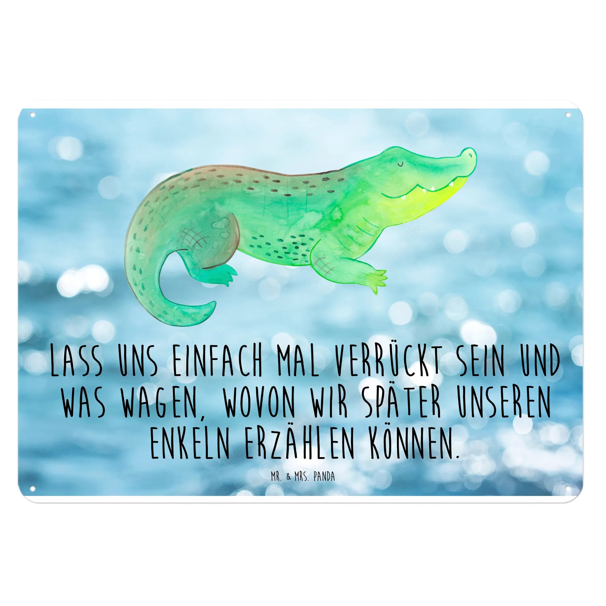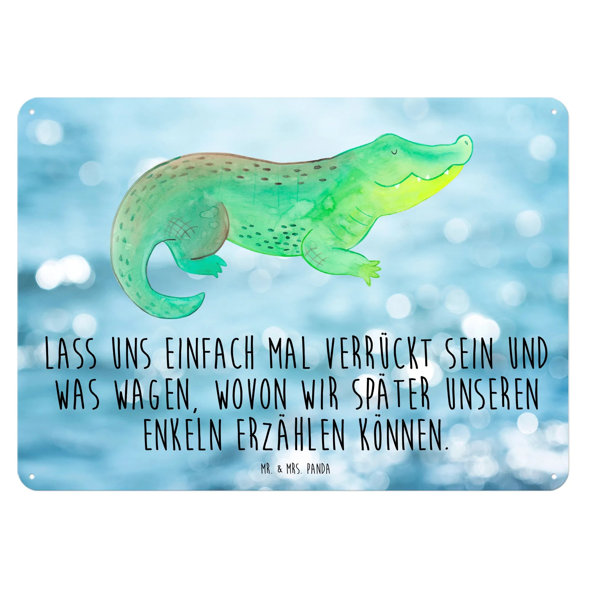 Entdecke die Kunst, das Leben vorzuleben mit dem tollen Blechschild "Krokodil" aus der Meerestiere Kollektion von Mr. & Mrs. Panda! Dieses stilvolle Metallschild ist mehr als nur ein Dekorationsobjekt – es ist ein echter Motivator für Abenteuerlust und Lebensfreude. Mit einem süßen, freundlich lächelnden Krokodil, das symbolsitisch für spontane Abenteuer steht, wird dieses Schild all deine Freunde und Familie erfreuen.