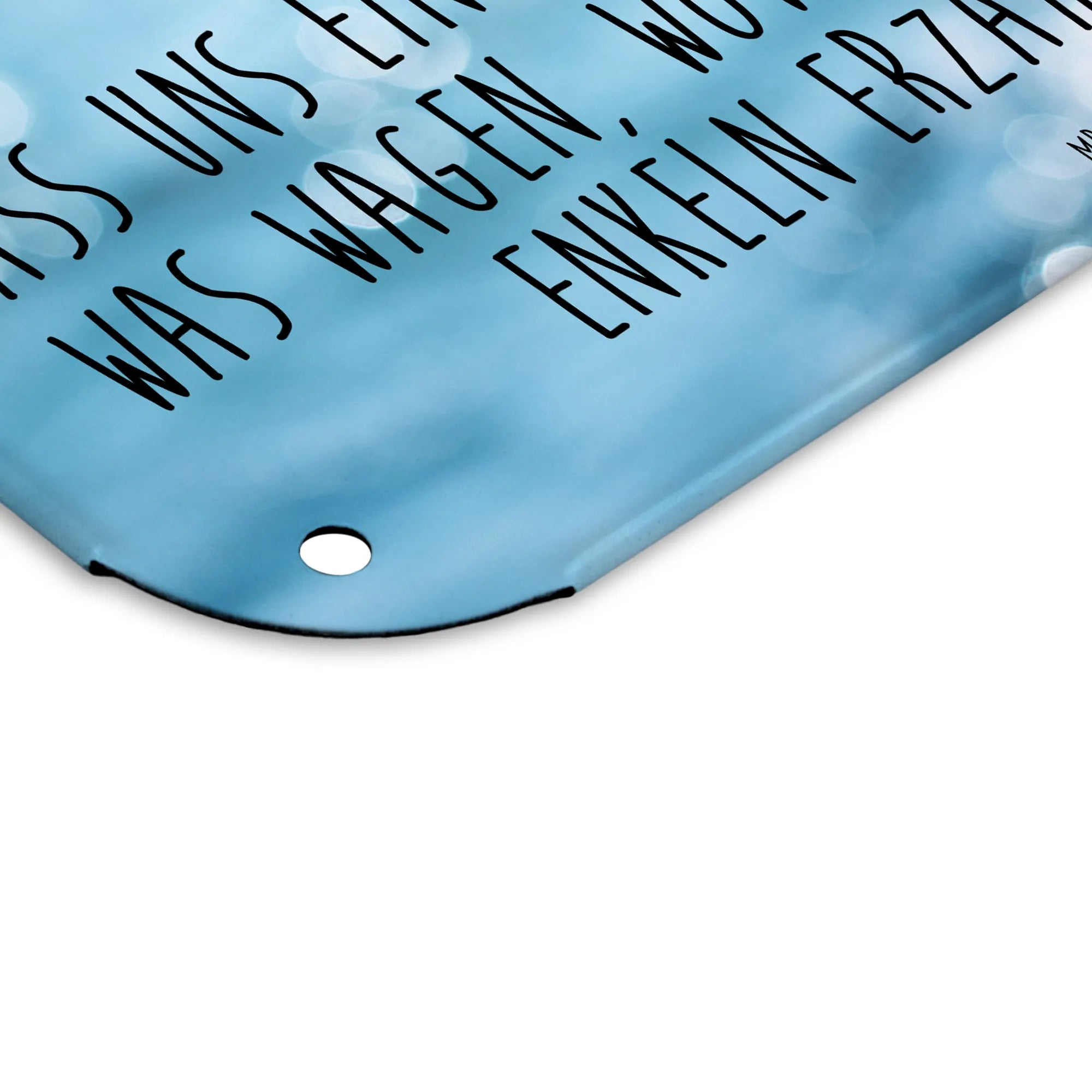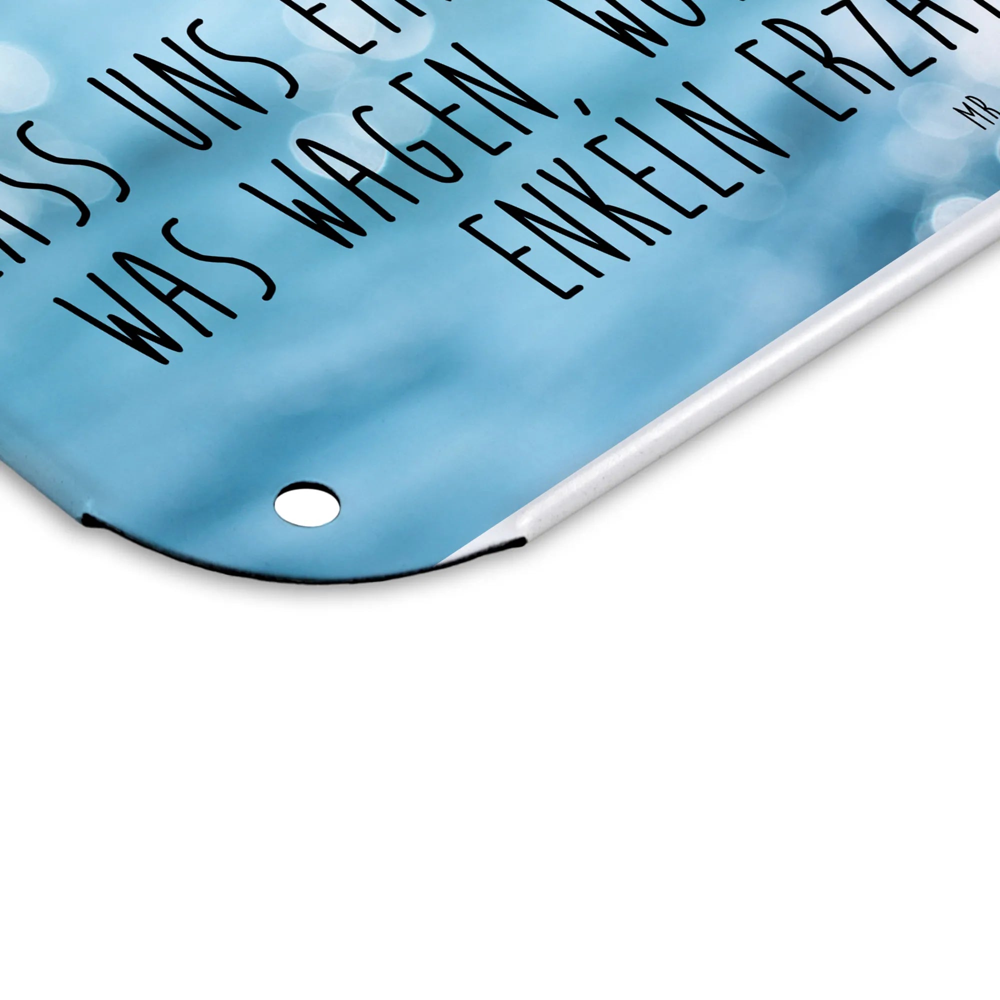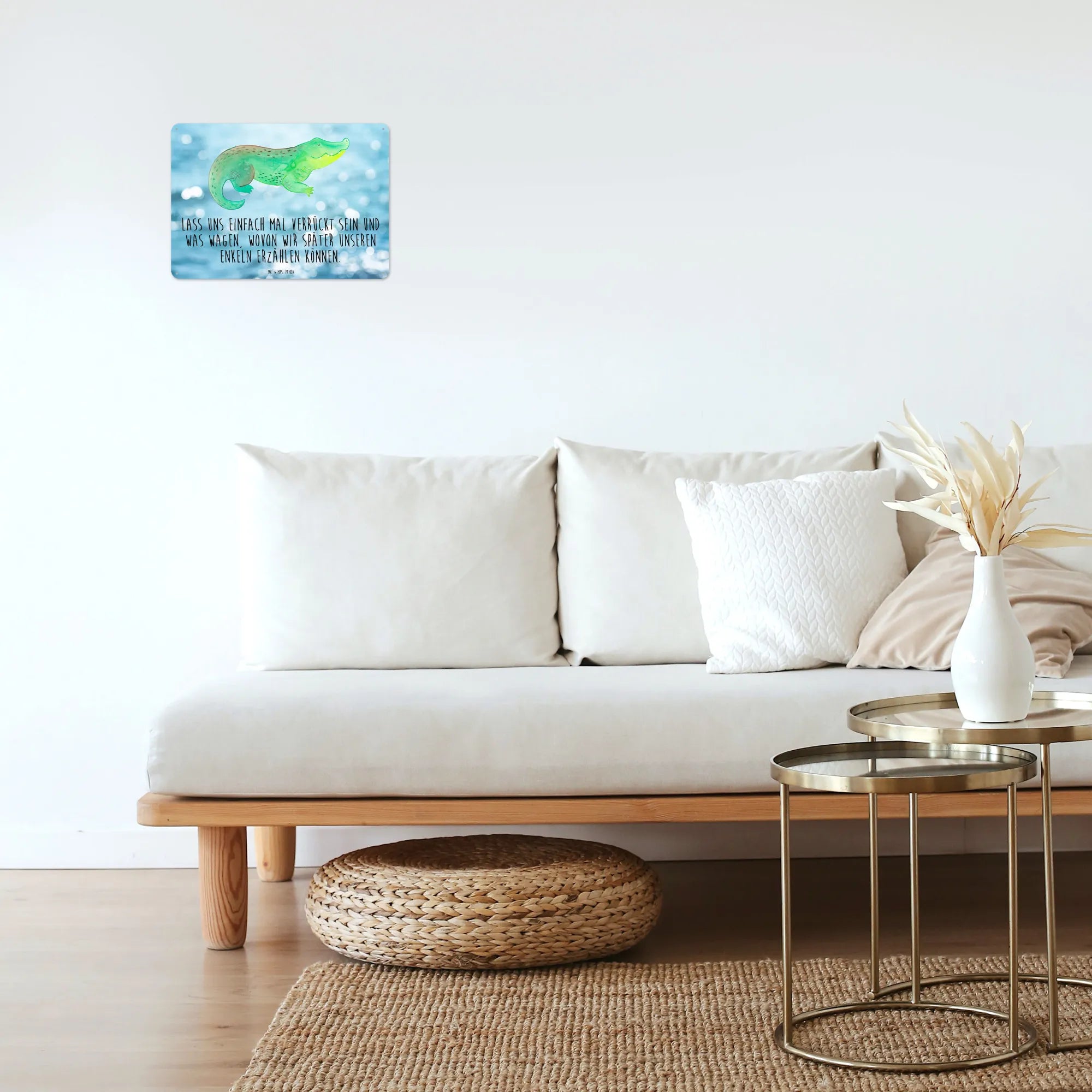 Das Blechschild mit dem süßen Krokodil aus der Meerestiere Kollektion von Mr. & Mrs. Panda ist das perfekte Geschenk für alle, die das Abenteuer lieben und Freunde des Meeres sind! Mit dem motivierenden Spruch "Lass uns einfach mal verrückt sein und was wagen, wovon wir später unseren Enkeln erzählen können" strahlt dieses Schild nicht nur eine positive Energie aus, sondern regt auch dazu an, die Welt neugierig zu erkunden und spontane Abenteuer zu erleben. Es erinnert uns daran, Risiken einzugehen und unser Leben in vollen Zügen zu genießen!