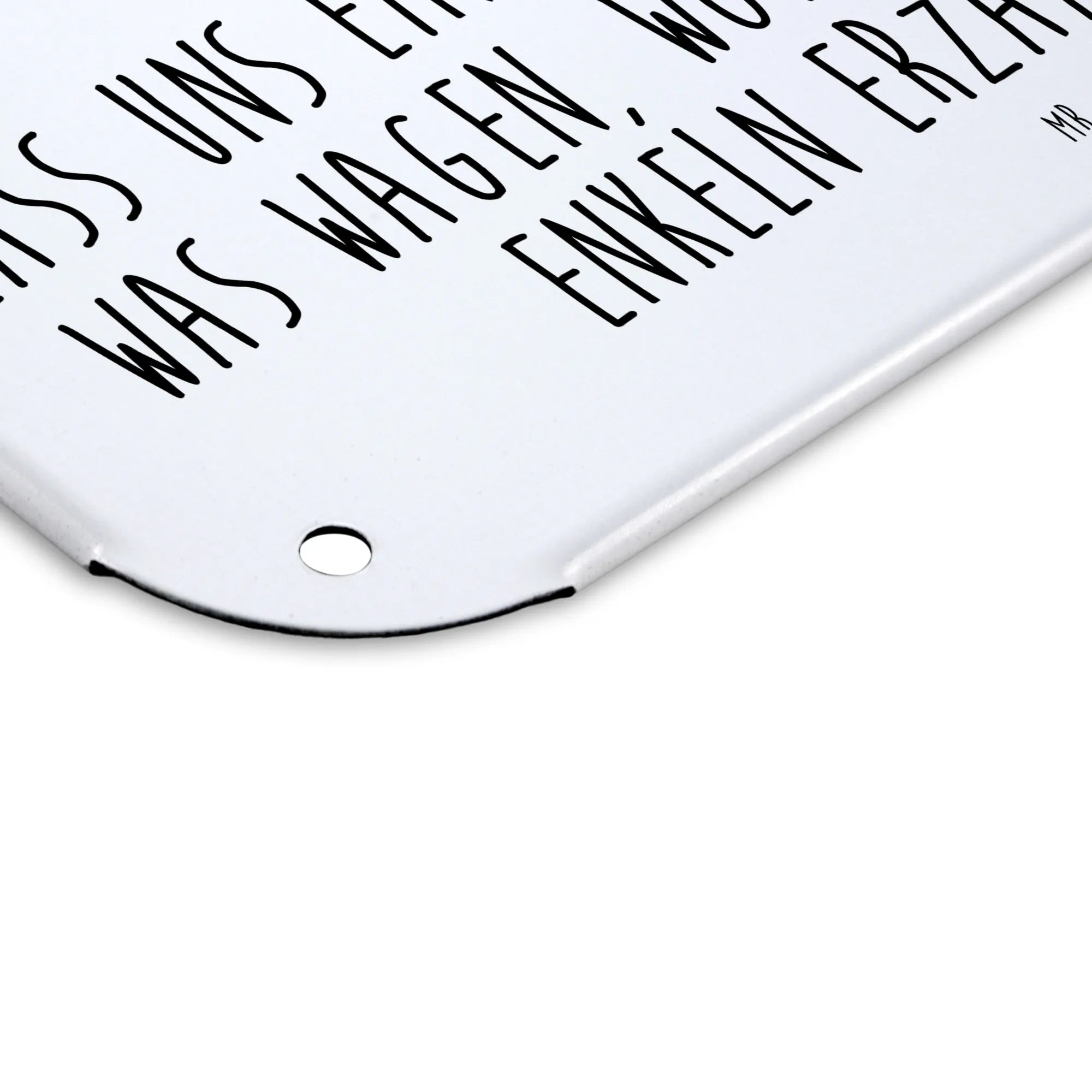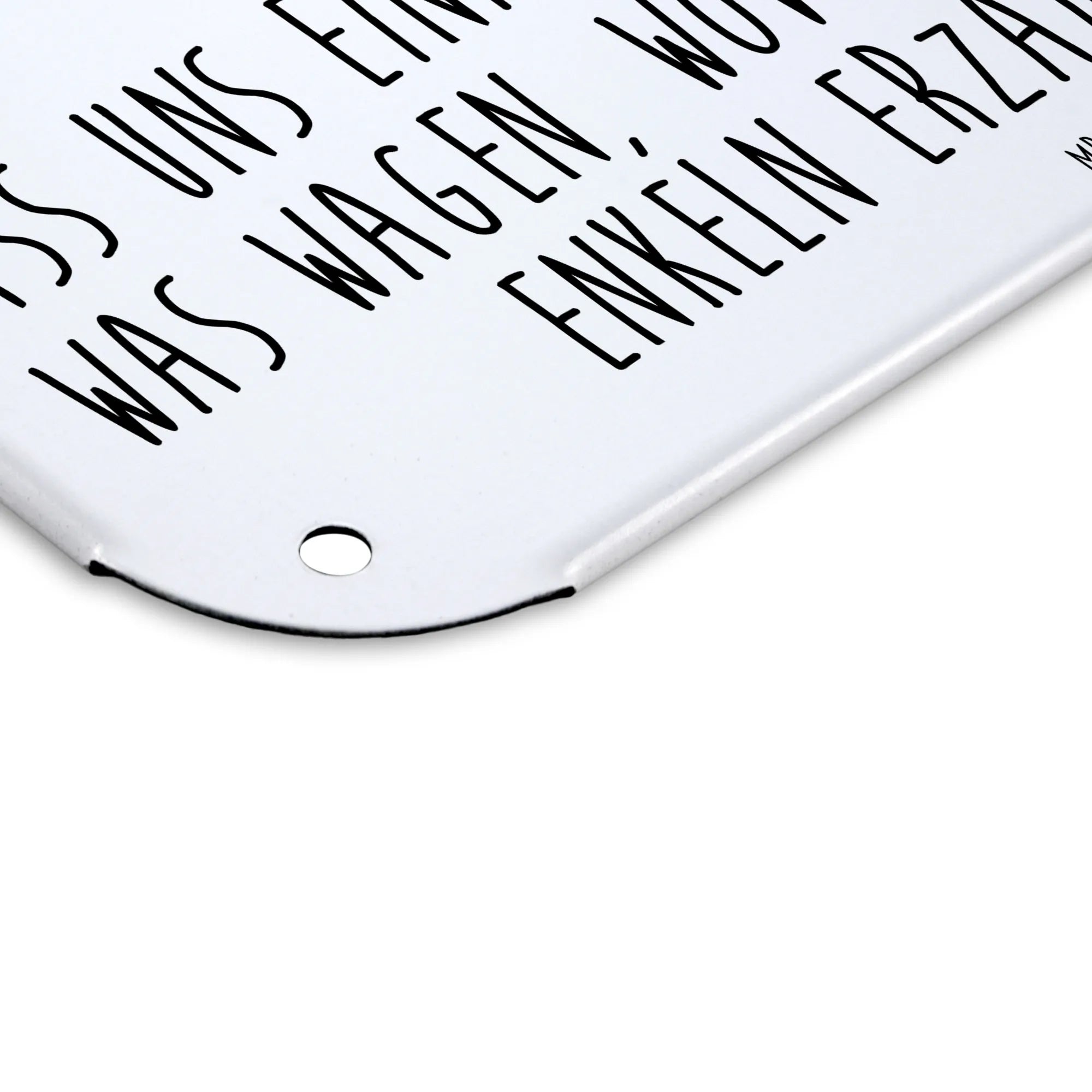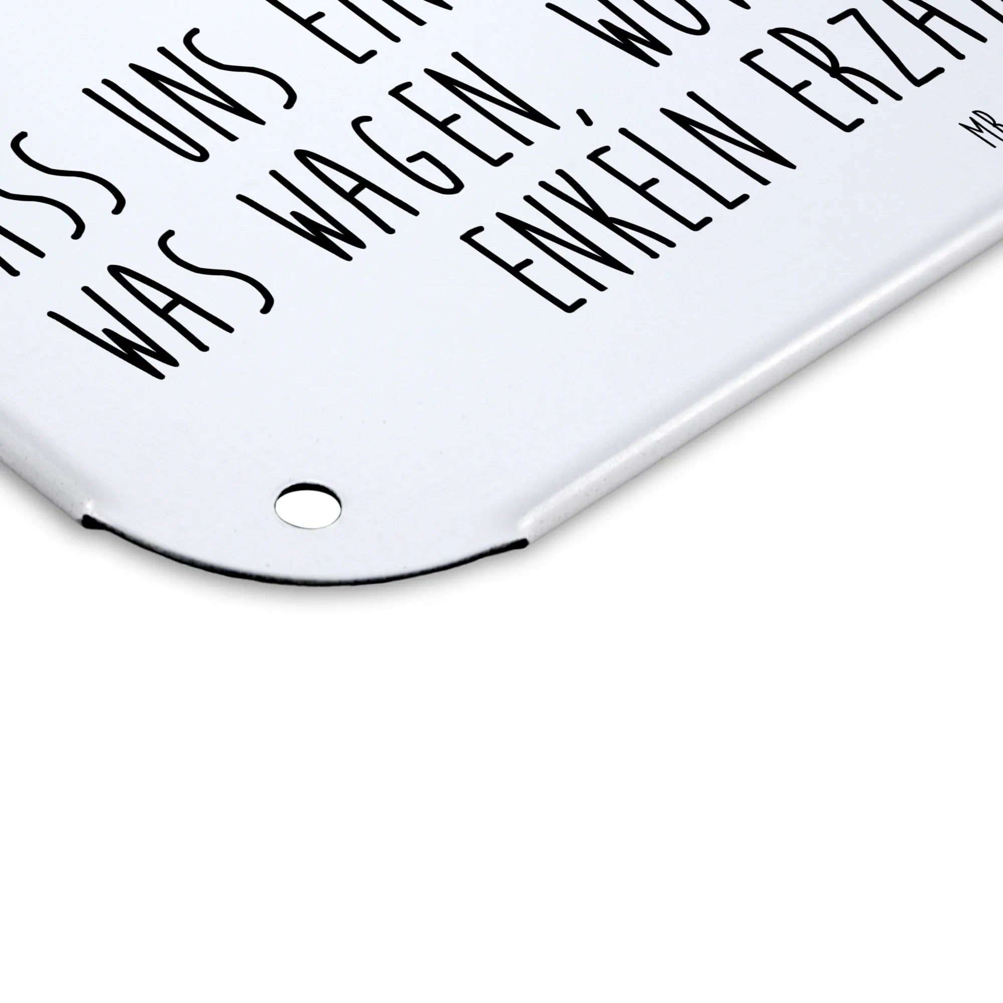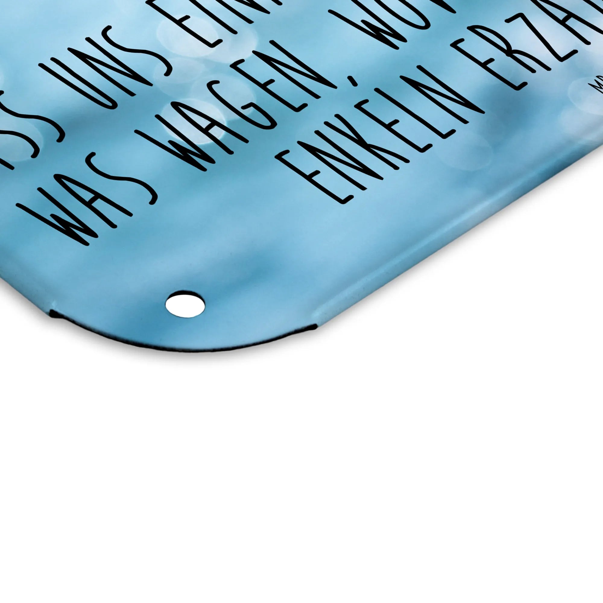 Das Blechschild mit dem süßen Krokodil aus der Meerestiere Kollektion von Mr. & Mrs. Panda ist das perfekte Geschenk für alle, die das Abenteuer lieben und Freunde des Meeres sind! Mit dem motivierenden Spruch "Lass uns einfach mal verrückt sein und was wagen, wovon wir später unseren Enkeln erzählen können" strahlt dieses Schild nicht nur eine positive Energie aus, sondern regt auch dazu an, die Welt neugierig zu erkunden und spontane Abenteuer zu erleben. Es erinnert uns daran, Risiken einzugehen und unser Leben in vollen Zügen zu genießen!