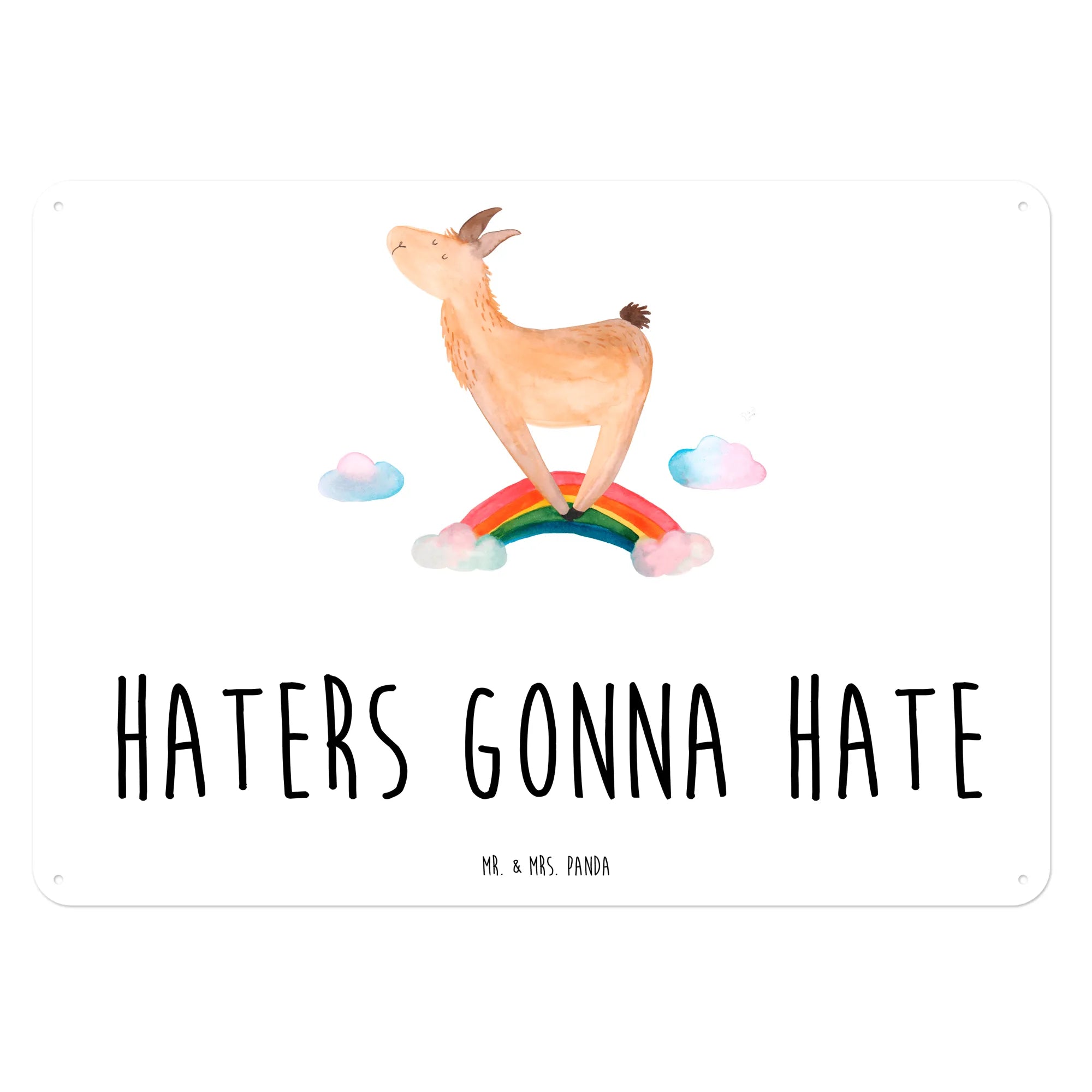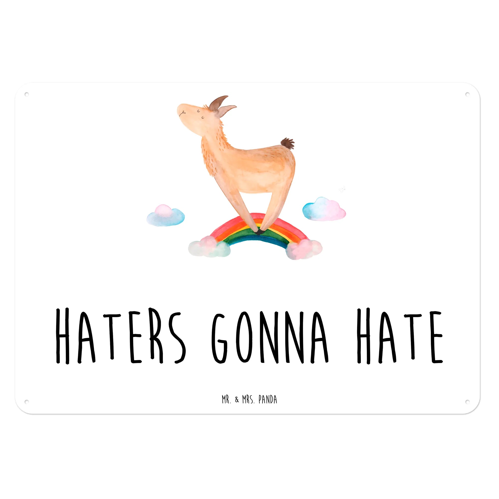 Das wunderschöne Blechschild "Lama Regenbogen" aus der Lama-Kollektion von Mr. & Mrs. Panda ist das perfekte Geschenk für alle Lama-Fans und Liebhaber von einzigartiger Wanddekoration. Mit seinem charmanten Design und dem witzigen Slogan "Haters gonna hate" bringt es Fröhlichkeit und Lebensfreude in jeden Raum. Ob in Deinem Wohnzimmer, in der Küche oder im Flur, das Schild ist ein echter Blickfang und zaubert nicht nur Dir, sondern auch Deinen Gästen ein Lächeln ins Gesicht.