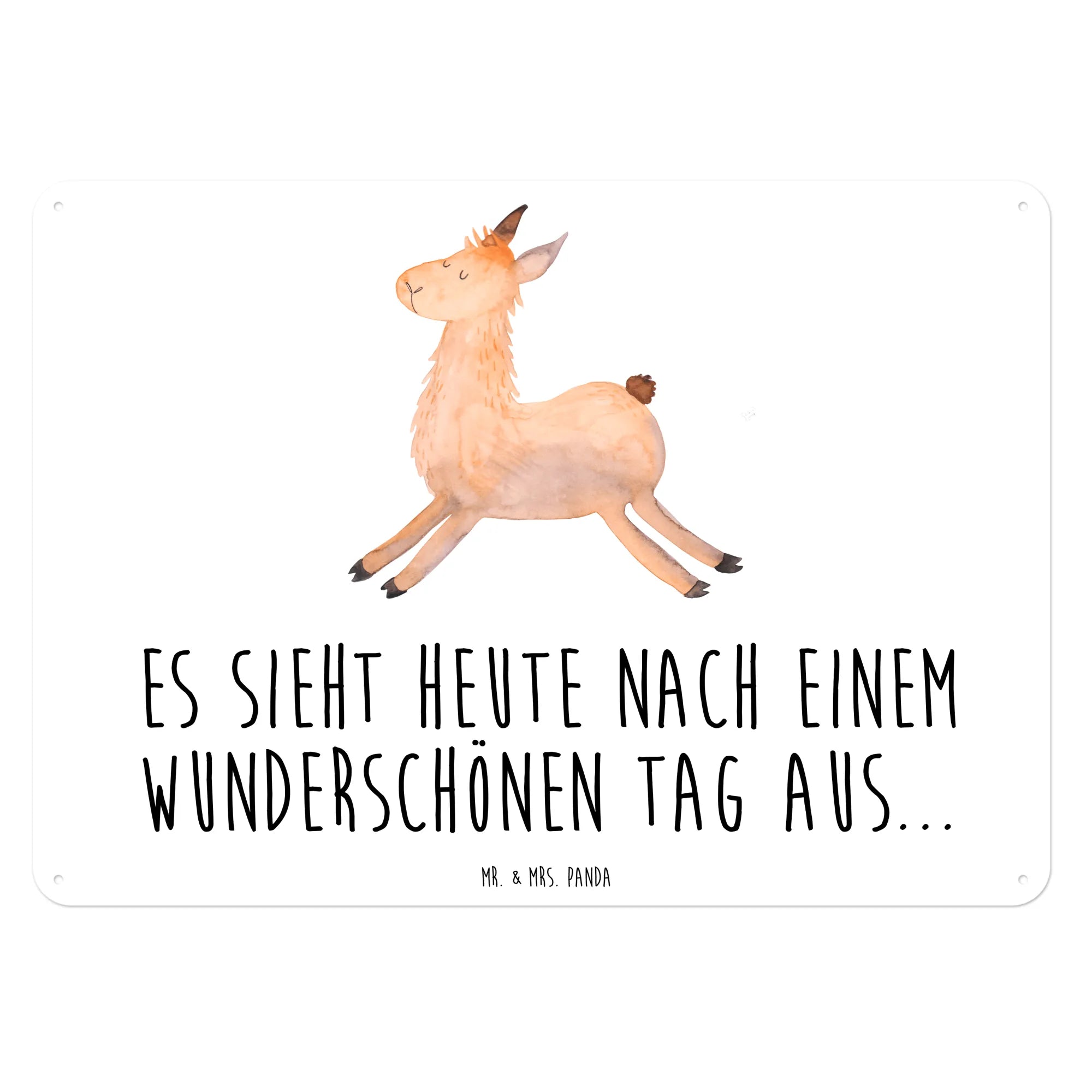 Entdecke das wunderschöne Blechschild "Lama springend" aus der Lama-Kollektion von Mr. & Mrs. Panda! Dieses charmante Schild bringt Lebensfreude in jeden Raum und zaubert dir mit seinem süßen Lama-Motiv und dem fröhlichen Spruch: "Es sieht heute nach einem wunderschönen Tag aus..." ein Lächeln ins Gesicht.