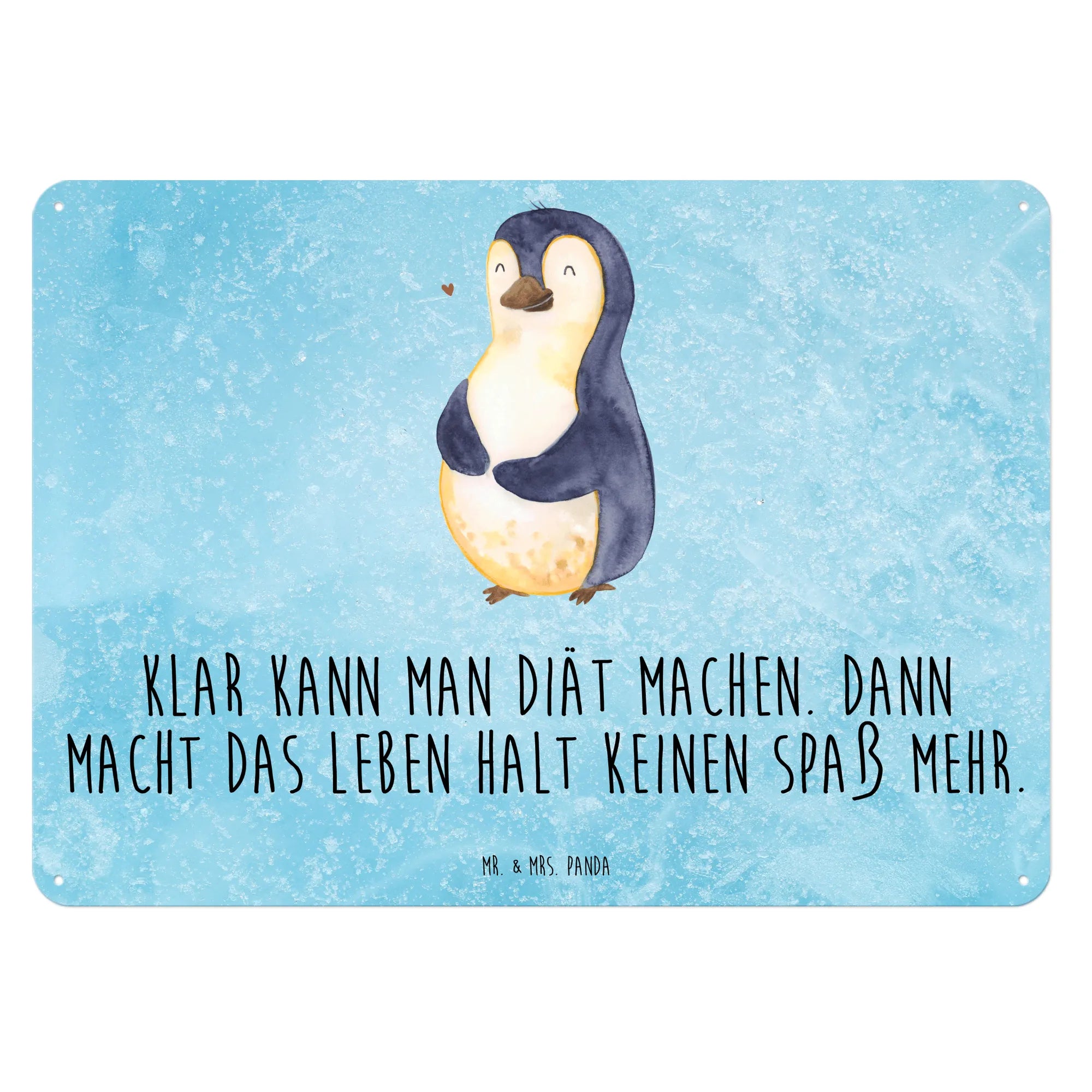 Das edle Blechschild aus der Pinguin-Kollektion von Mr. & Mrs. Panda ist das perfekte Geschenk für alle, die einen besonderen Blick auf ihre Diät werfen möchten. Dieses charmante Metallschild zeigt einen fröhlichen Pinguin, der sich über seinen runden Bauch streichelt, begleitet von dem witzigen Spruch: 'Klar kann man Diät machen. Dann macht das Leben halt keinen Spaß mehr.'