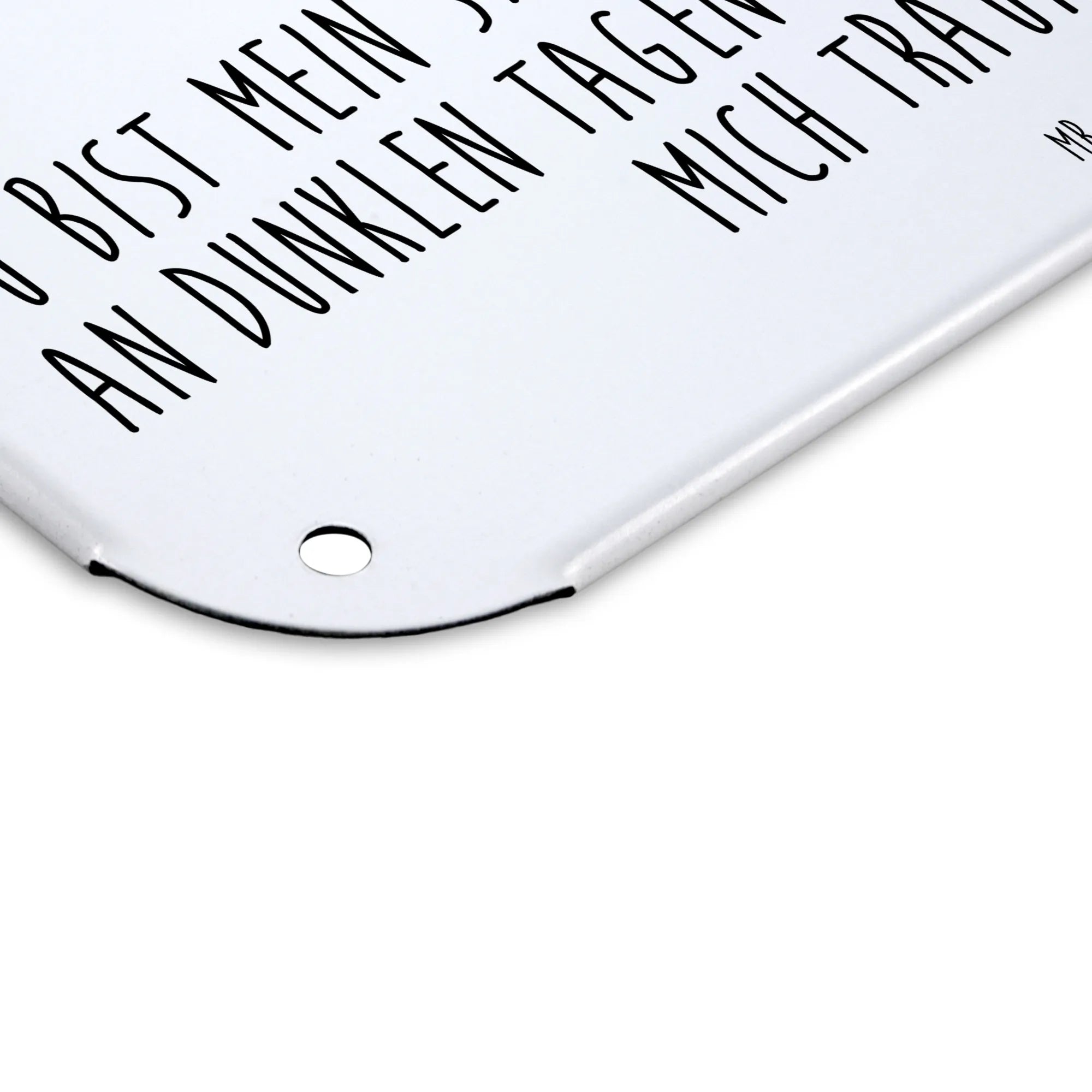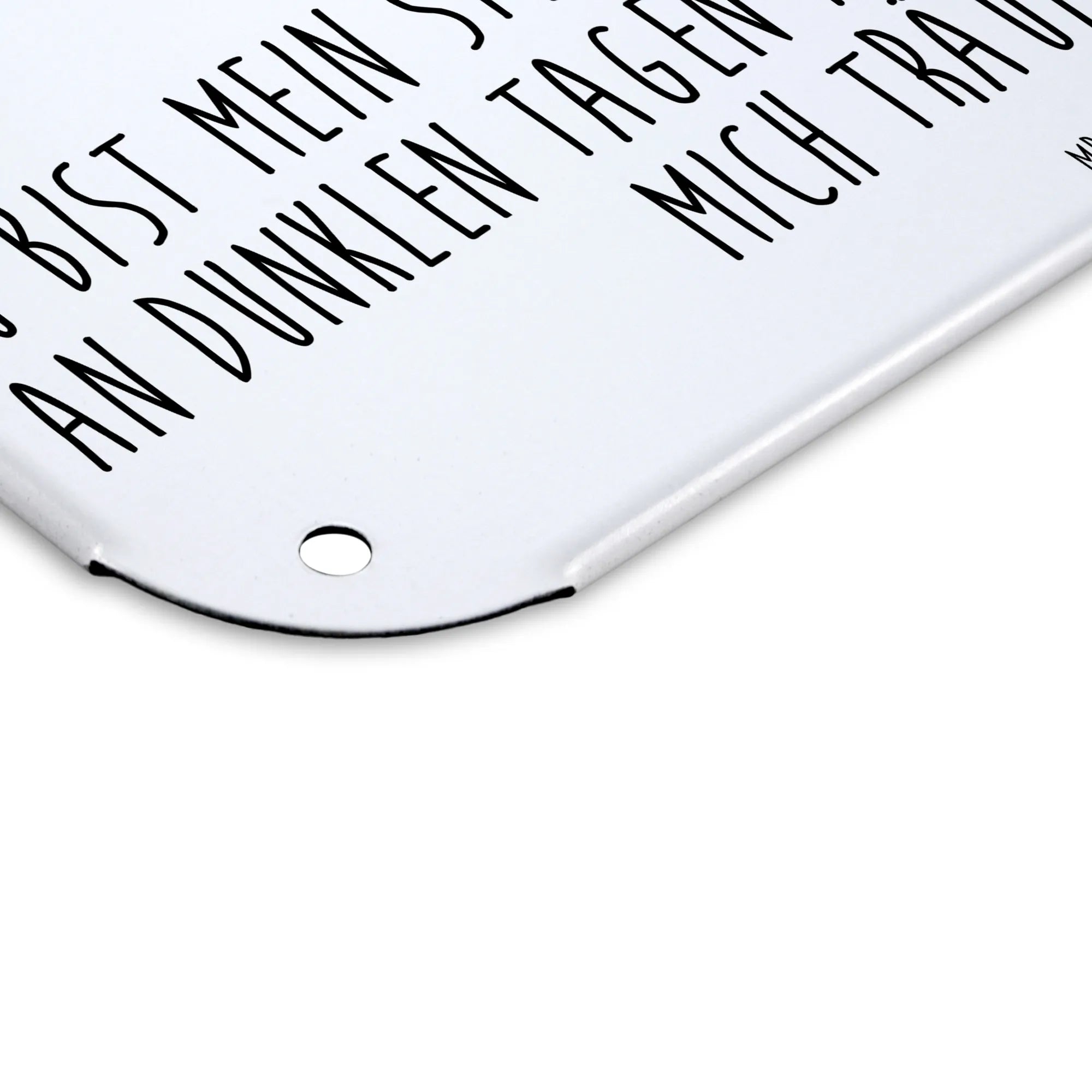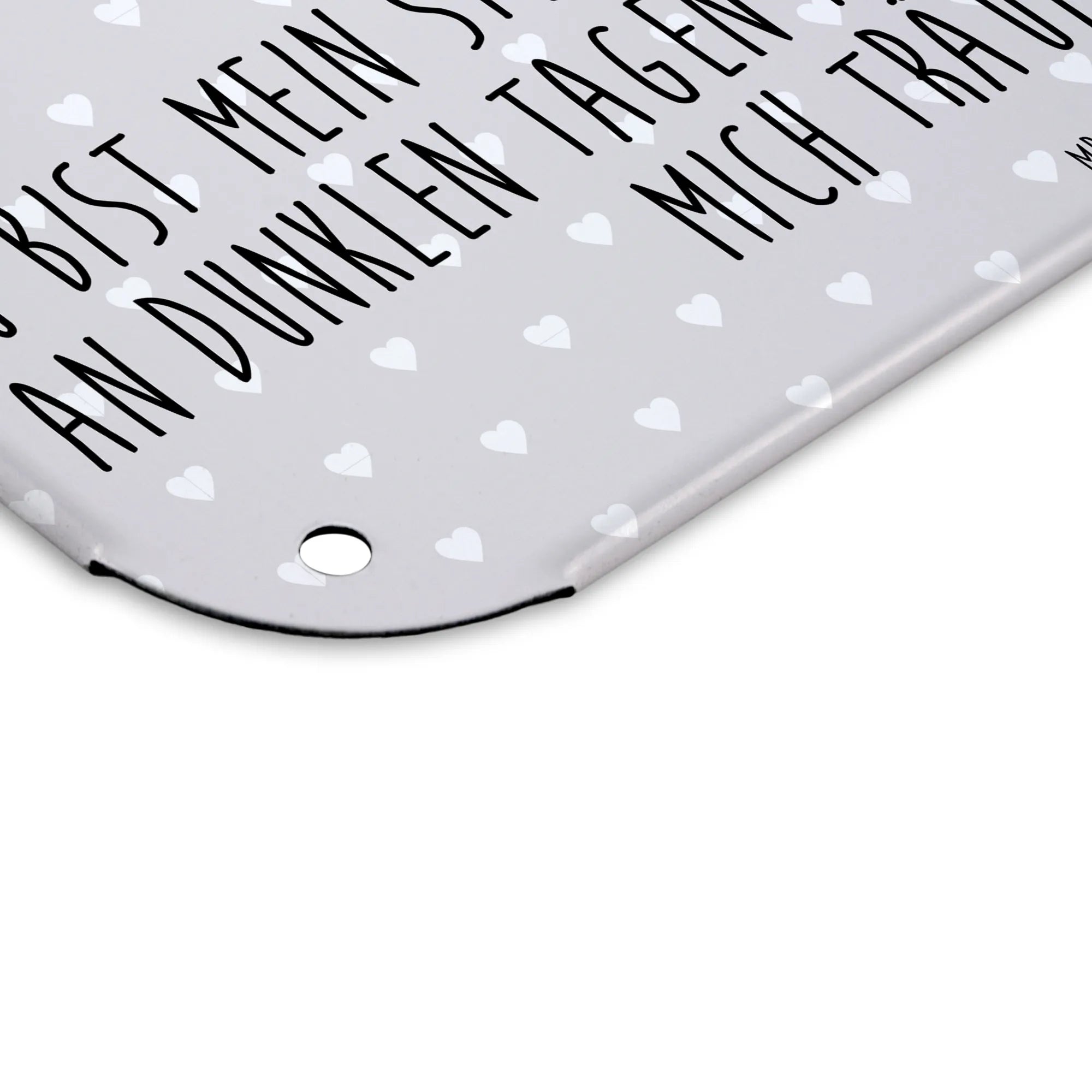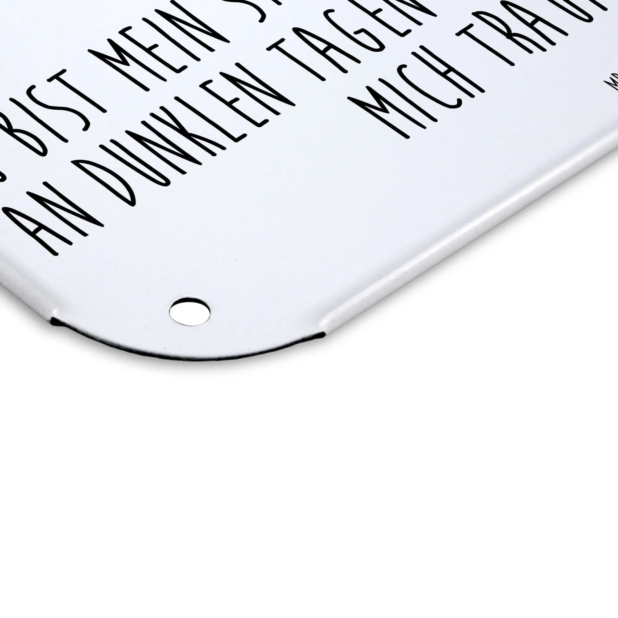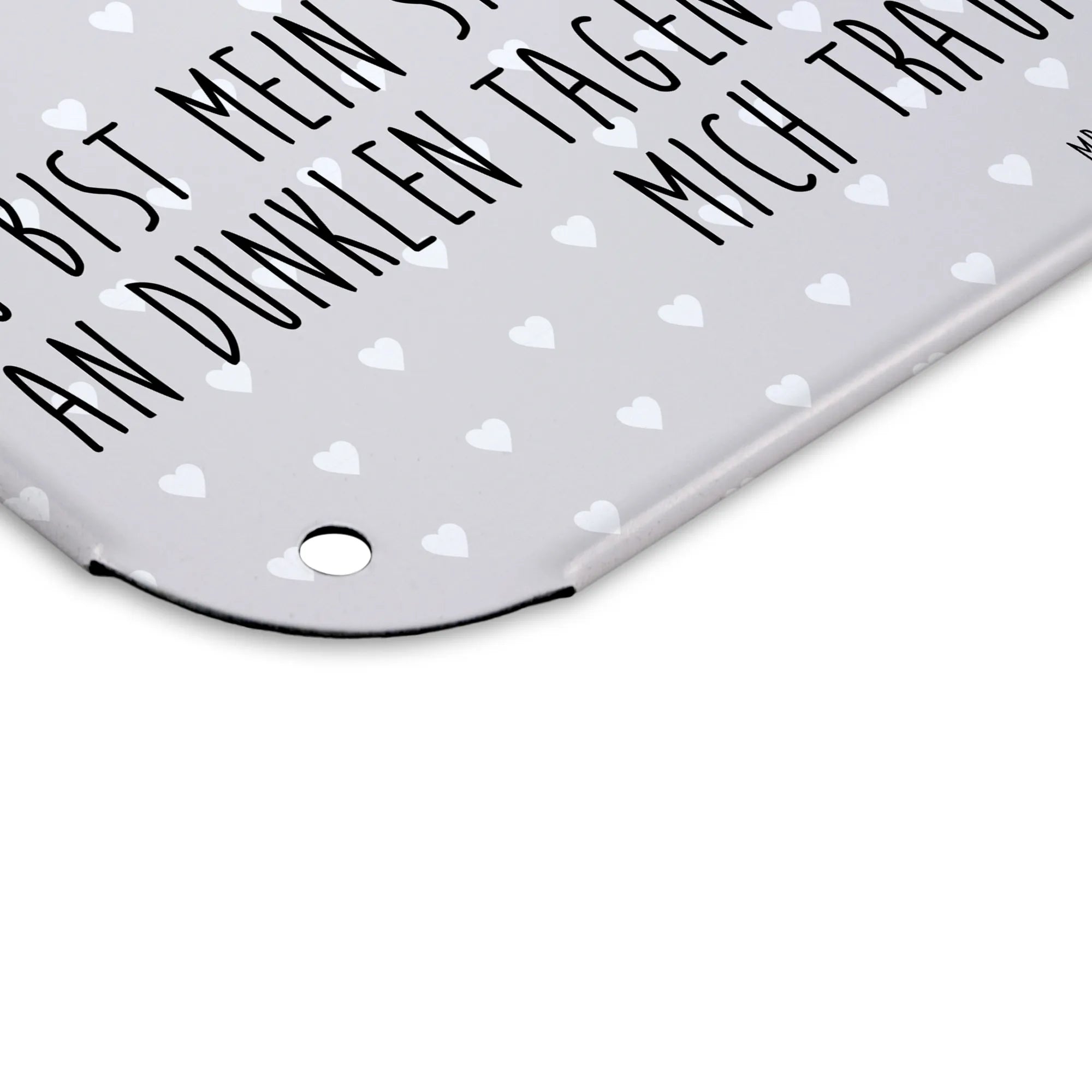 Mit dem Spruch 'Du bist mein Stern, zu dem ich aufblicke, der an dunklen Tagen für mich leuchtet und der mich träumen lässt.' wird dieses Schild zum echten Liebesbeweis. Die Kombination aus verspielter Grafik und tiefgründigem Text macht das Metallschild zu einem besonderen Dekorationsstück für die Wand oder die Tür.