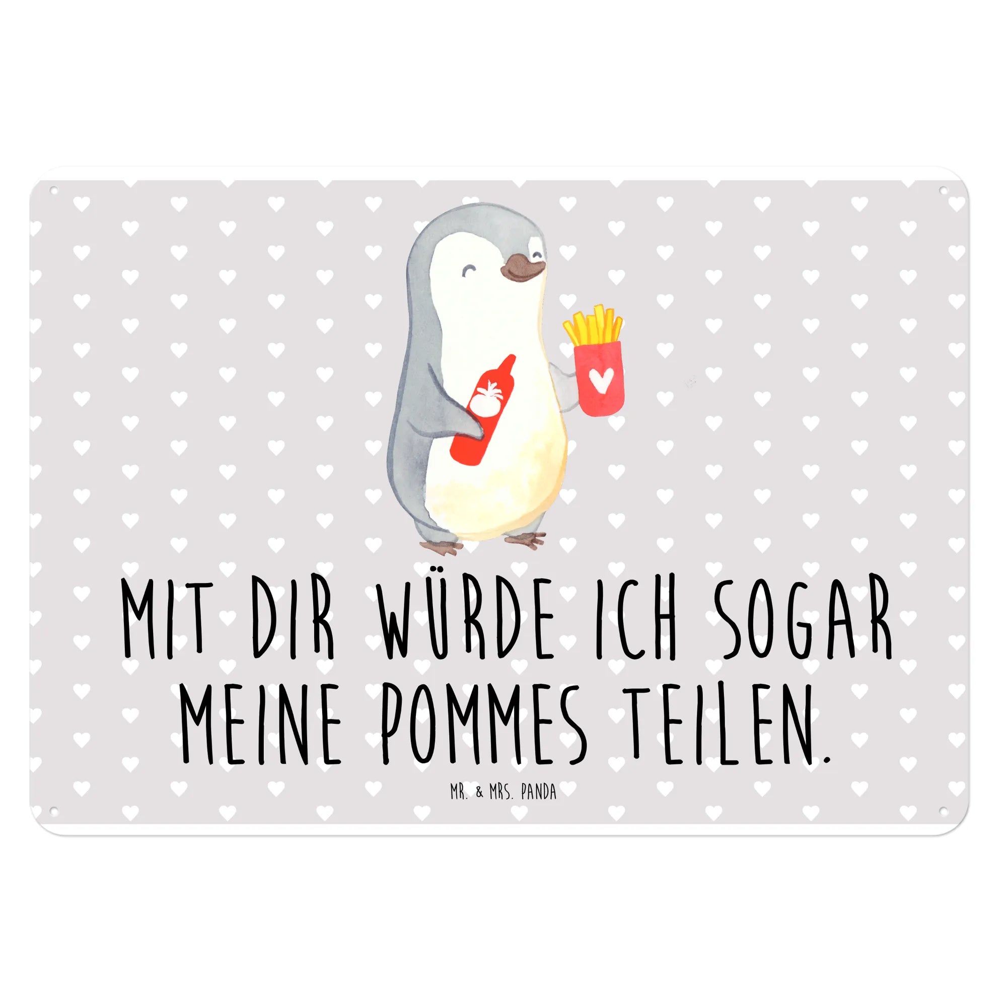 Ein wunderschönes und edles Blechschild von Mr. & Mrs. Panda, perfekt für alle, die ihren Lieblingsmenschen eine Freude machen möchten! Das Motiv mit dem glücklichen Pinguin, der mit seinen Pommes Frites und einer Flasche Ketchup einen liebevollen Ausdruck eurer Zuneigung vermittelt, ist einfach bezaubernd. Mit dem Spruch: 'Mit dir würde ich sogar meine Pommes teilen.' verwandelt dieses Schild jede Wand in ein Liebesbekenntnis.