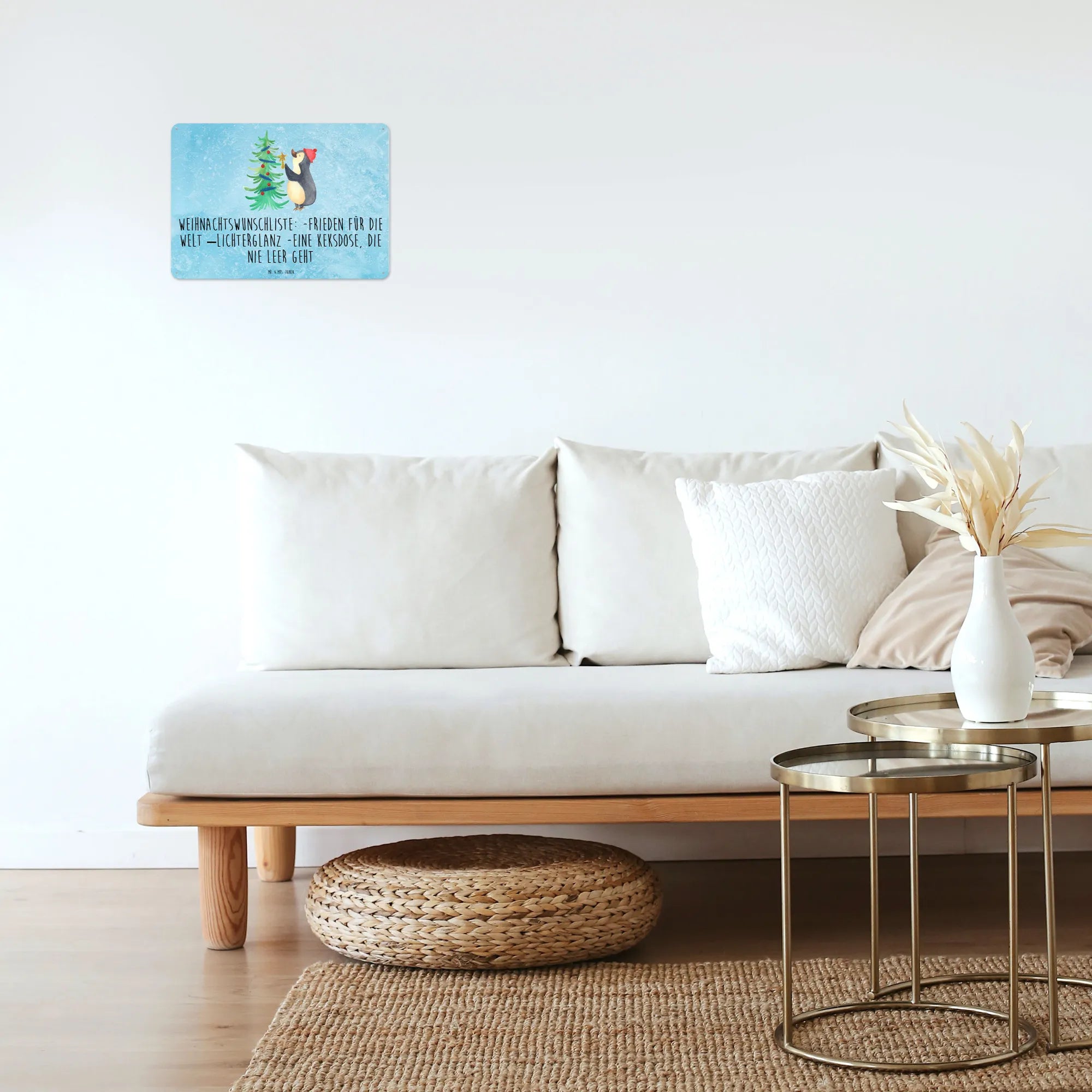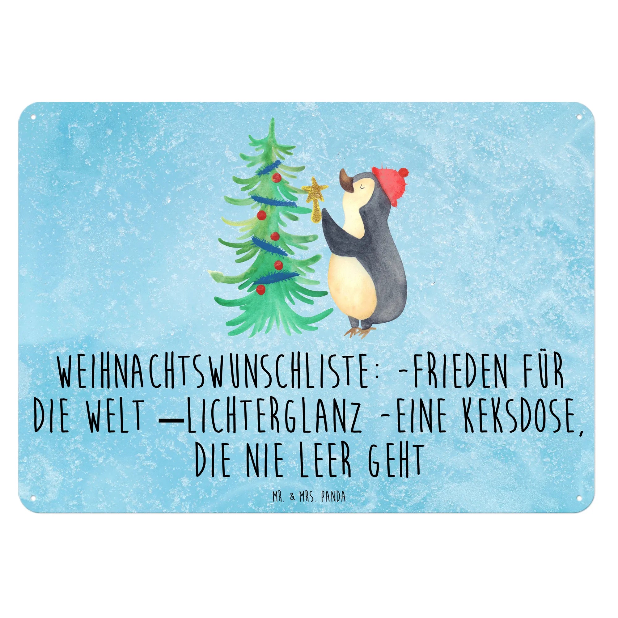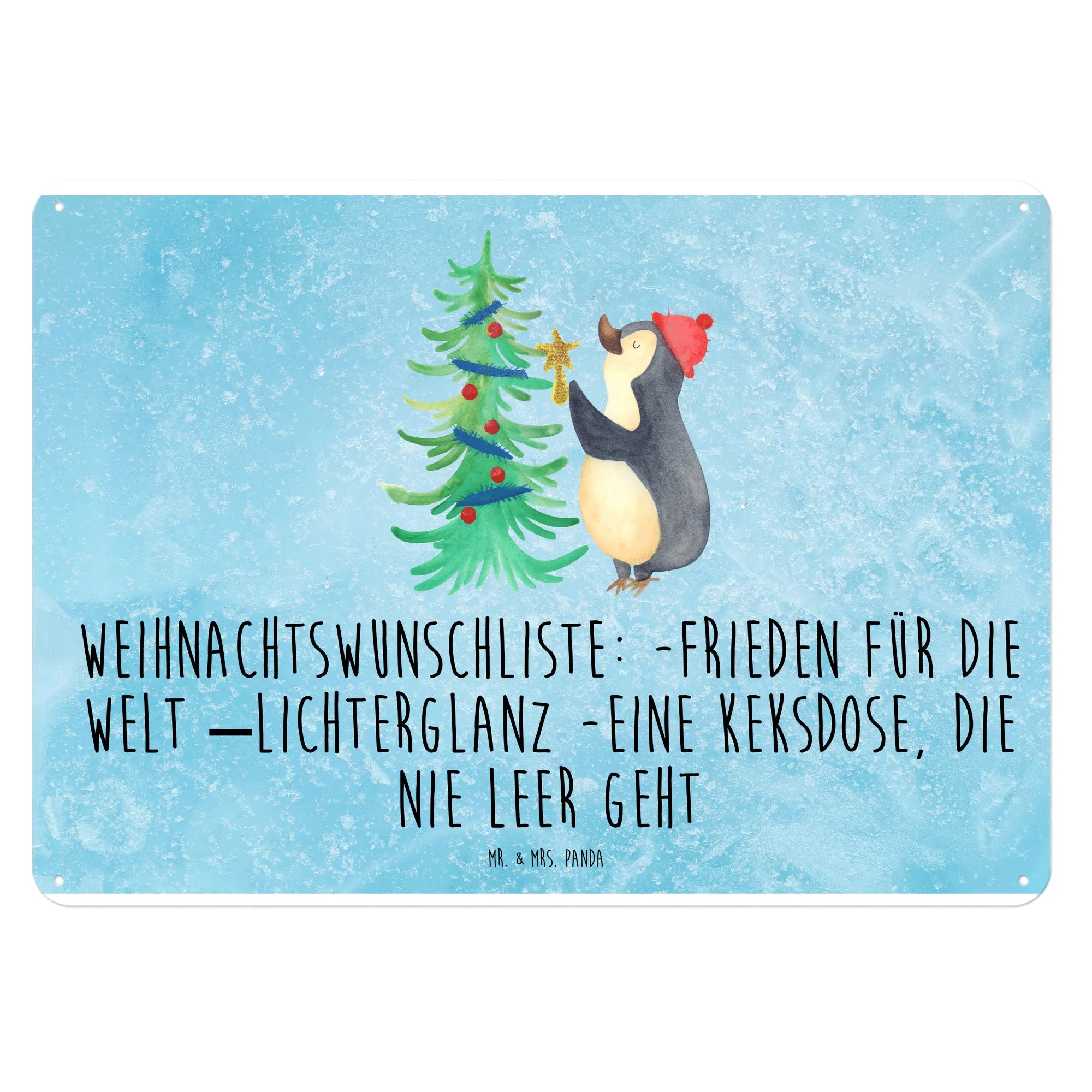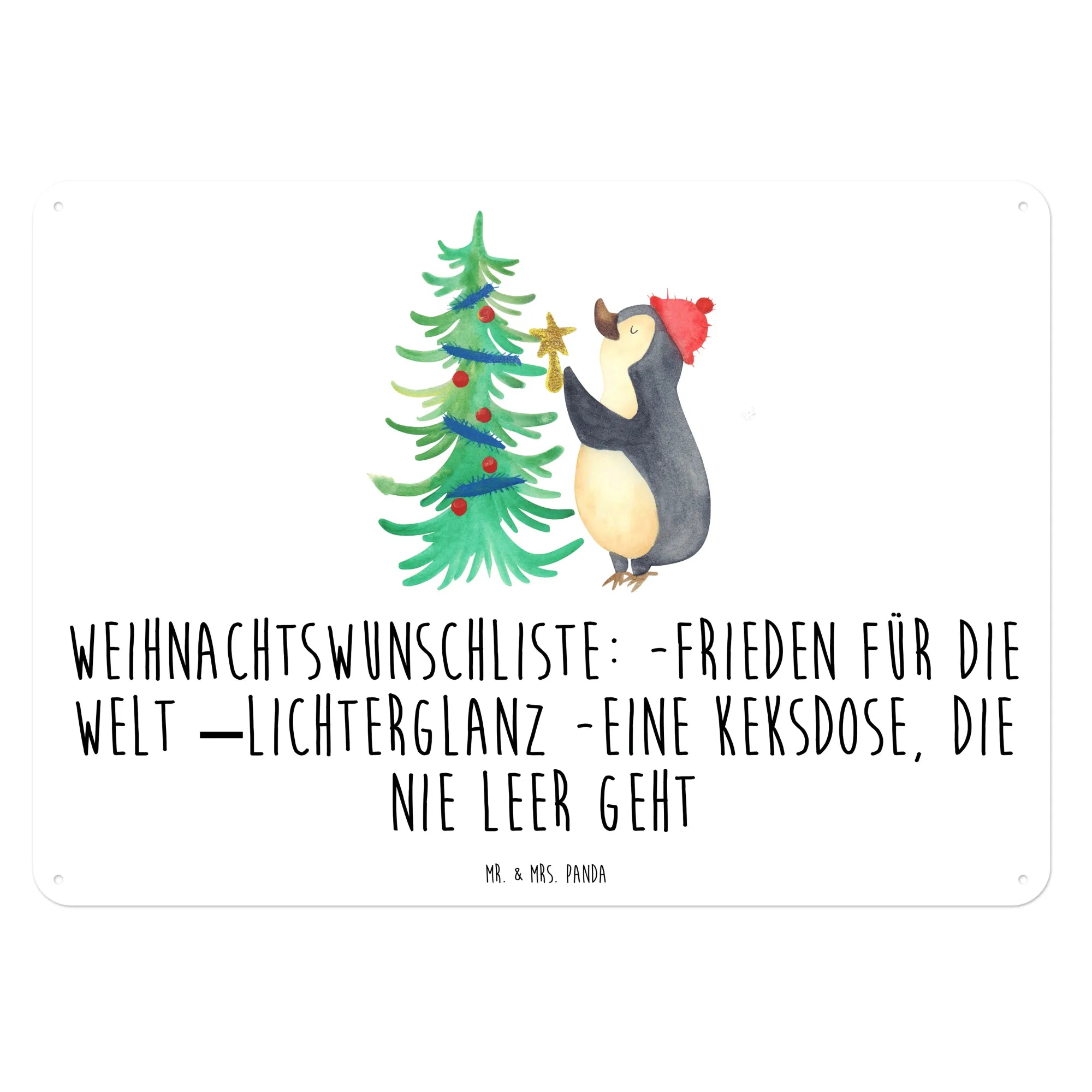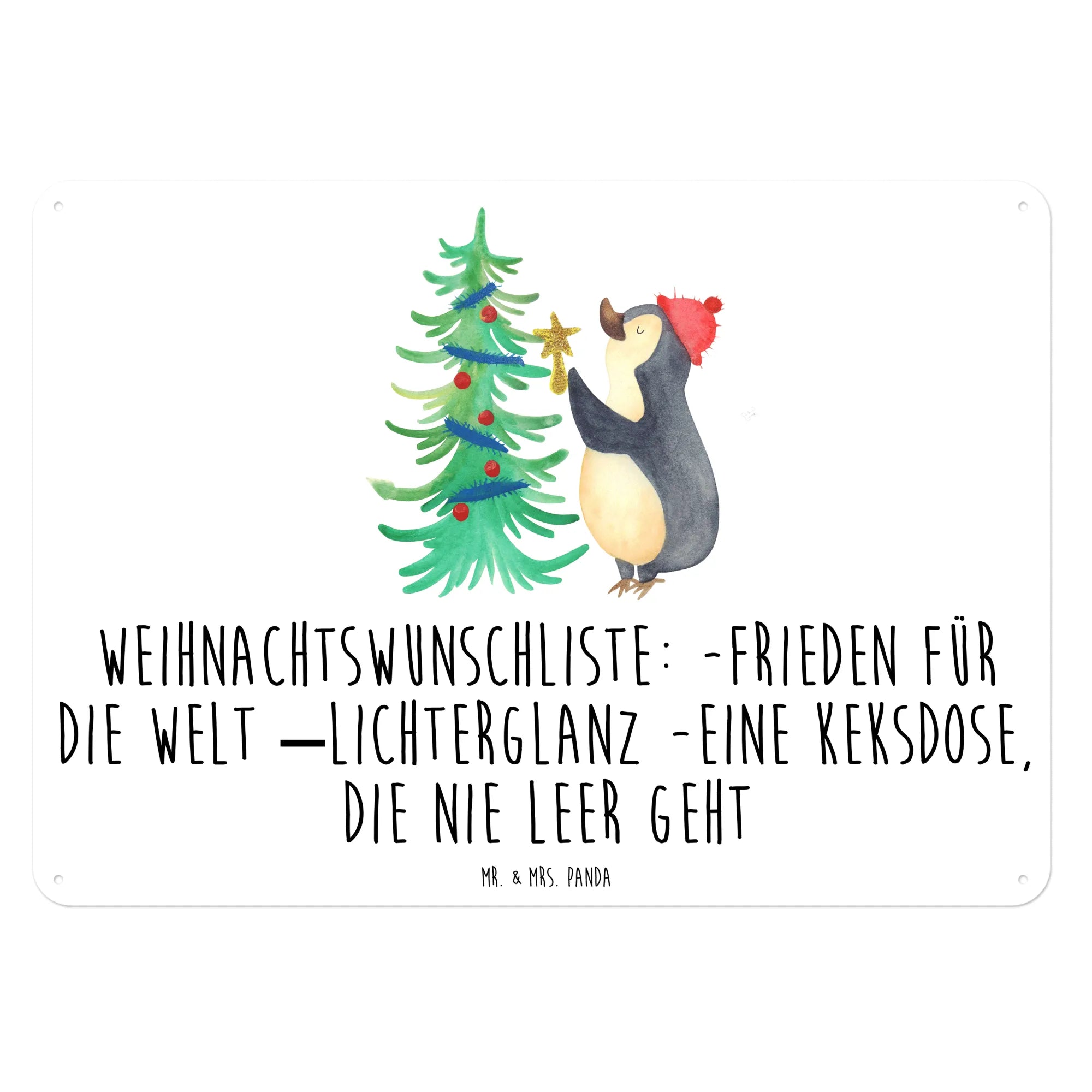Das Blechschild mit dem süßen Pinguin und dem Weihnachtsbaum von Mr. & Mrs. Panda ist das perfekte Geschenk für alle, die die winterliche Jahreszeit und die Vorfreude auf Weihnachten lieben. Dieses edle Metallschild verleiht jedem Raum eine fröhliche und festliche Note und erinnert uns an die zauberhaften Momente der Weihnachtszeit. Das Motiv zeigt einen niedlichen Pinguin, der begeistert einen Weihnachtsbaum schmückt und für besonders viel Freude sorgt. Mit der Slogan 'Weihnachtswunschliste: Frieden für die Welt, Lichterglanz und eine Keksdose, die niemals leer geht' bringt es die perfekte Botschaft für die besinnliche Zeit des Jahres mit.