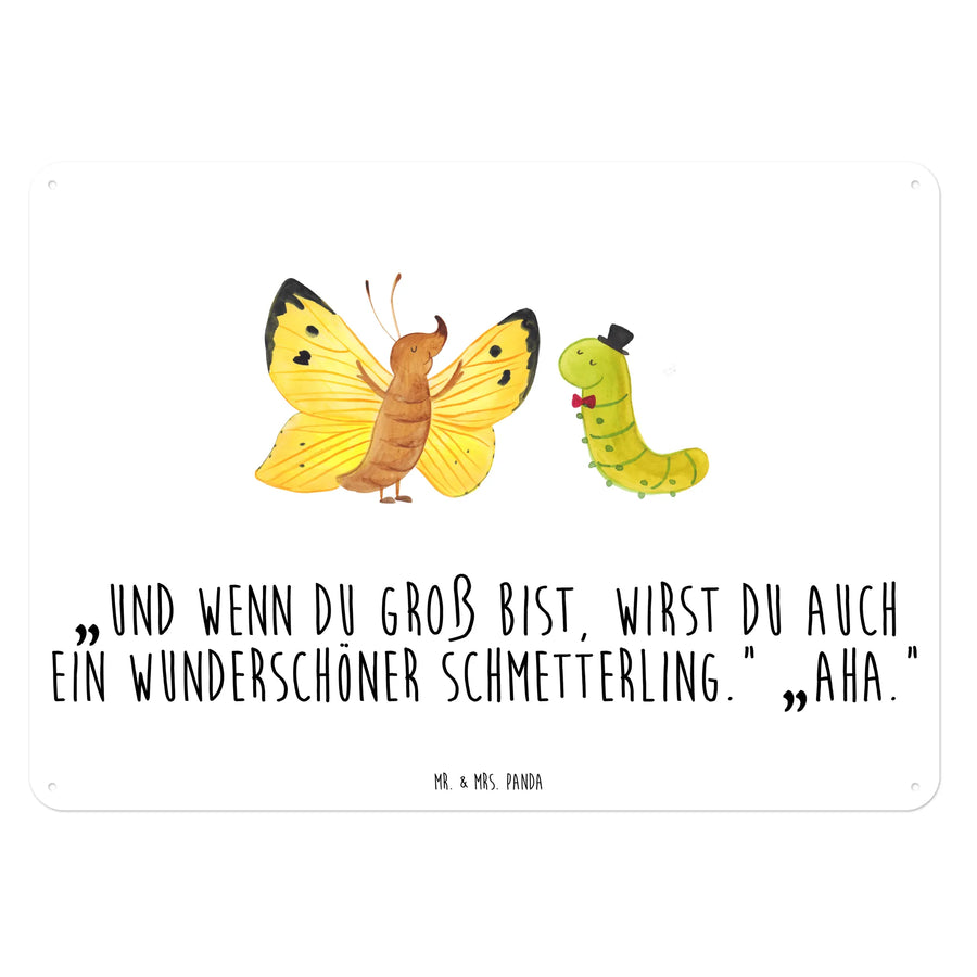 Entdecke das bezaubernde Blechschild "Raupe & Schmetterling" aus der liebevollen Small World Kollektion von Mr. & Mrs. Panda!