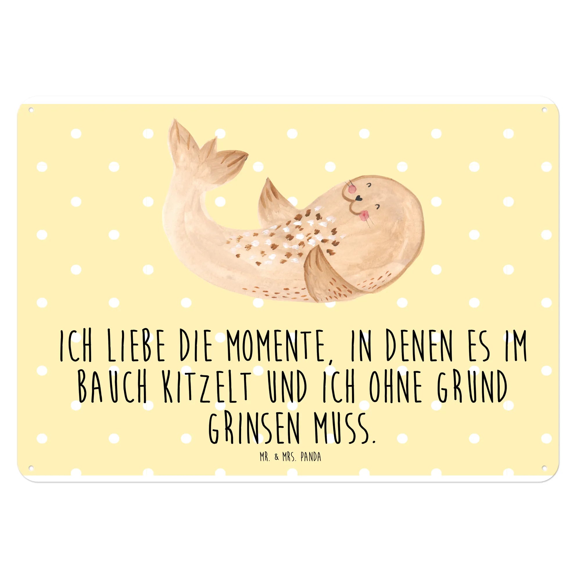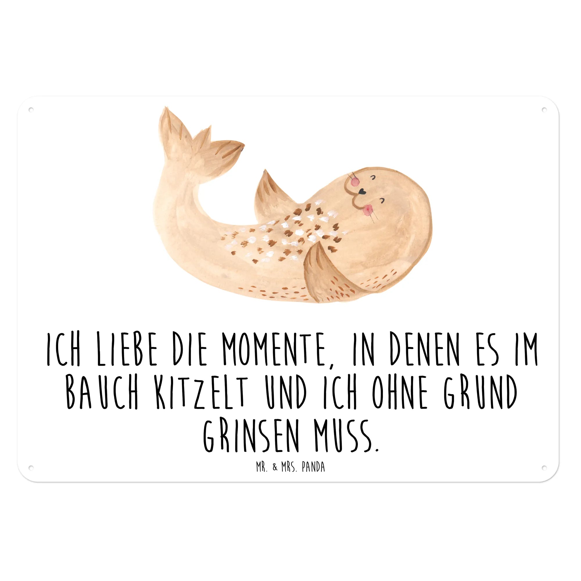 Das wunderschöne Blechschild 'Robbe liegend' von Mr. & Mrs. Panda ist der perfekte kleine Begleiter für all die Momente, in denen Du Dich einfach einmal zurücklehnen und das Leben genießen möchtest. Diese charmante Robbe mit dem freudigen Gesichtsausdruck bringt sofort gute Laune in jeden Raum und erinnert uns daran, dass es wichtig ist, sich Auszeiten zu gönnen. Das Schild trägt den liebevollen Spruch: 'Ich liebe die Momente, in denen es im Bauch kitzelt und ich ohne Grund grinsen muss.'