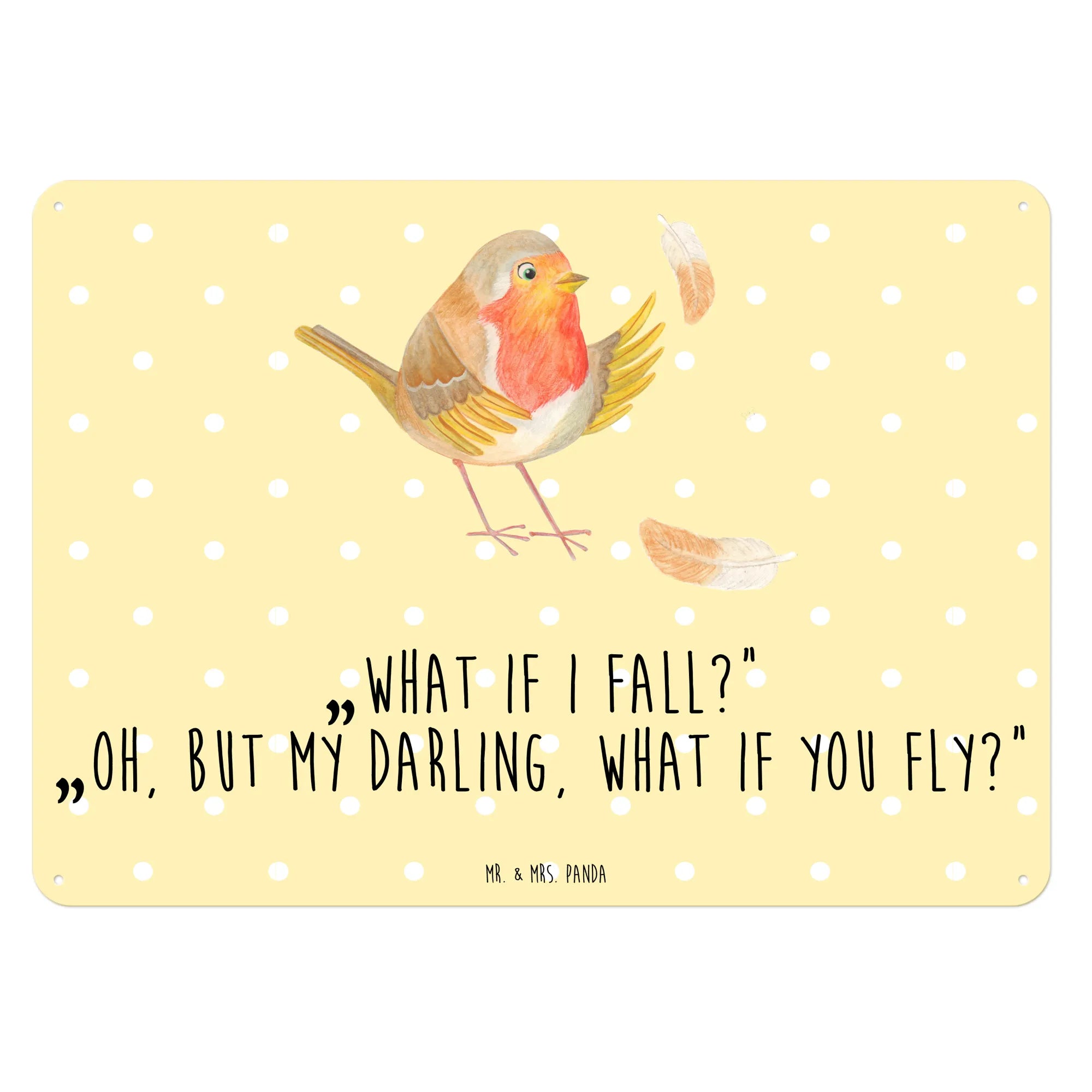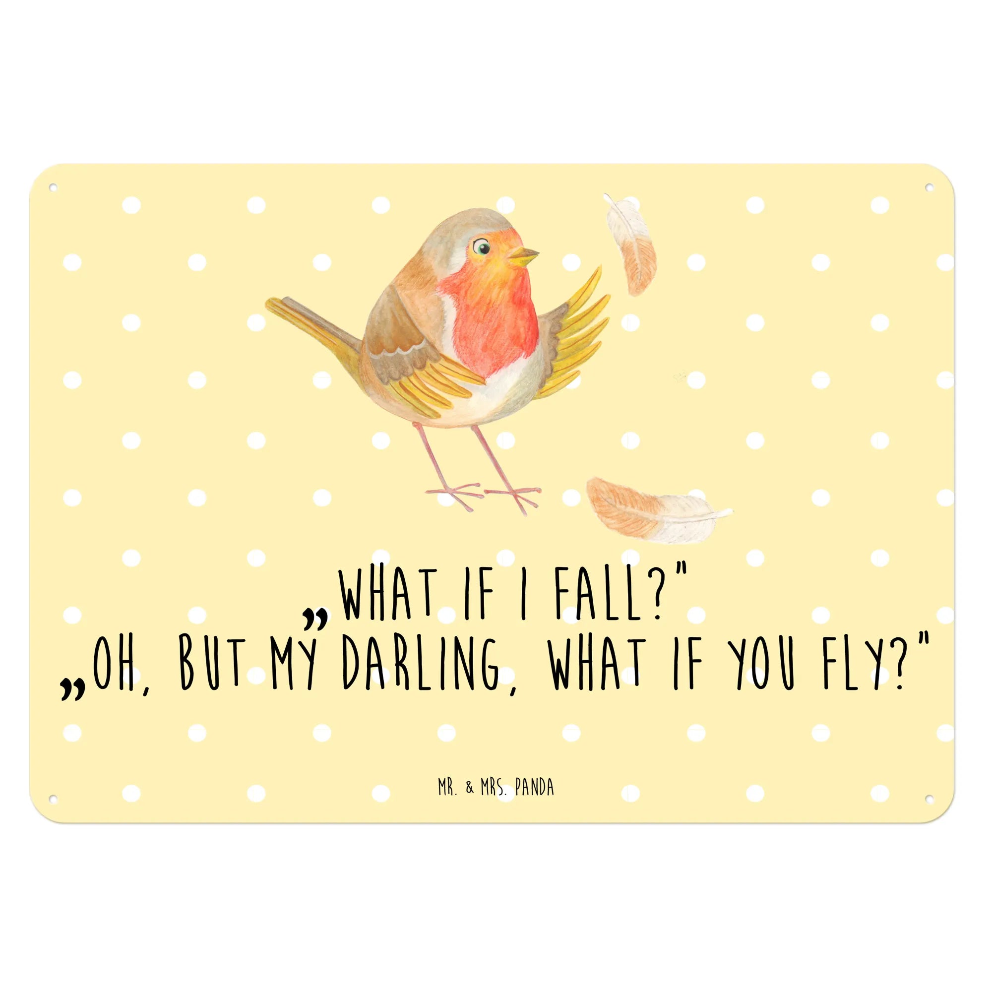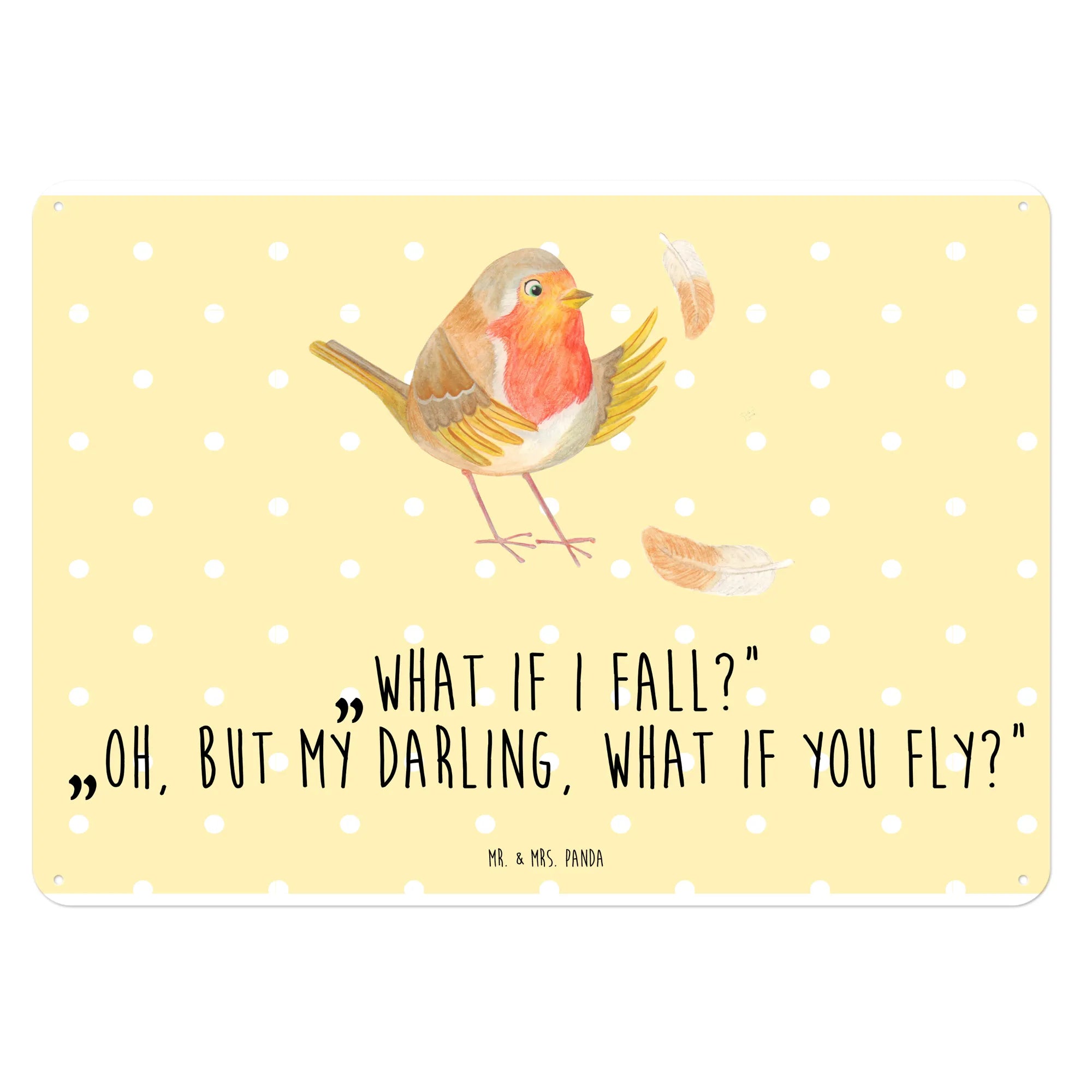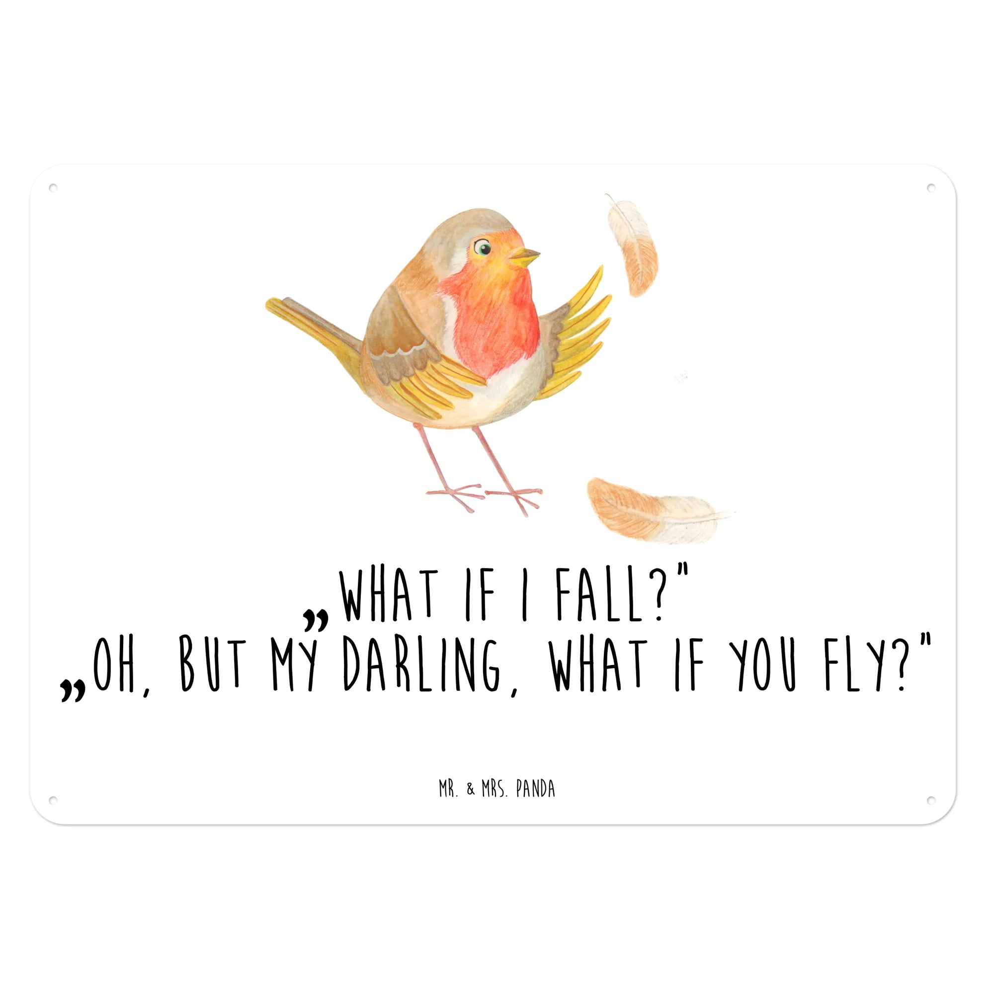 Ein zauberhaftes Blechschild von Mr. & Mrs. Panda – das Rotkehlchen mit Federn aus der Small World Kollektion verzaubert mit zarten Aquarelltönen und einem kraftvollen Spruch. Auf dem Dekoschild Metall sitzt ein niedliches Rotkehlchen, umgeben von bunten Federn. Der Text „What if I fall?“ „Oh, but my darling, what if you fly?“ ist ein kleiner Motivationsspruch, der Mut schenkt und zum Lächeln bringt.