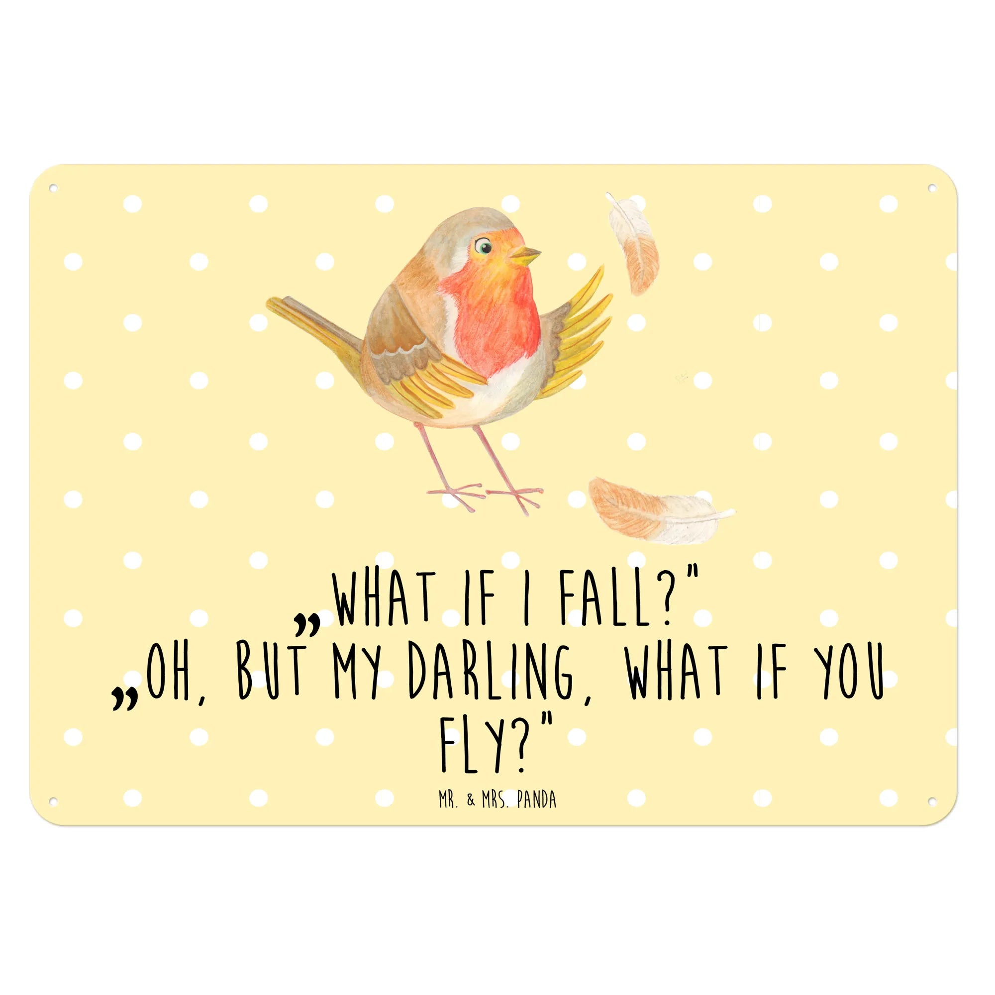 Das wunderschöne Blechschild "Rotkehlchen mit Federn" aus der Small World Kollektion von Mr. & Mrs. Panda ist ein wahrhaft zauberhaftes Geschenk für alle, die die Natur und ihre kleinen Wunder lieben. Dieses Schild, gefertigt aus hochwertigem Stahlblech, besticht durch sein niedliches Motiv und den poetischen Spruch: „What if I fall? Oh, but my darling, what if you fly?"
