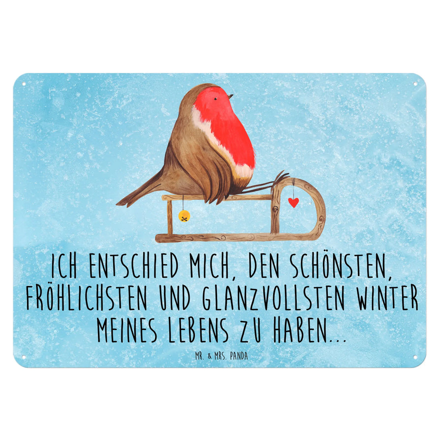 Das wunderschöne Blechschild mit dem süßen Rotkehlchen auf dem Schlitten aus der Winter Kollektion von Mr. & Mrs. Panda ist das perfekte Geschenk für die kalte Jahreszeit!