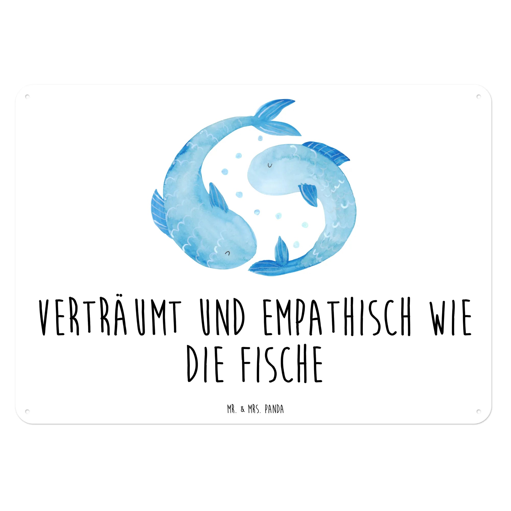 Entdecke das bezaubernde Blechschild mit dem Motiv des Sternzeichens Fische von Mr. & Mrs. Panda! Dieses hochwertige Metallschild bringt eine süße und liebevolle Note in dein Zuhause. Mit dem Slogan "Verträumt und empathisch wie die Fische" und der liebevoll handgezeichneten Darstellung von zwei Fischen, die im Wasser schwimmen, ist es der perfekte Begleiter für jeden Fische-Geburtstag.