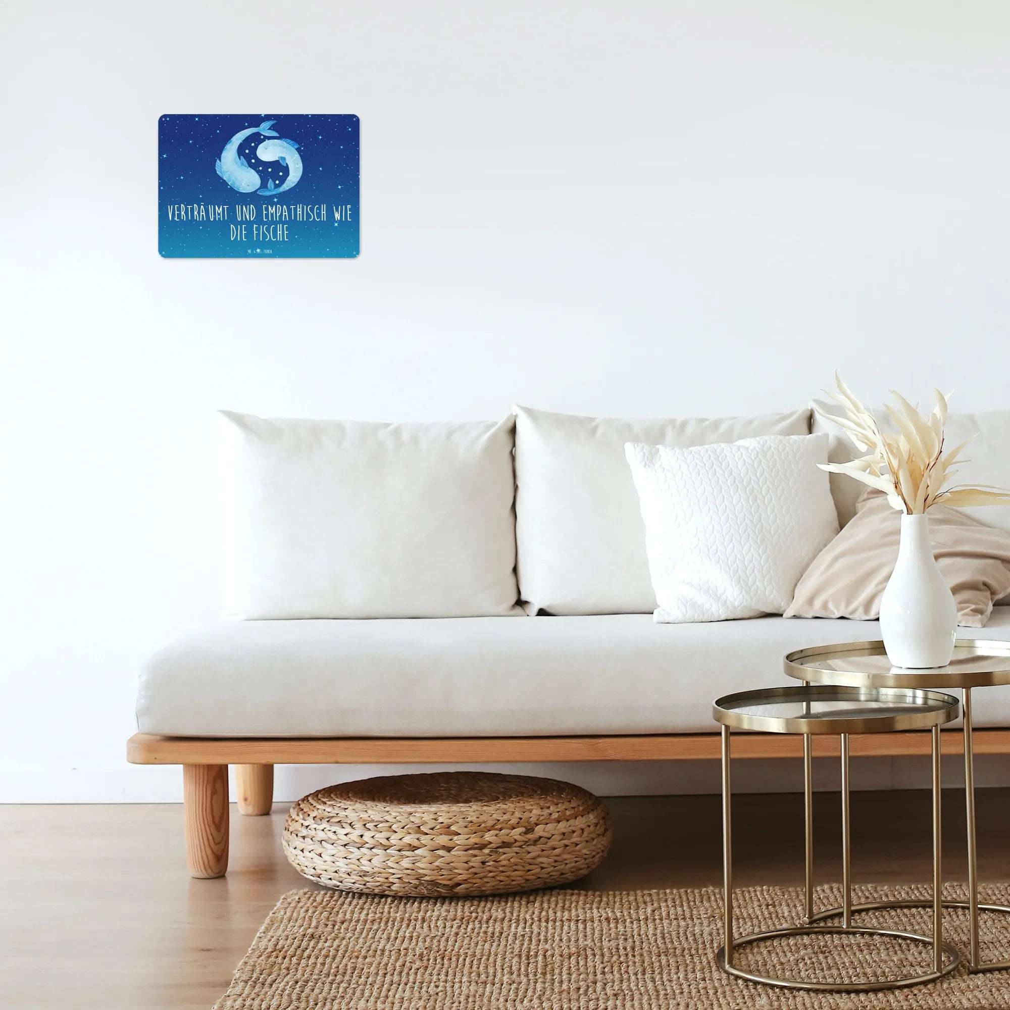 Das wunderschöne Blechschild mit dem Motiv des Sternzeichens Fische von Mr. & Mrs. Panda ist das perfekte Geschenk für all jene, die im Februar oder März Geburtstag haben oder die Fische als ihren Aszendenten oder Sonnenzeichen tragen. Mit den Worten "Verträumt und empathisch wie die Fische" bringt es eine besondere Note in jedes Zuhause und verleiht jedem Raum eine persönliche Note.
