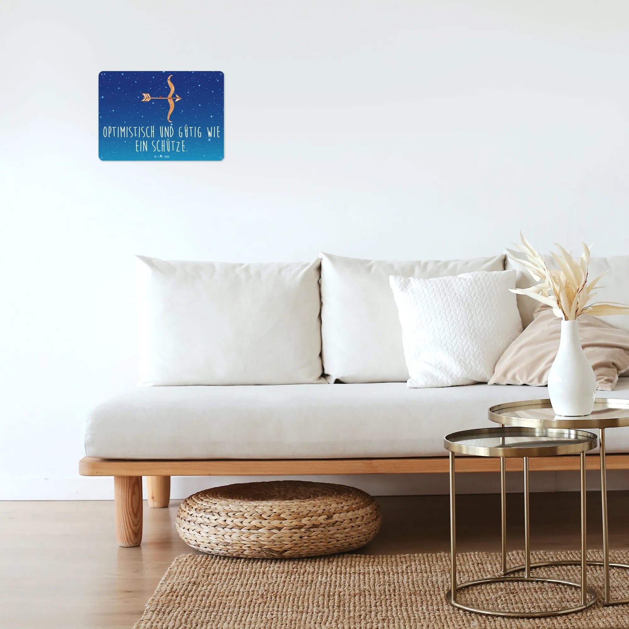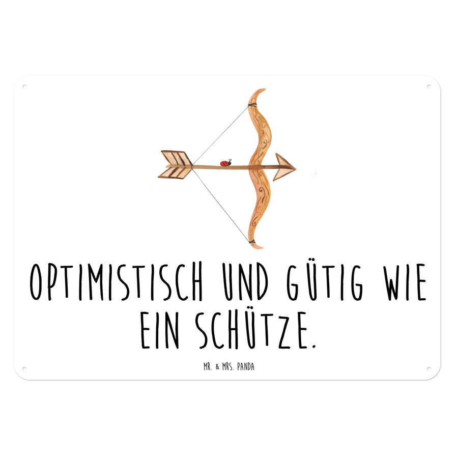 Entdecke das wunderschöne und edle Blechschild mit dem Motiv des Sternzeichens Schütze von Mr. & Mrs. Panda. Dieses einzigartige Deko-Schild begeistert nicht nur durch sein liebevoll gestaltetes Design, sondern auch durch die Botschaft: 'Optimistisch und gütig wie ein Schütze.'