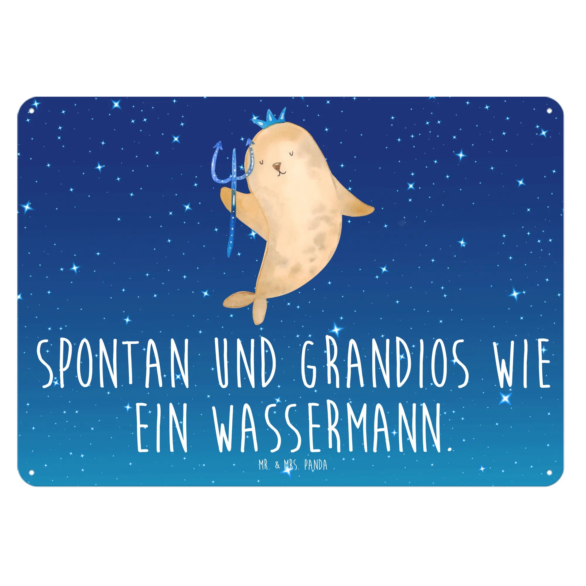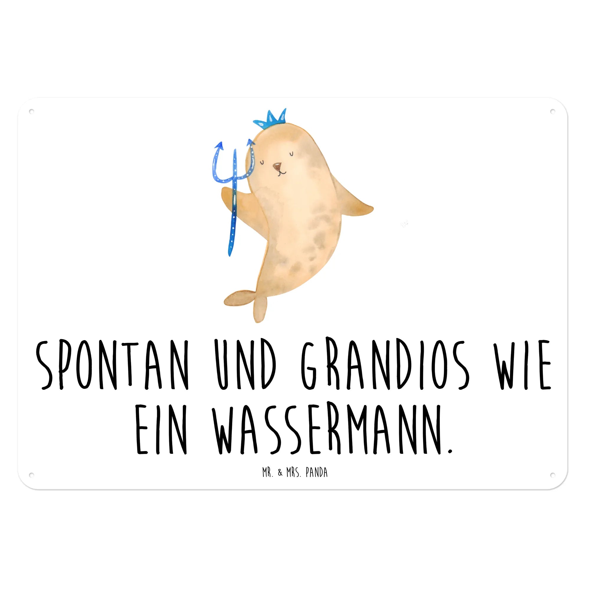 Das wunderschöne Blecht Schild mit dem Motiv des Wassermanns von Mr. & Mrs. Panda ist das perfekte Geschenk für alle, die im Januar oder Februar geboren wurden. Mit dem liebevoll handgezeichneten Design und dem Spruch "Spontan und grandios wie ein Wassermann" bringt es jeden in gute Laune.