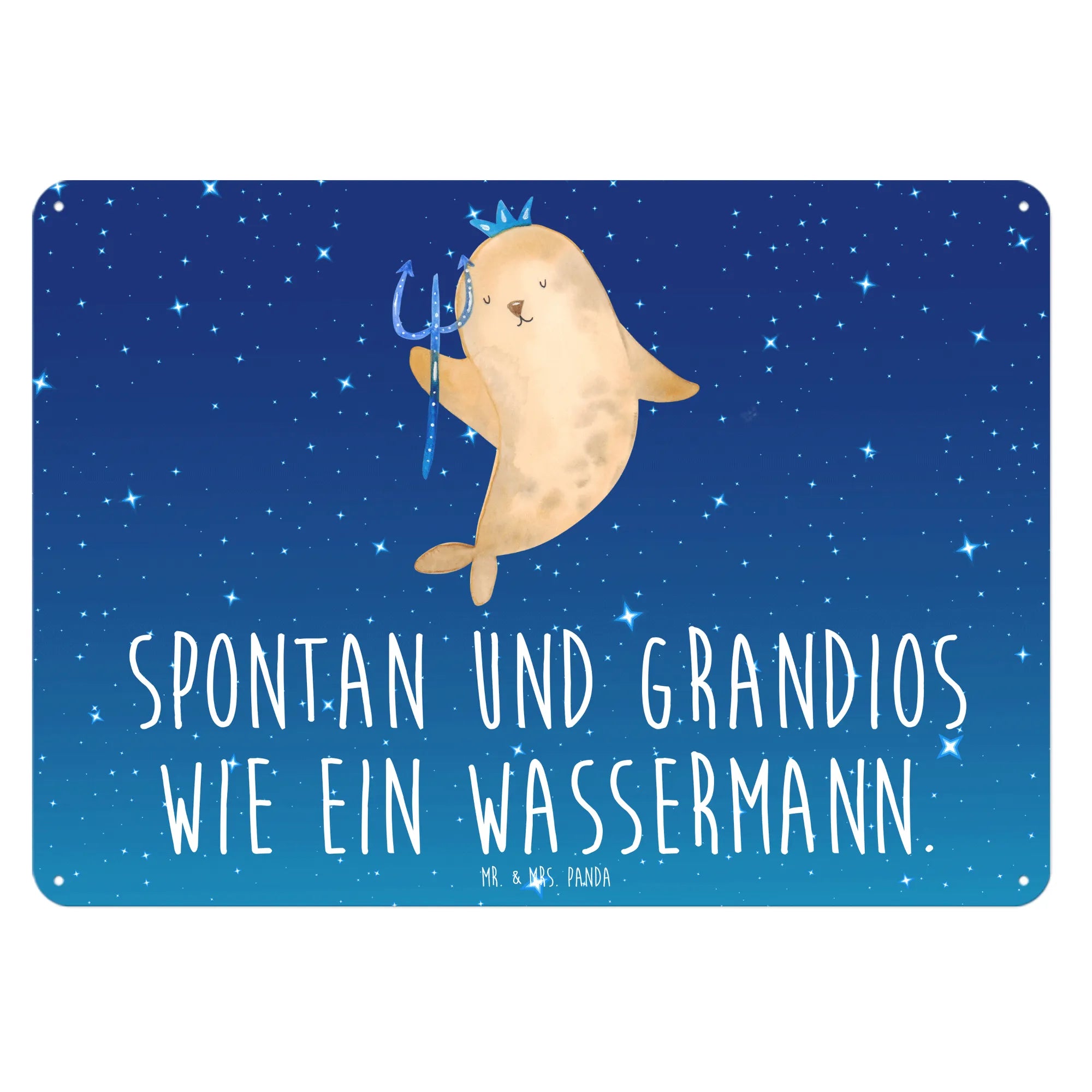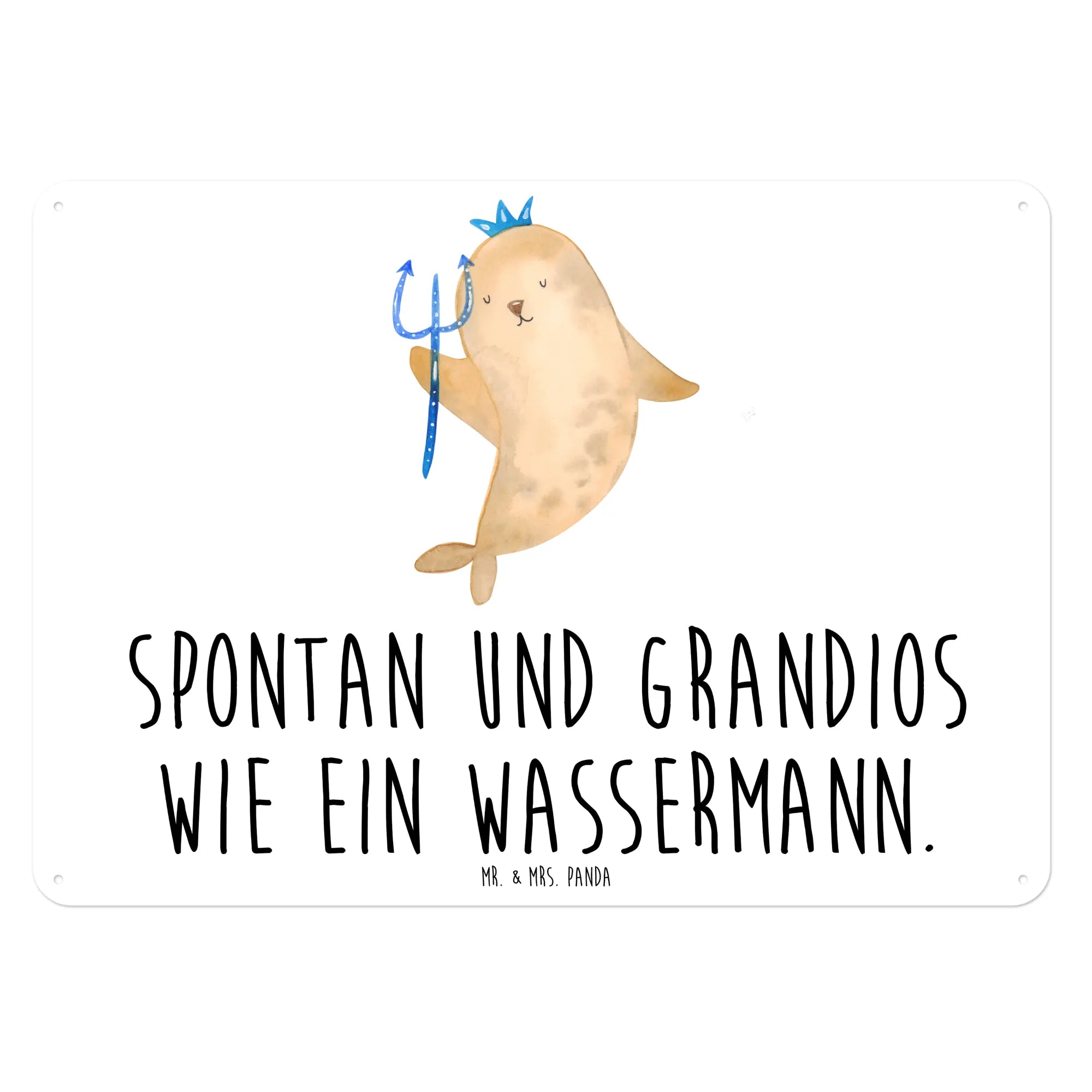 Entdecke unser wunderschönes Blechschild mit dem Motiv 'Sternzeichen Wassermann' von Mr. & Mrs. Panda. Dieses einzigartig gestaltete Metallschild ist perfekt geeignet als liebevolles Geschenk oder zur eigenen Dekoration. Es zeigt einen süßen Wassermann, der mit einem Dreizack ausgestattet ist und seine spontane und grandiose Persönlichkeit repräsentiert.