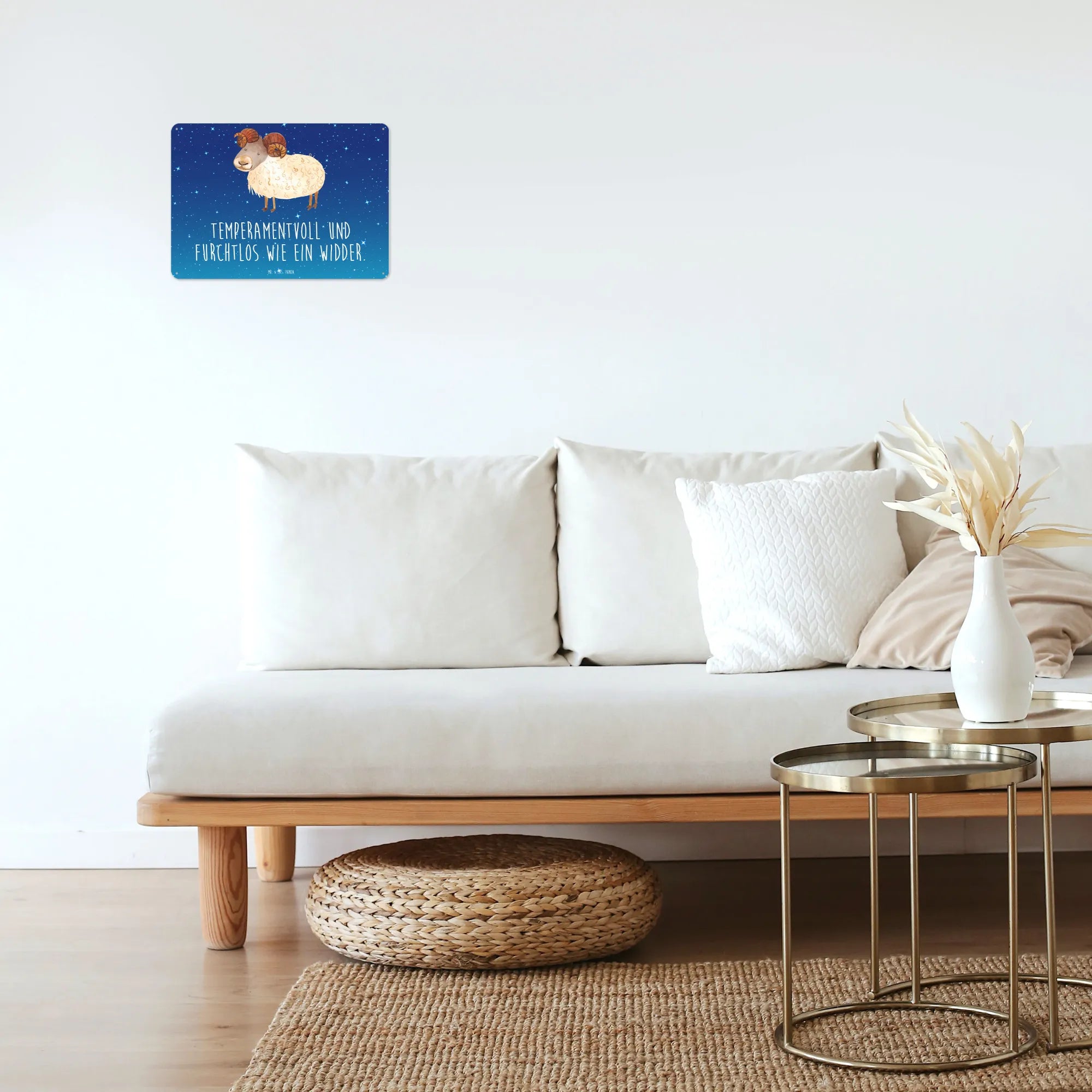 Entdecke das bezaubernde Blechschild ‚Sternzeichen Widder‘ von Mr. & Mrs. Panda, das die Herzen von Astrologie- und Tierkreiszeichen-Liebhabern höherschlagen lässt! Mit der liebevollen Botschaft „Temperamentvoll und furchtlos wie ein Widder“ bringt dieses edle Schild eine Portion Lebensfreude in jedes Zuhause.