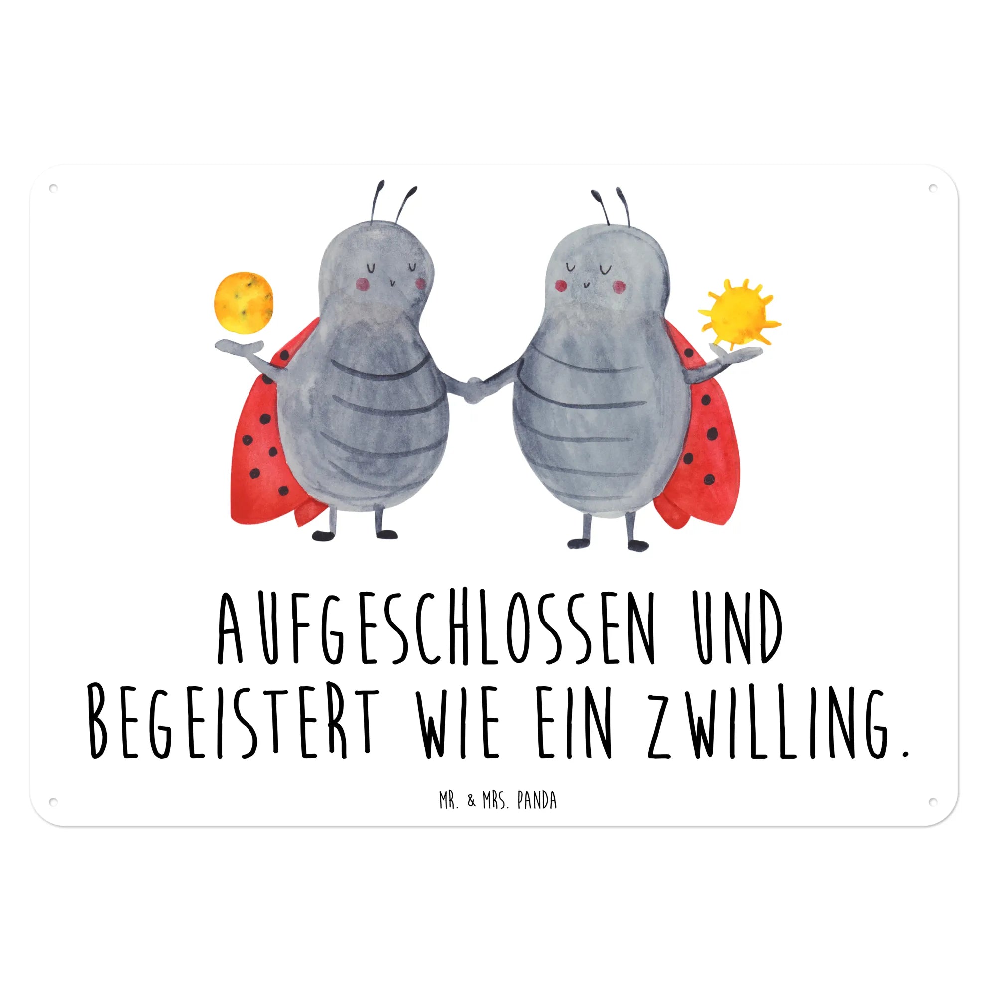 Mr. & Mrs. Panda Blechschild Sternzeichen Zwilling – bezaubernd, frech und voller Persönlichkeit. Unser Wandschild zeigt zwei süße Marienkäfer als Zwillinge und den liebevollen Spruch „Aufgeschlossen und begeistert wie ein Zwilling.“ Es ist das ideale Geschenk für alle, die im Mai oder Juni Geburtstag haben, für Zwillingsschwestern und Zwillingsbrüder oder einfach für Menschen, die den Zwilling im Herzen tragen.