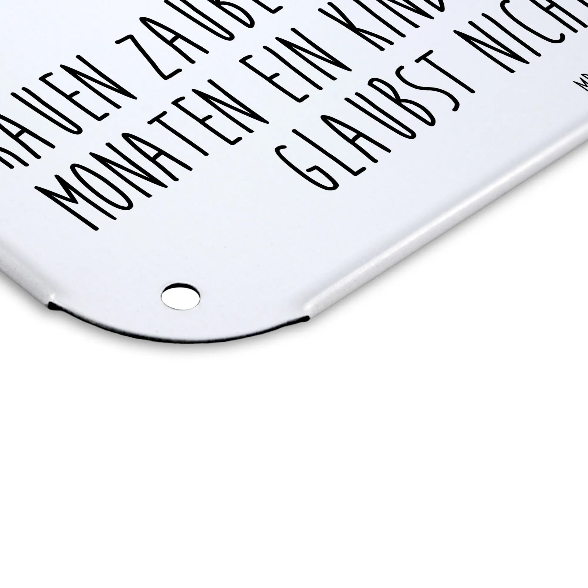 Das Blechschild mit dem niedlichen Motiv eines Storches von Mr. & Mrs. Panda ist das perfekte Geschenk für werdende Mütter, frischgebackene Eltern oder als Deko-Element zur Ankündigung einer Schwangerschaft. Es zeigt einen süßen Storch, der ein Baby in einem Tuch trägt, und darunter steht der liebevolle Spruch: "Frauen zaubern aus einem Samen in nur 9 Monaten ein Kind in ihrem Bauch und du glaubst nicht an Wunder?" Dieses Schild ist ideal, um Freude und Gute Laune zu verbreiten.