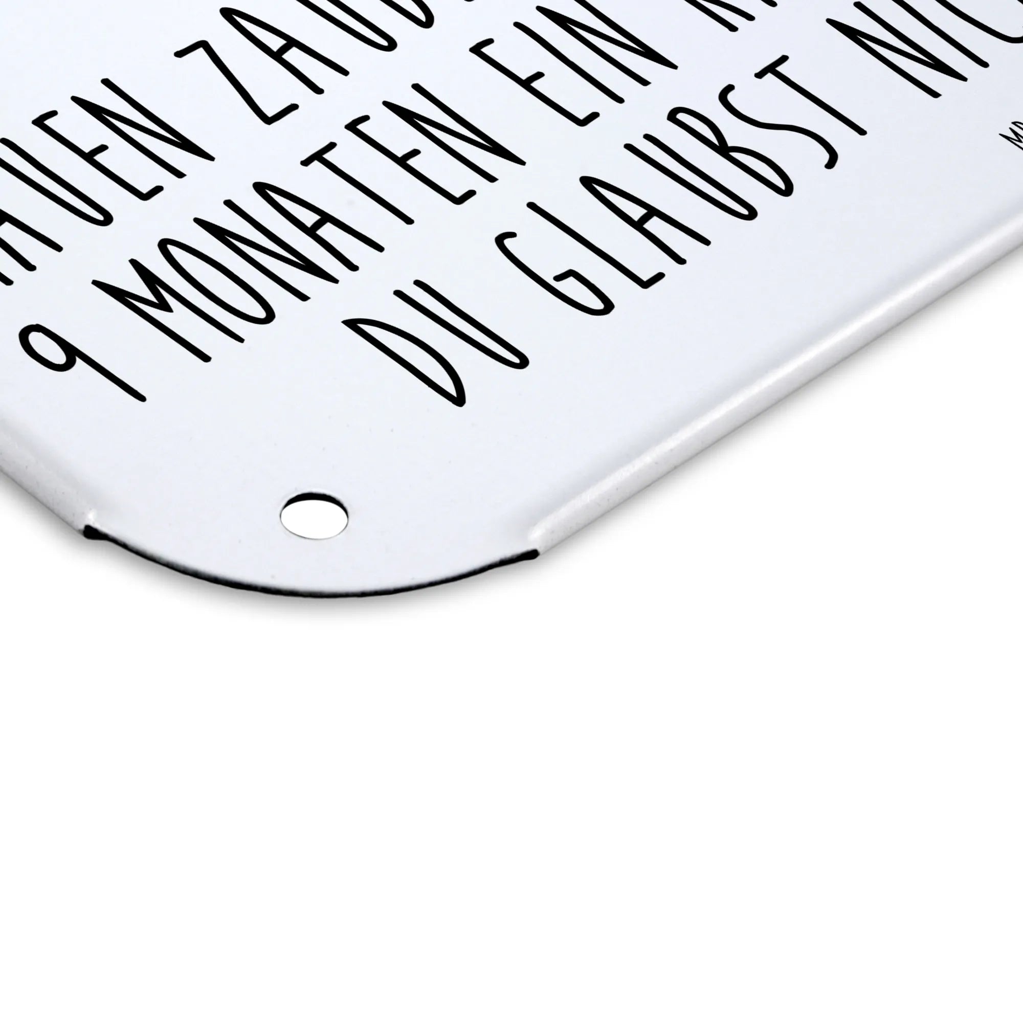 Entdecke das zauberhafte Blechschild mit einem süßen Storch aus der Small World Kollektion von Mr. & Mrs. Panda! Dieses dekorative Metallschild ist nicht nur ein wunderbares Accessoire für dein Zuhause, sondern auch das perfekte Geschenk für werdende Mütter und frischgebackene Eltern. Der liebevoll illustrierte Storch, der ein Baby in einem Tuch trägt, ist nicht nur ein niedlicher Blickfang, sondern erzählt auch die Geschichte der Schwangerschaft und Geburt auf eine ganz besondere Art. Mit dem Slogan 'Frauen zaubern aus einem Samen in nur 9 Monaten ein Kind in ihrem Bauch und du glaubst nicht an Wunder?' sprichst du nicht nur die Herzen der Mütter an, sondern zauberst allen ein Lächeln ins Gesicht.