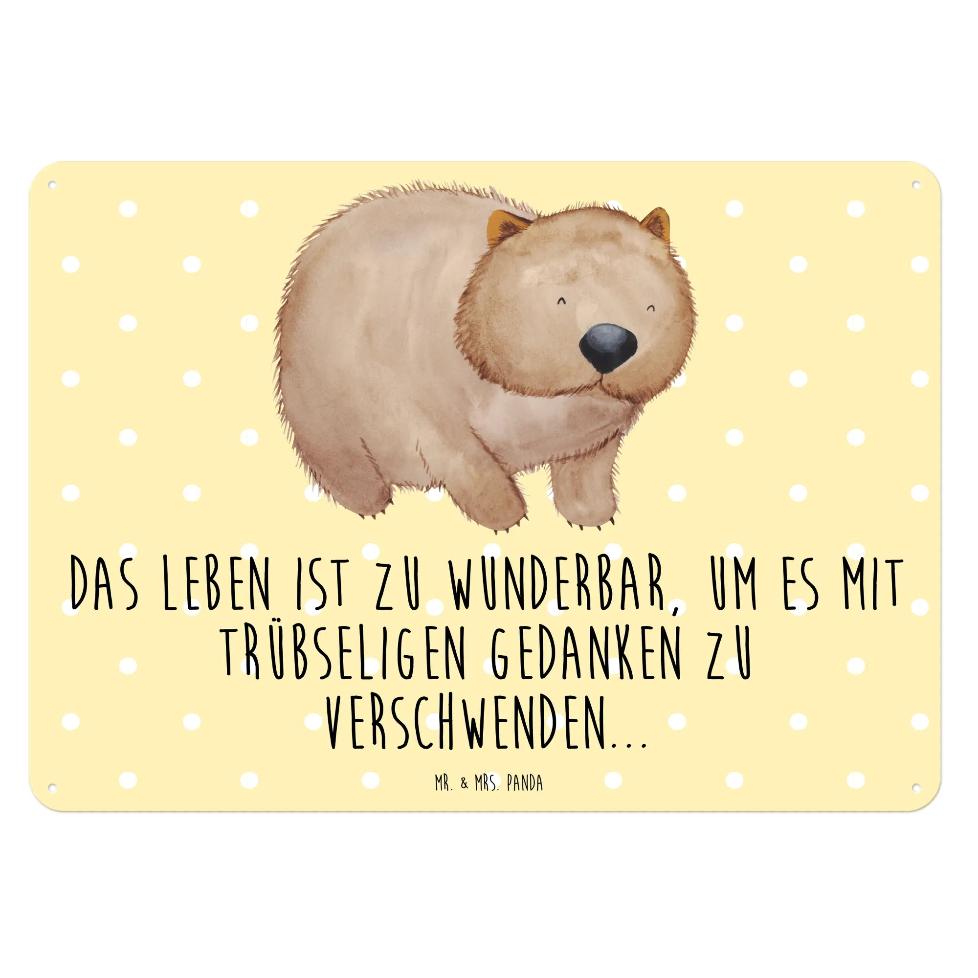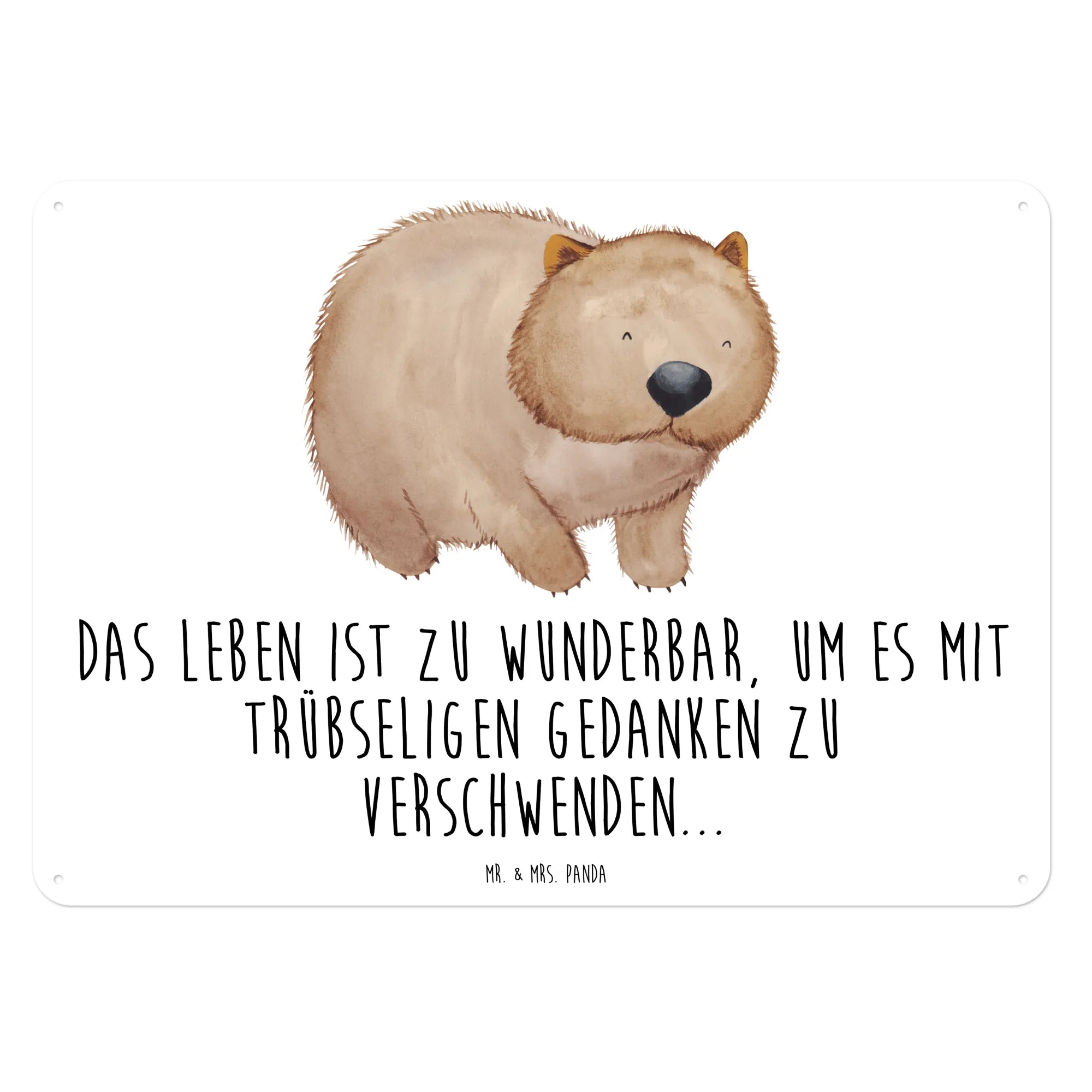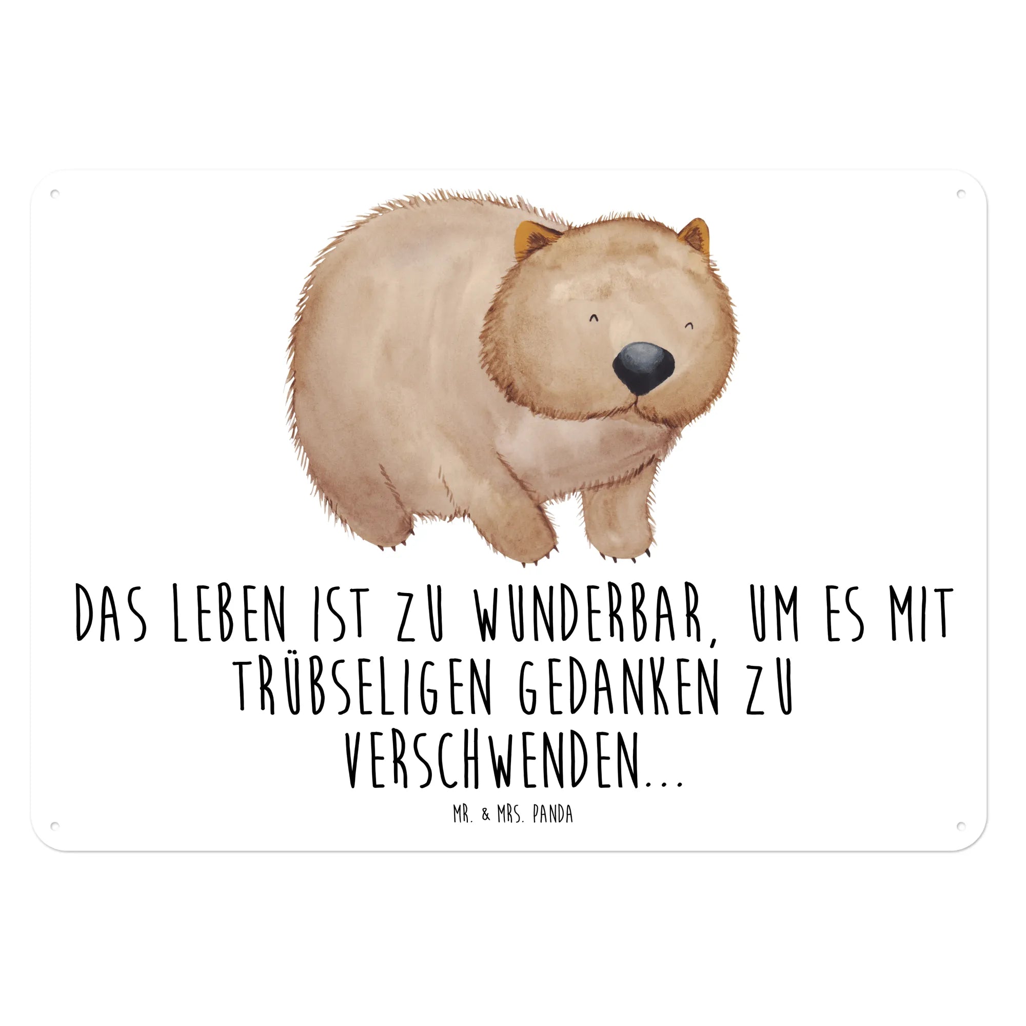 Mach jetzt Schluss mit trübseligen Gedanken und umgebe dich mit dieser fröhlichen Wanddekoration. Hol dir das Wombat Blechschild von Mr. & Mrs. Panda und bring einen Hauch von Freude in dein Leben!