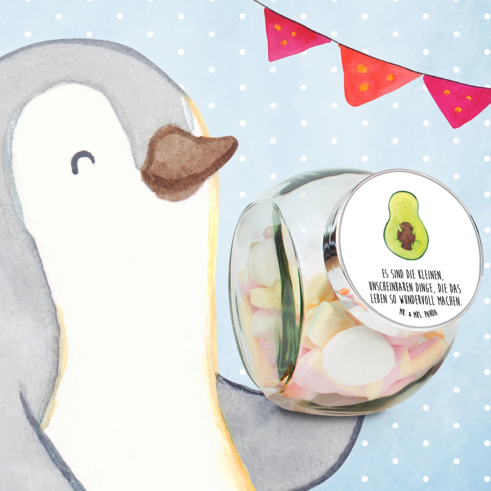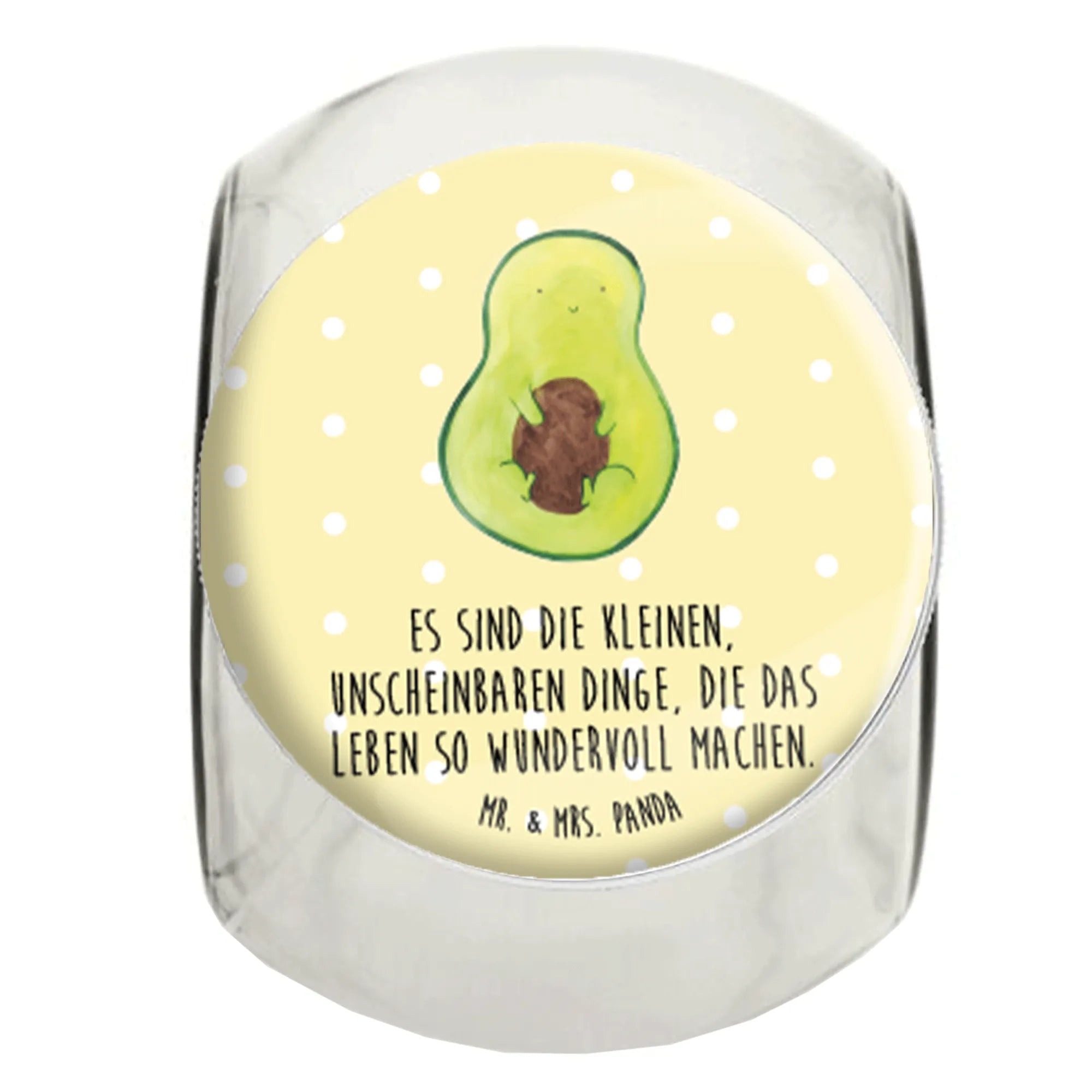 Die niedliche Avocado, handgezeichnet von Mrs. Panda, strahlt Optimismus und Positivität aus. Der dazugehörige Spruch "Es sind die kleinen, unscheinbaren Dinge, die das Leben so wundervoll machen" spricht viele an und macht dieses Bonbonglas zum perfekten Geschenk für deine Liebsten oder für dich selbst.