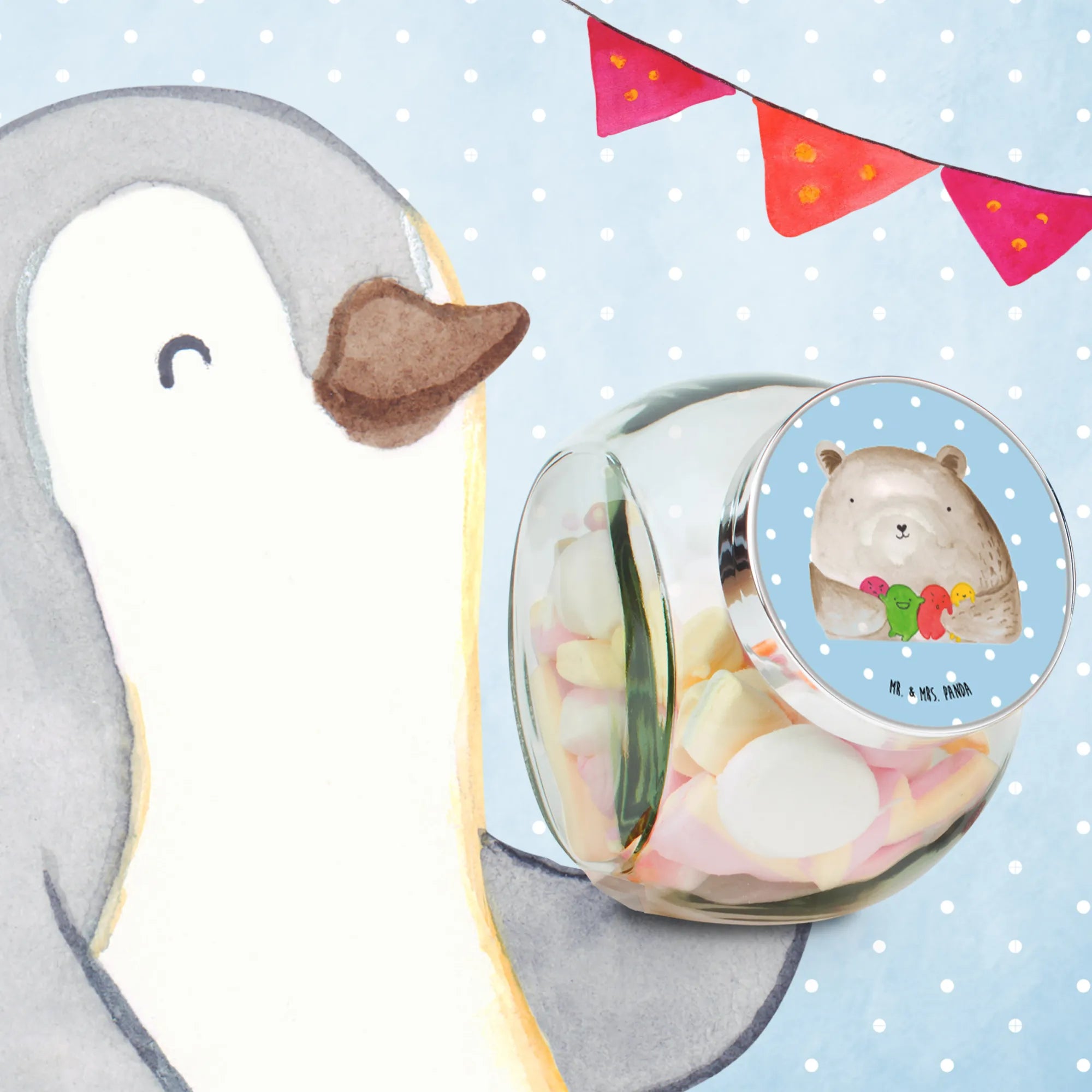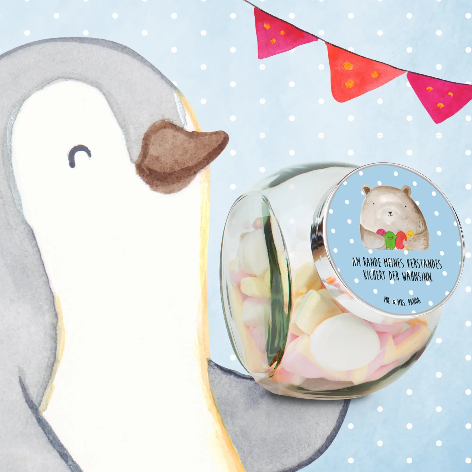 Das wunderschöne Bonbonglas mit dem Motiv "Bär Gefühl" von Mr. & Mrs. Panda ist einfach das perfekte Geschenk für alle, die das Besondere lieben. Egal, ob für besondere Anlässe oder einfach zum Selberbehalten, dieses Glas bringt nicht nur Stil, sondern auch jede Menge Freude in dein Zuhause!