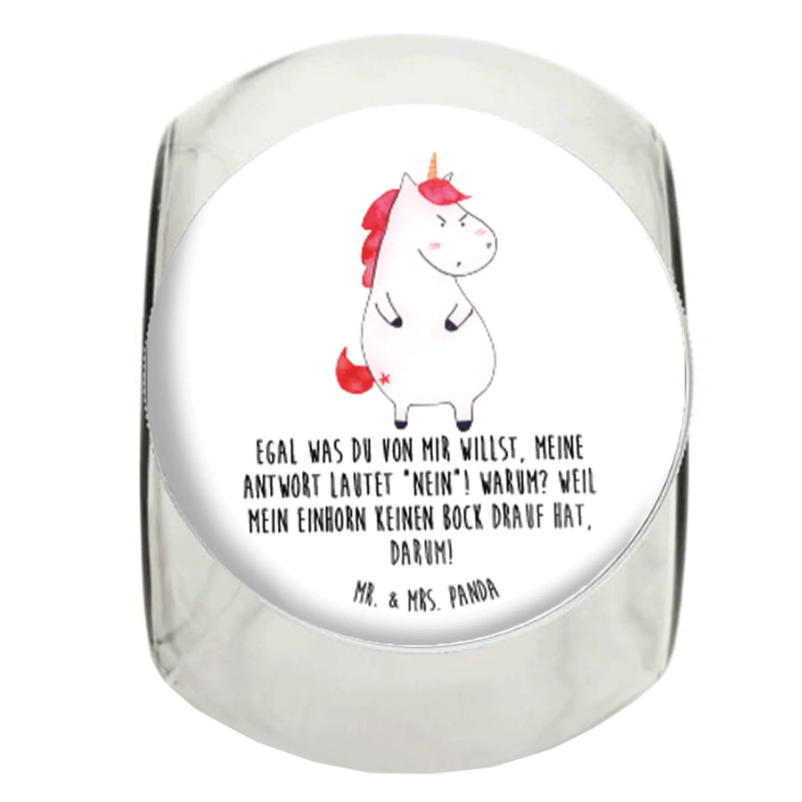 Das wütende Einhorn Bonbonglas von Mr. & Mrs. Panda ist ein Muss für alle, die Einhörner lieben und gleichzeitig eine klare Ansage machen wollen. Dieses 870 ml große Vorratsglas ist nicht nur praktisch, sondern auch ein echter Hingucker in deiner Küche oder im Büro! Mit dem zauberhaften Motiv eines wütenden Einhorns ist es nicht nur ein Aufbewahrungsbehälter für Süßigkeiten, Kekse, Müsli oder Tee, sondern auch ein sehr amüsantes Statement, besonders wenn du keine Lust auf dumme Fragen hast. Der Spruch "Egal was du von mir willst, meine Antwort lautet 'Nein'!" lässt bei jedem, der das Glas sieht, ein Lächeln über die Lippen kommen und sorgt dafür, dass du in jeder Situation gelassen bleiben kannst.