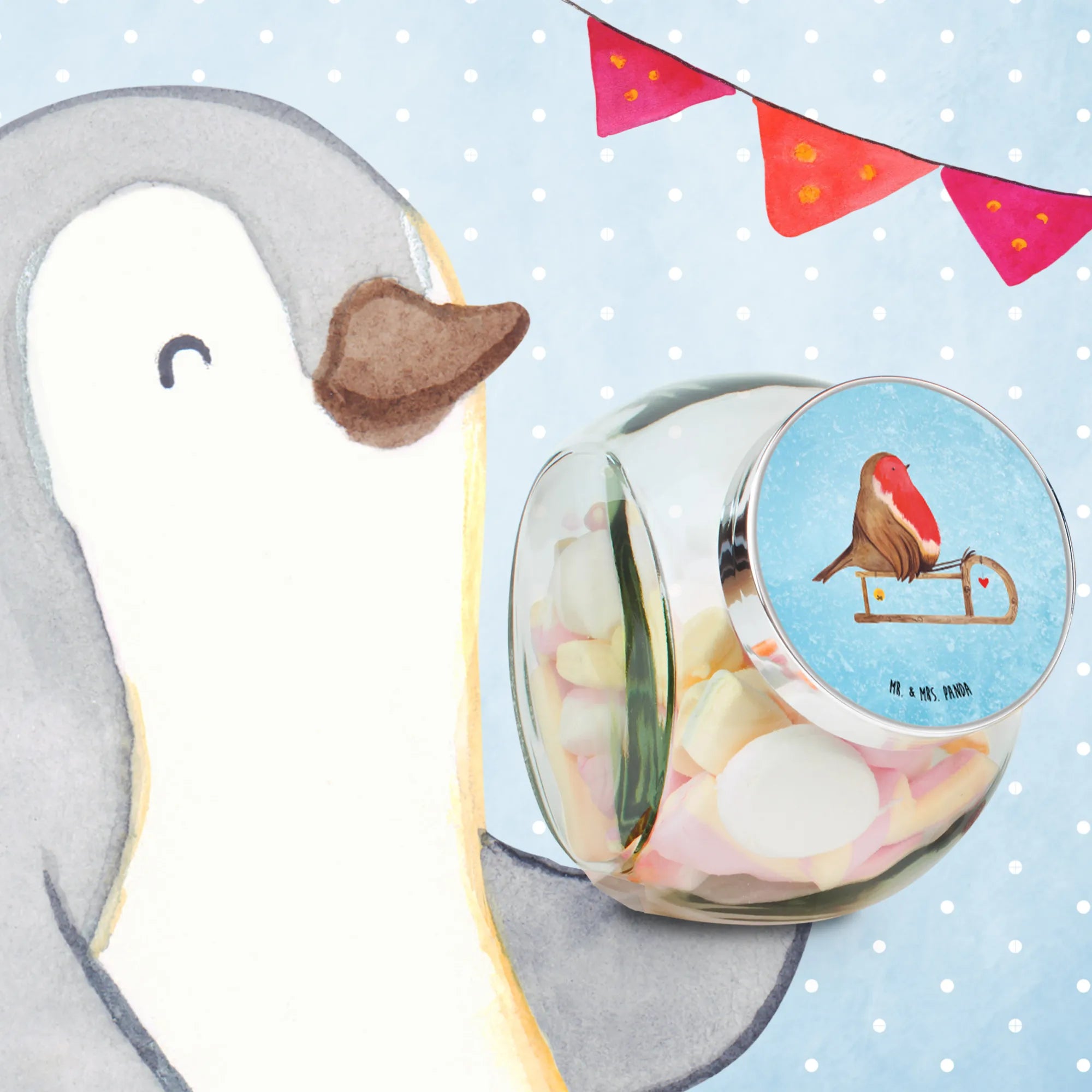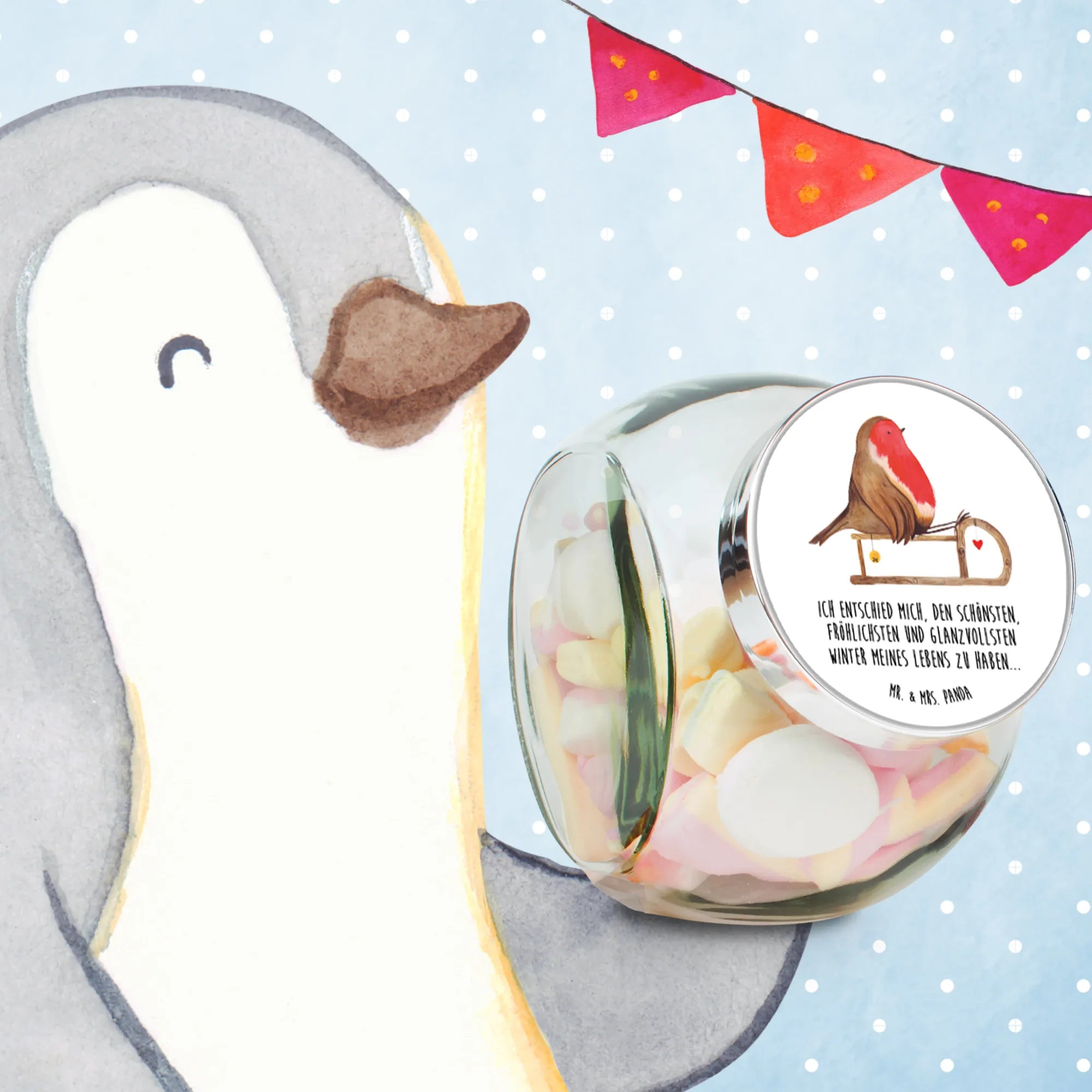 Das wunderschöne Bonbonglas mit dem niedlichen Rotkehlchen auf dem Schlitten aus der Winter Kollektion von Mr. & Mrs. Panda ist das perfekte Geschenk für die festliche Jahreszeit. Juhuu, die kalte Jahreszeit und Weihnachten stehen vor der Tür!