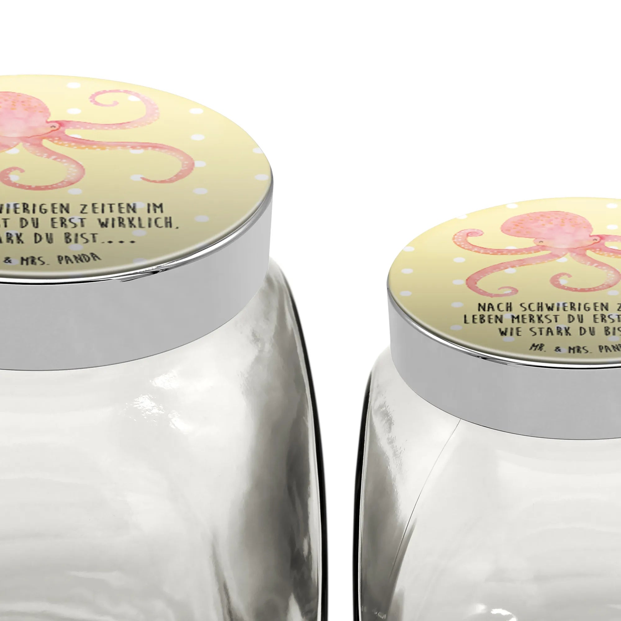Unser Bonbonglas Tintenfisch ist ein kleines Glücksobjekt für Deinen Alltag. Der rote Tintenfisch mit seinen vielen Armen winkt dir fröhlich entgegen, der pastellgelbe Hintergrund verbreitet Wärme und der zarte Spruch „Nach schwierigen Zeiten im Leben merkst du erst wirklich, wie stark du bist.…“ schenkt Mut und Zuversicht. Perfekt als Bonbonglas, Vorratsglas oder Keksdose Glas – ein Hingucker in jeder Küche.