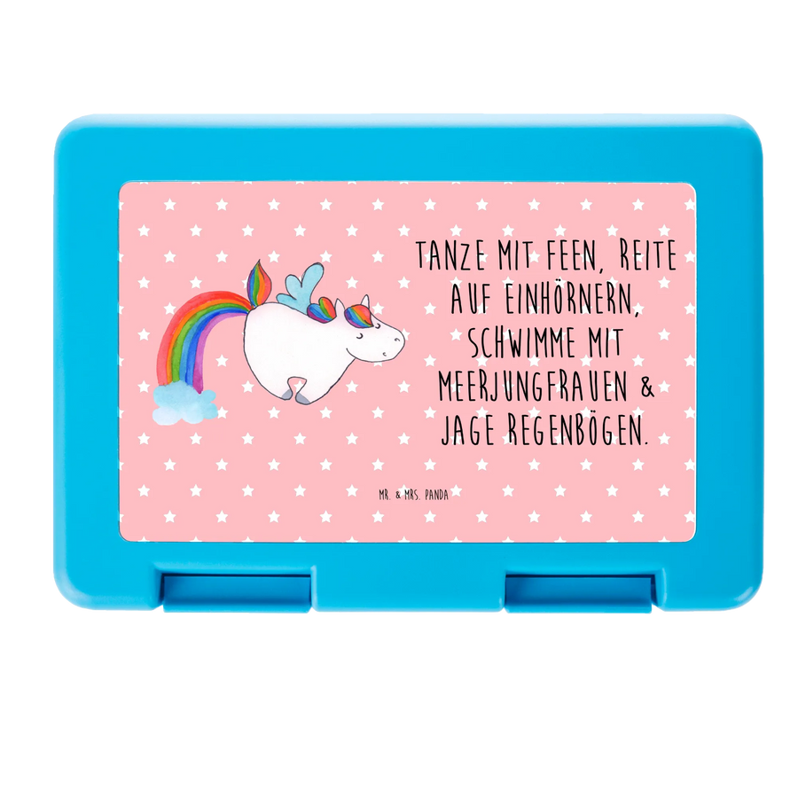 Das bezaubernde Einhorn-Motiv ist nicht nur ein Kunstwerk von Mrs. Panda, sondern auch eine Botschaft des Träumens und der Fantasie. Mit dem eingängigen Slogan "Tanze mit Feen, reite auf Einhörnern, schwimme mit Meerjungfrauen & jage Regenbögen" verzaubert die Brotdose Kinder und Erwachsene gleichermaßen.