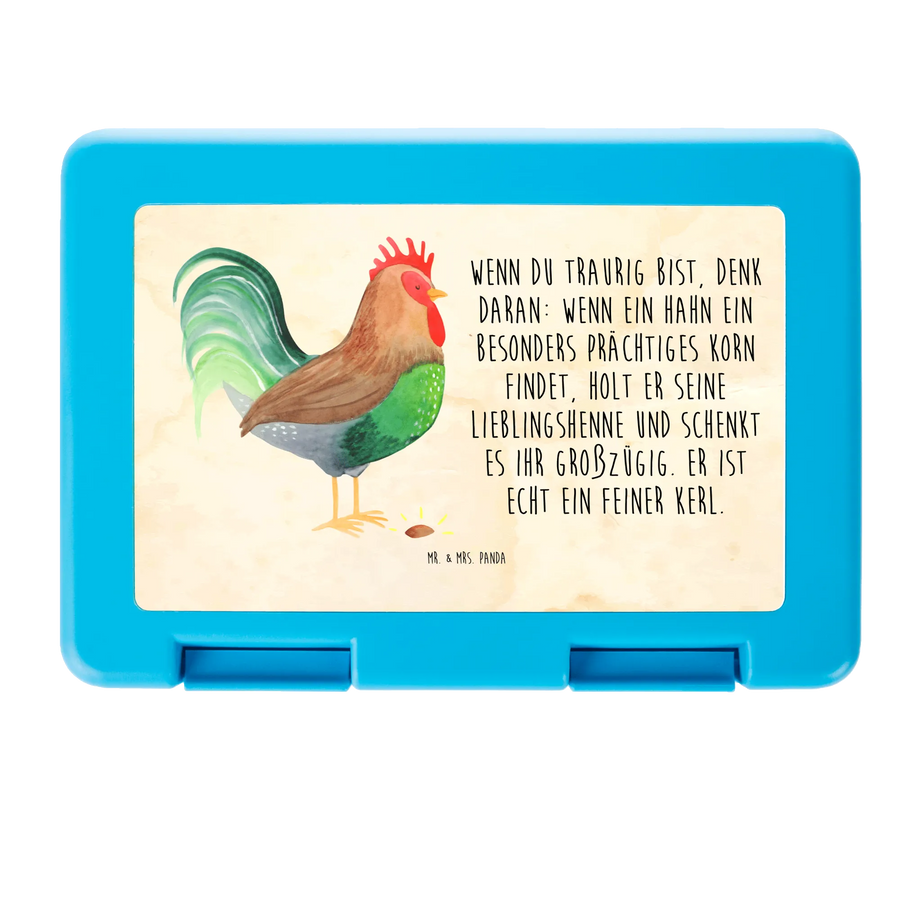 Jedes Mal, wenn dein Kind diese Brotdose öffnet, wird es nicht nur auf sein Mittagessen, sondern auch auf den fröhlichen, stolzen Hahn mit Korn blicken. Dieses hübsche Motiv wird mit einem liebevollen Slogan ergänzt, der nicht nur zum Schmunzeln anregt, sondern auch eine gute Laune verbreitet: "Wenn du traurig bist, denk daran: wenn ein Hahn ein besonders prächtiges Korn findet, holt er seine Lieblingshenne und schenkt es ihr großzügig. Er ist echt ein feiner Kerl."