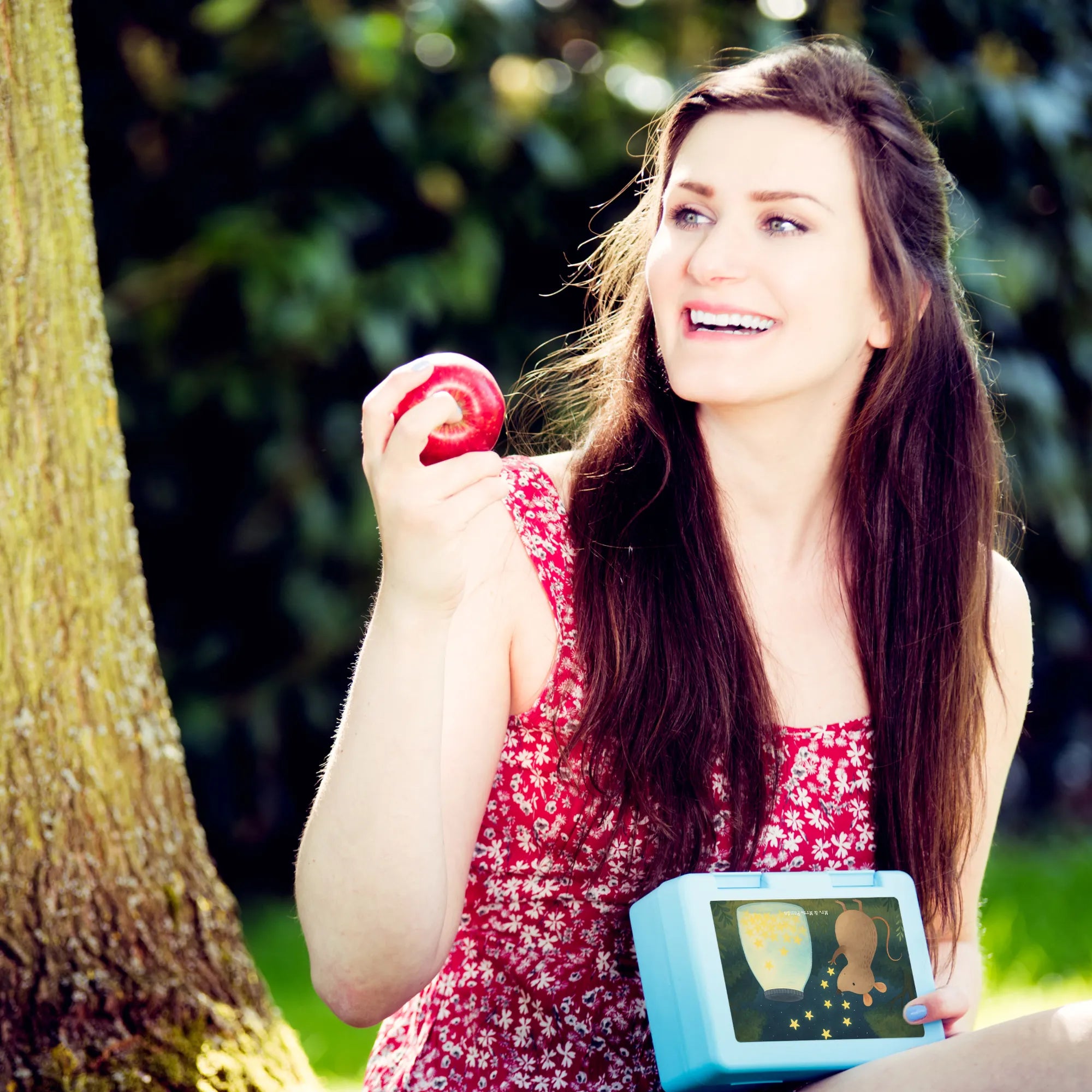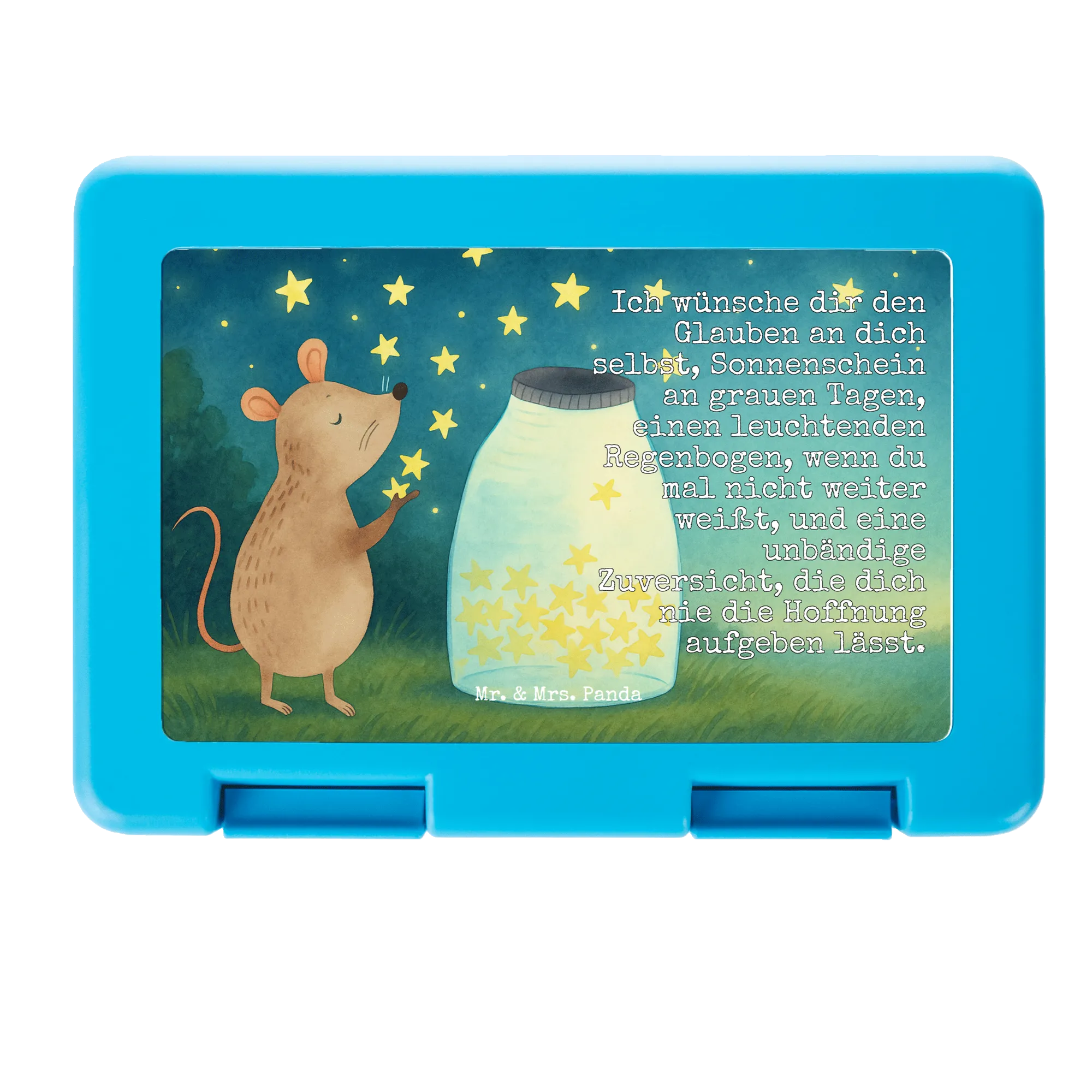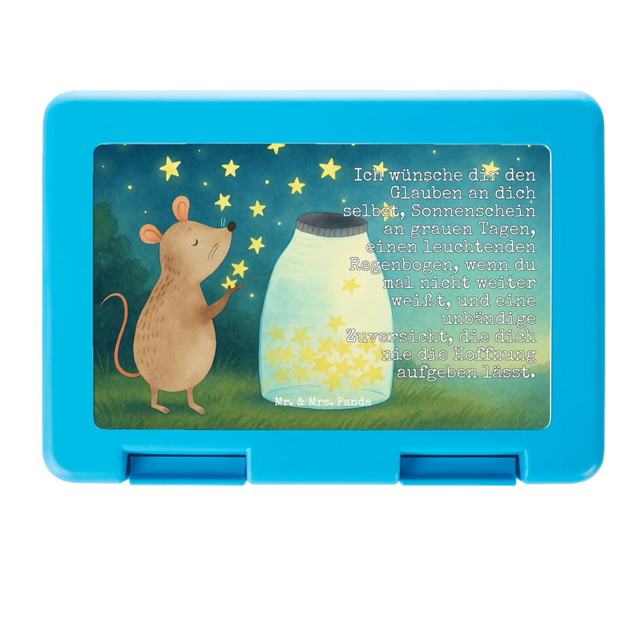 Diese Brotdose ist mehr als nur eine Lunchbox: Eine kleine Maus sitzt vor einem Glas voller funkelnder Sterne und lässt sie in den Himmel steigen. Das handgezeichnete Aquarellmotiv verzaubert und wird begleitet von einem liebevollen Wunsch: „Ich wünsche dir den Glauben an dich selbst, Sonnenschein an grauen Tagen, einen leuchtenden Regenbogen, wenn du mal nicht weiter weißt, und eine unbändige Zuversicht, die dich nie die Hoffnung aufgeben lässt.“ Dieses Design macht die Dose zu einem besonderen Begleiter für Kinder und Erwachsene gleichermaßen.