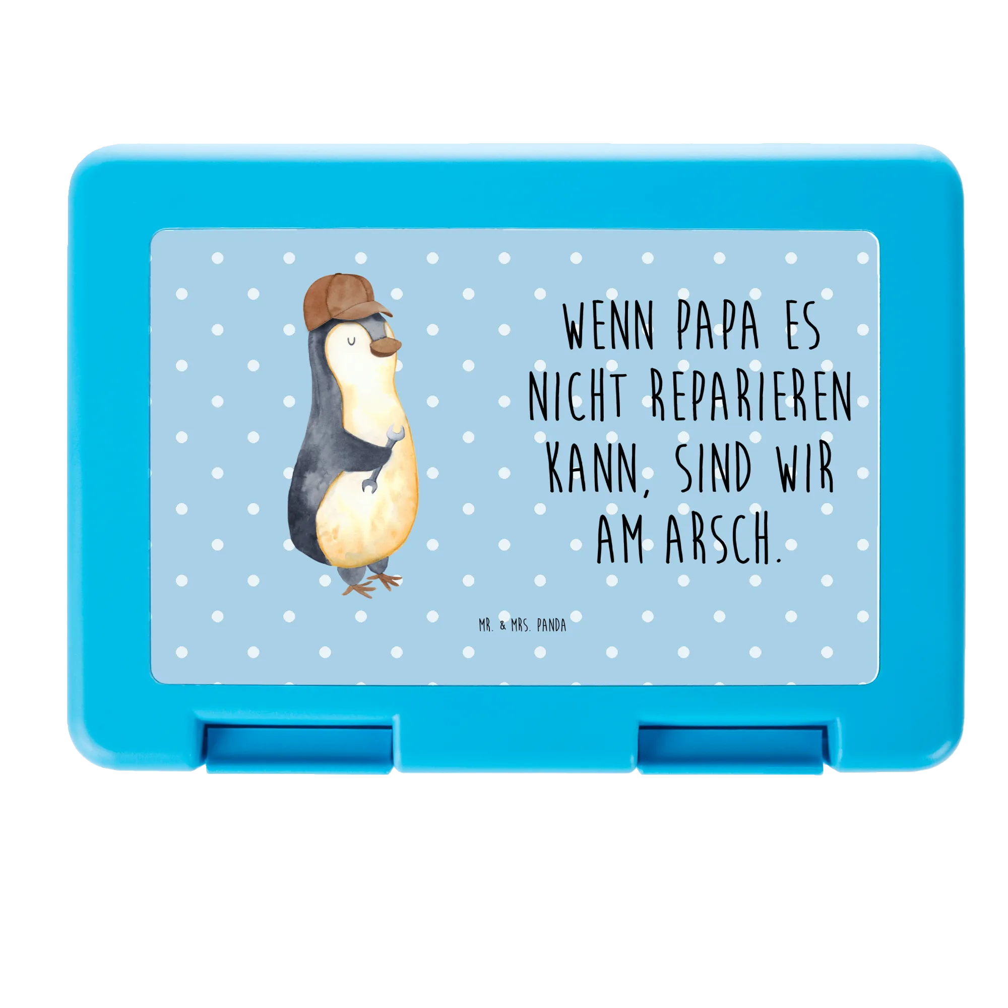 Diese Brotdose von Mr. & Mrs. Panda ist nicht nur praktisch, sondern auch ein Stück Familiengefühl. Mit dem frechen Spruch „Wenn Papa es nicht reparieren kann, sind wir am Arsch.“ und einem lässigen Pinguin mit Schraubenschlüssel wird jede Brotzeit zum Hingucker. Ideal als Brotdose, Lunchbox oder Brotbox für Schule, Büro und Picknick. 😊