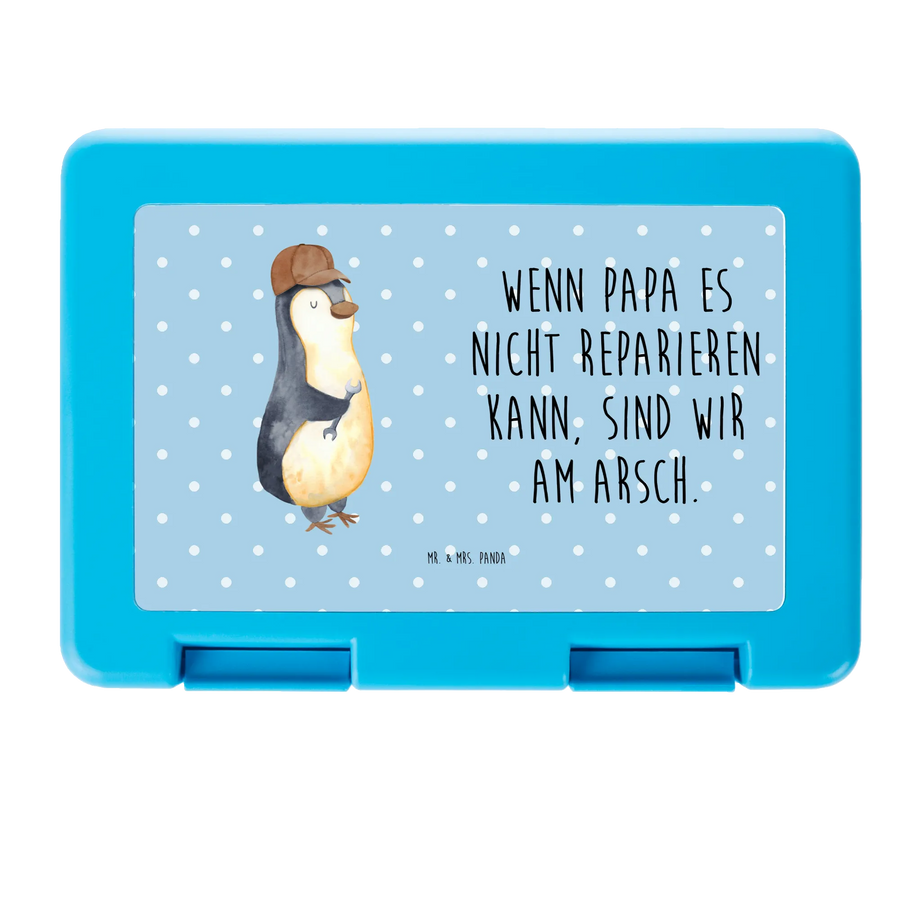 Diese fröhliche Brotdose verbindet Funktionalität mit ganz viel Familiengefühl. Auf pastellblauem Untergrund präsentiert sich ein sympathischer Pinguin mit brauner Kappe und einem Schraubenschlüssel in der Flosse – begleitet von dem witzigen Spruch, der besonders gut als Geschenk zum Vatertag, für Papa oder als liebevolle Überraschung innerhalb der Familie passt.